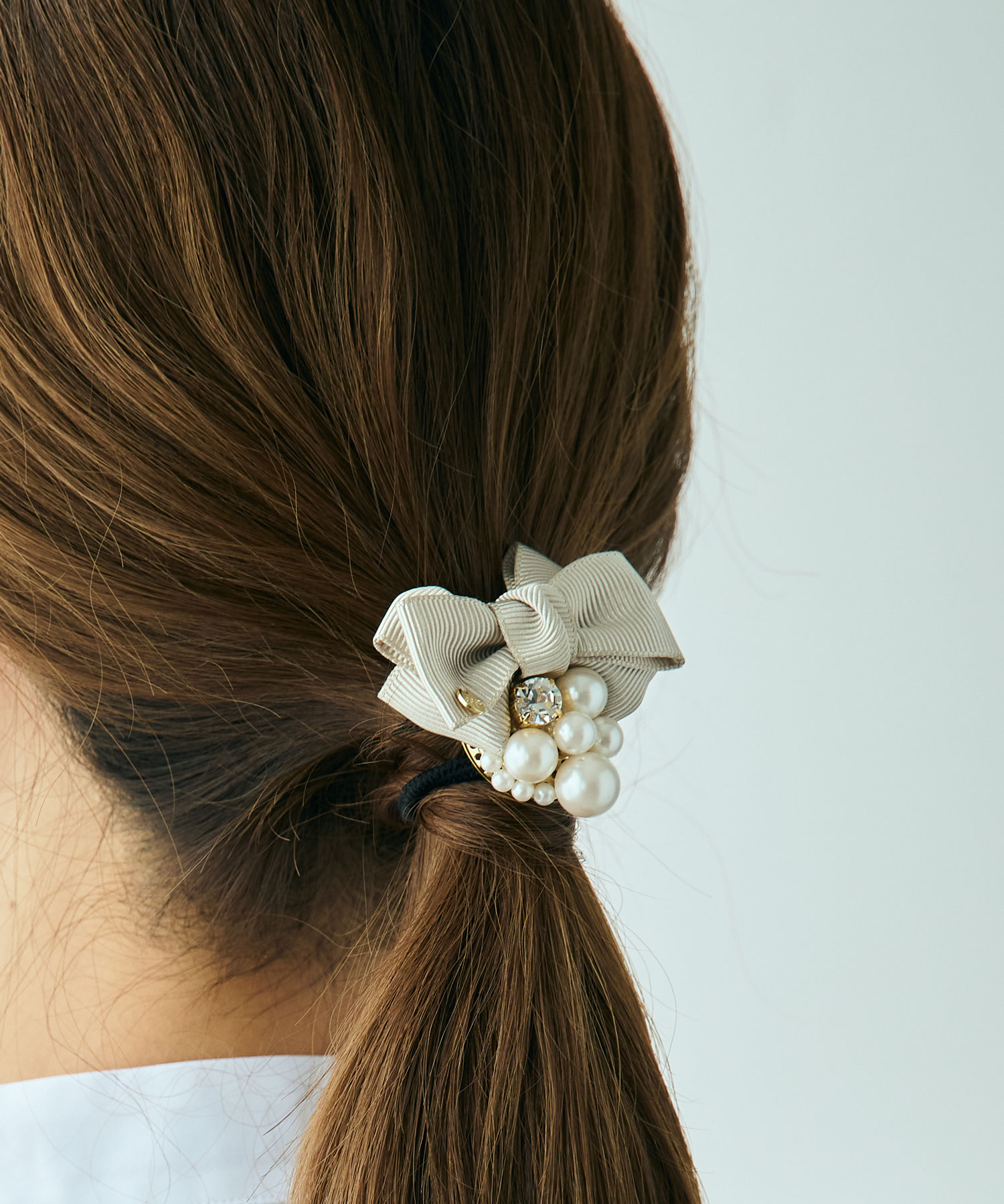 グログランリボンの上品な光沢と、パール、ビジューの組み合わせが華やかなヘアゴム。パールとビジューが光を受けて煌めき、ヘアスタイルを華やかにしてくれます。華やかな場はもちろん、普段使いでもコーディネートを上品に格上げしてくれるアイテムです。