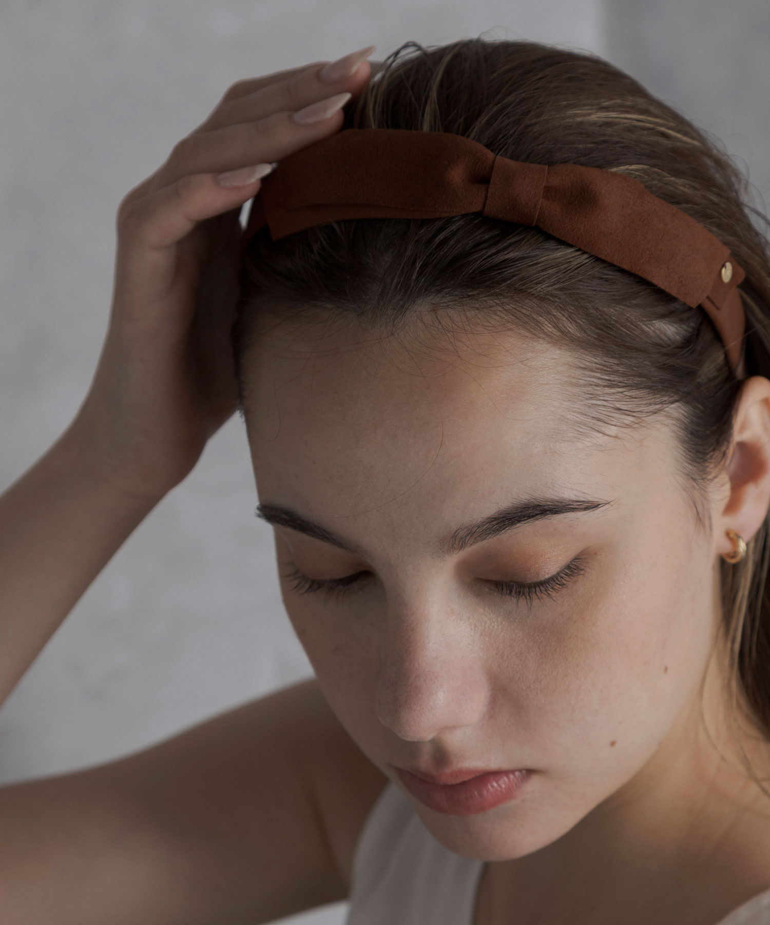 スウェード調のリボンがシックで上品なカチューシャ。温かみのあるスエード調素材で作られたリボンは、甘すぎず、洗練された大人の可愛らしさを演出します。裏面にはグログランリボンを使用し、細部までこだわりを感じるデザインです。