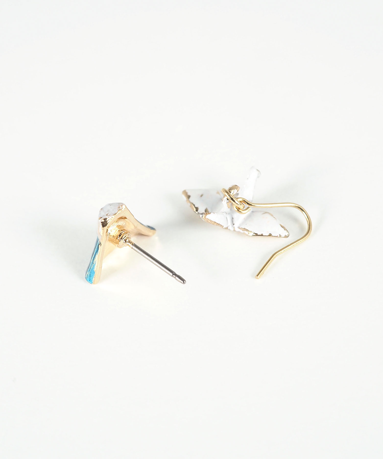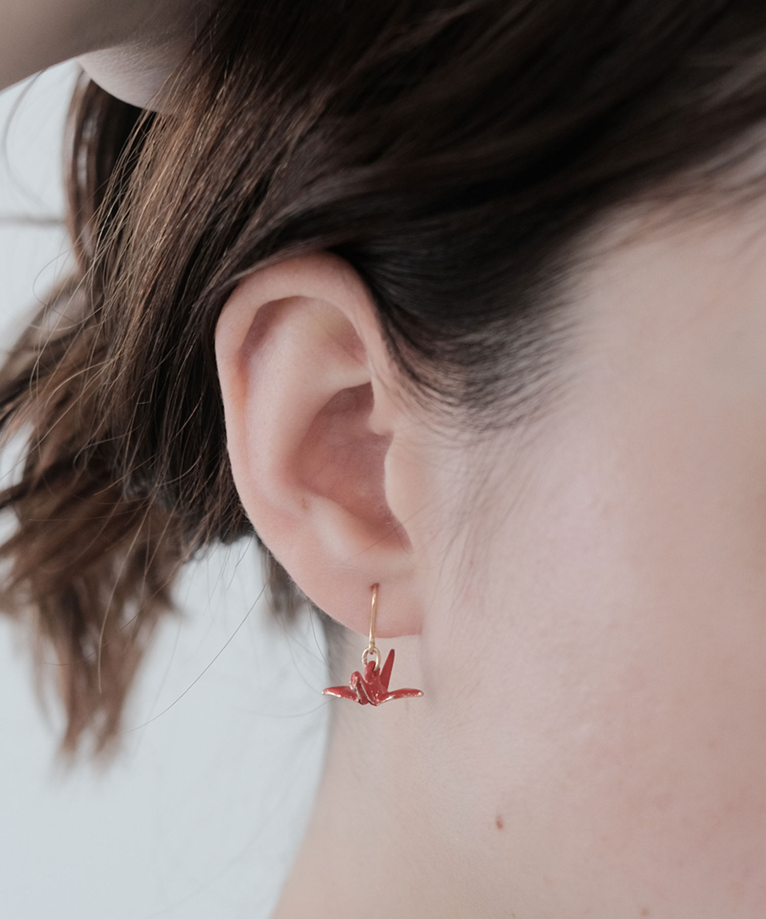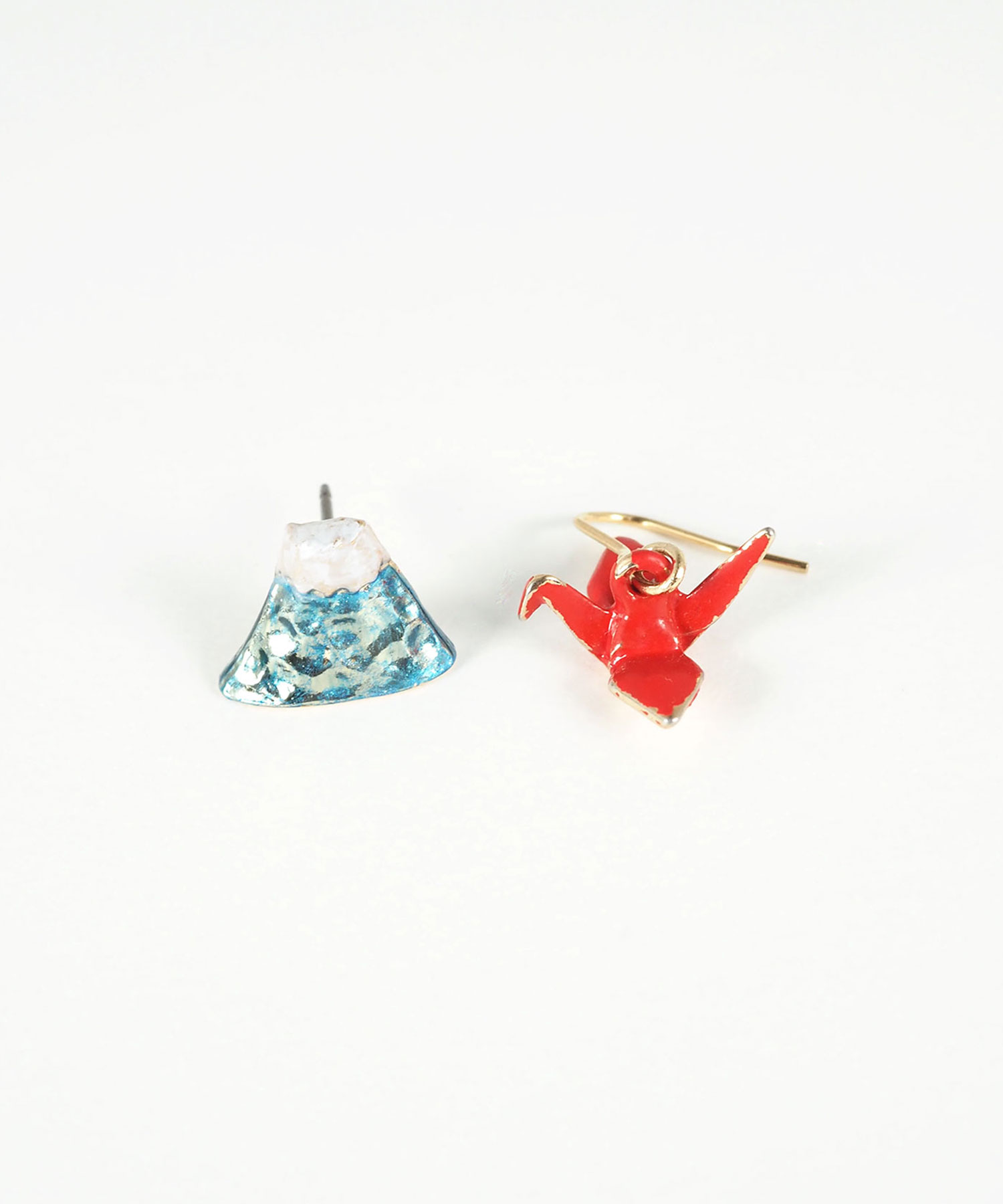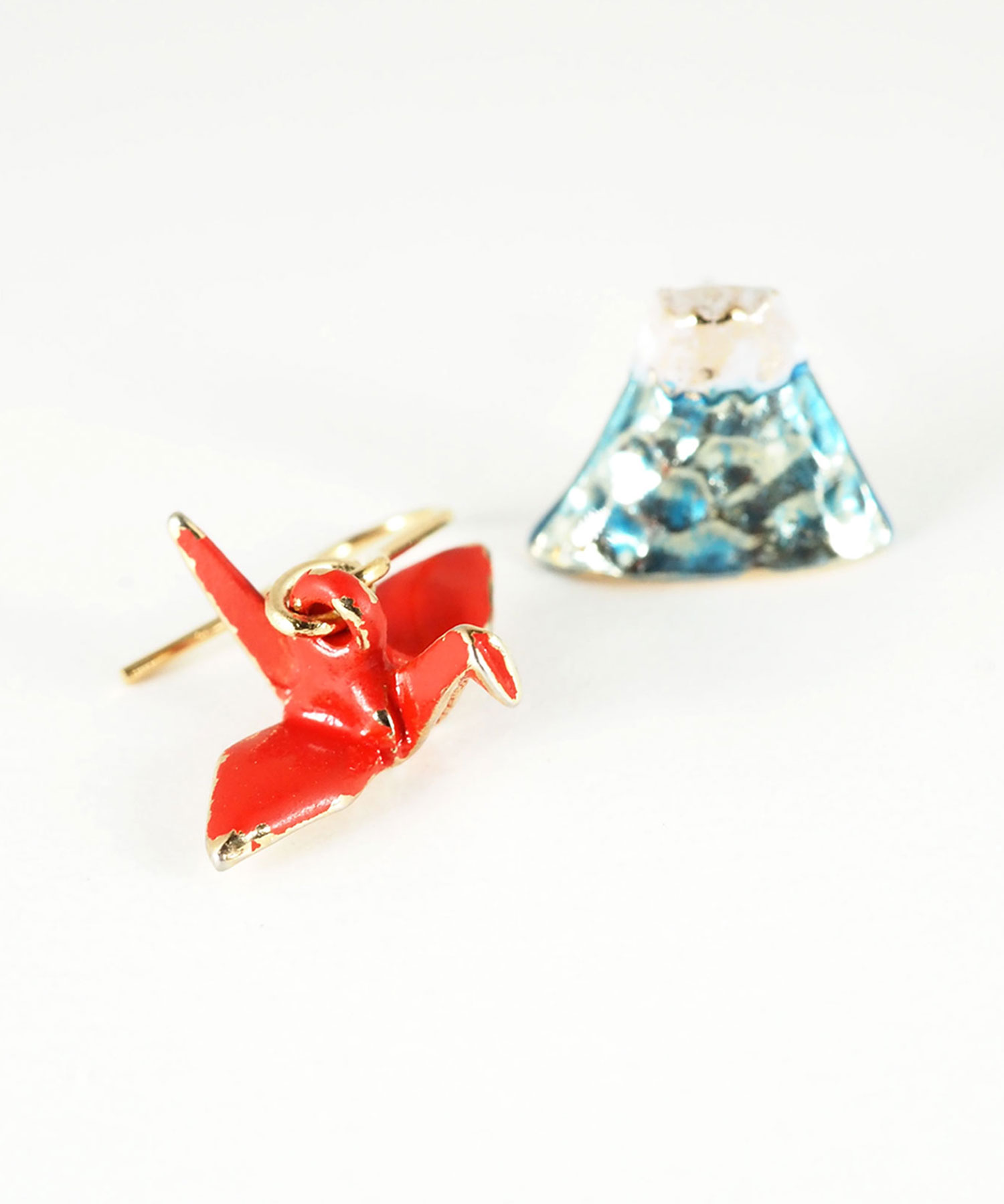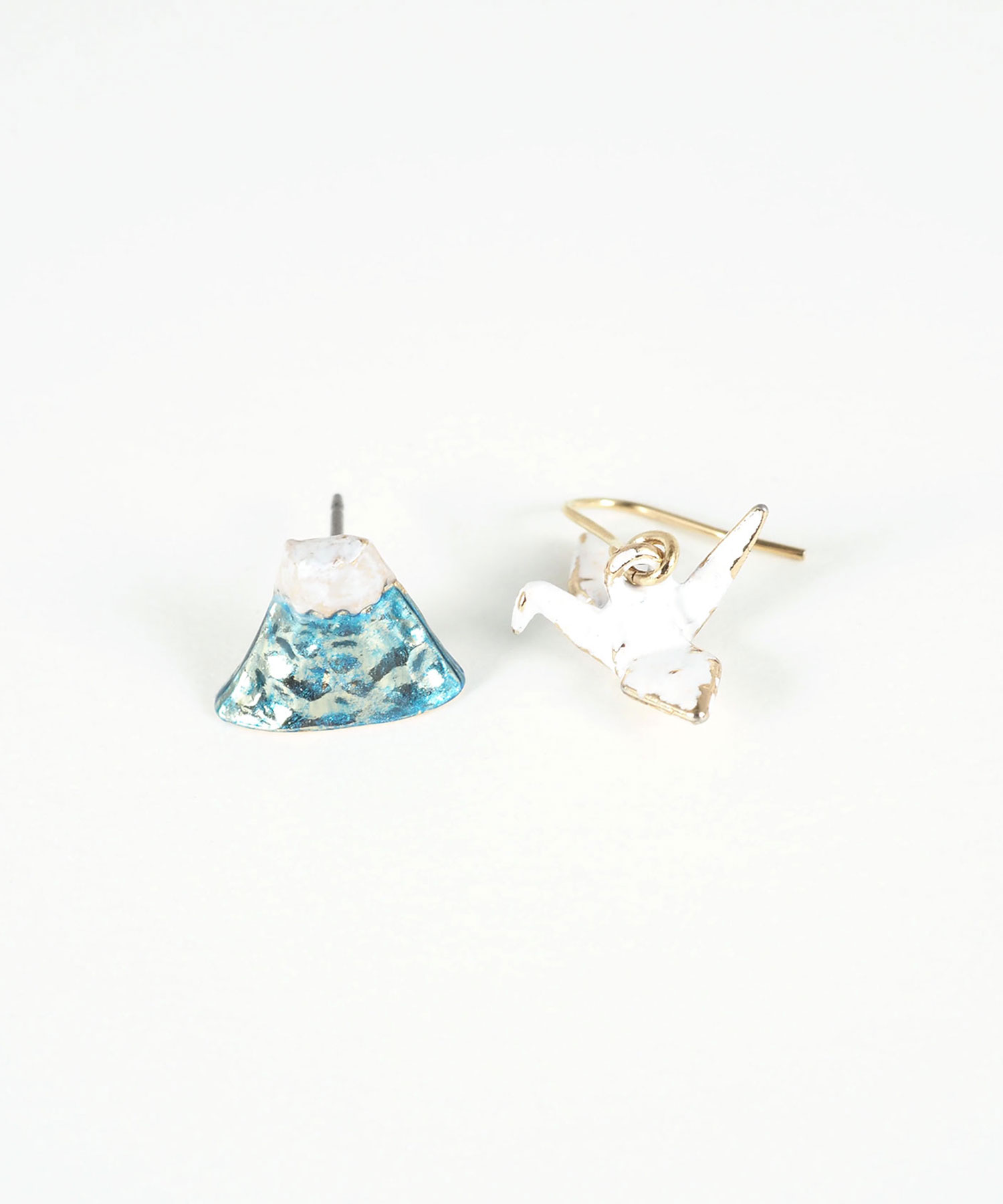 片耳に富士山、もう片耳に優美な鶴を配した縁起の良いアシンメトリーデザイン。富士は末広がりで永続的な繁栄を、鶴は長寿を象徴し良き未来を運ぶ素敵な願いを込めた和のモチーフ。日本の美意識が詰まった、モダンで上品な耳飾り。ご自身のお守りとして、また大切な方へ願いを込めた贈り物として最適です。