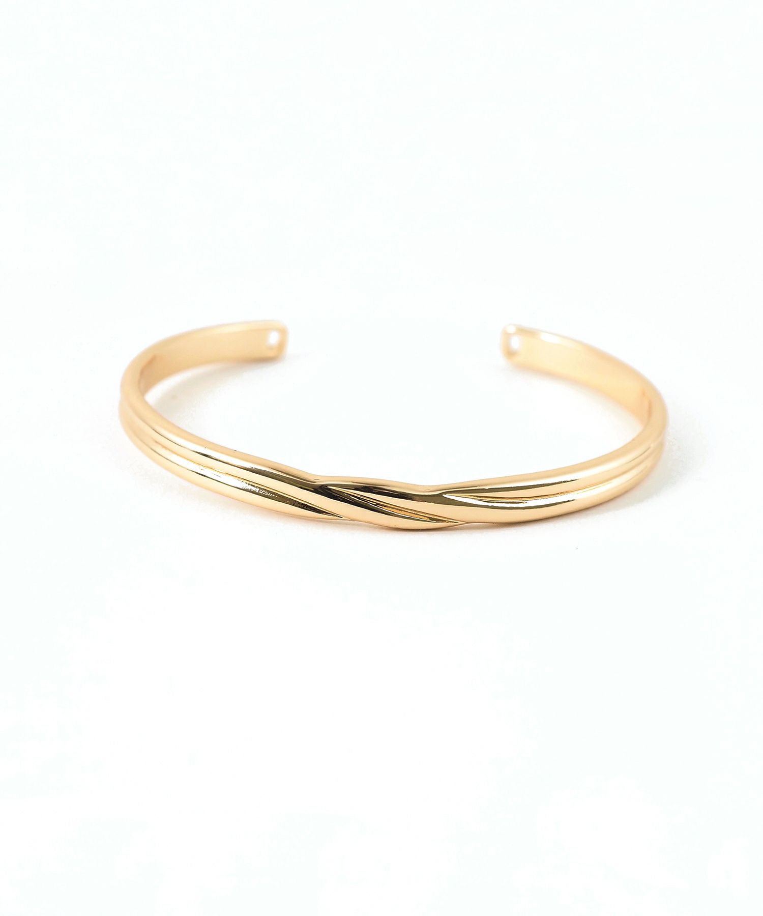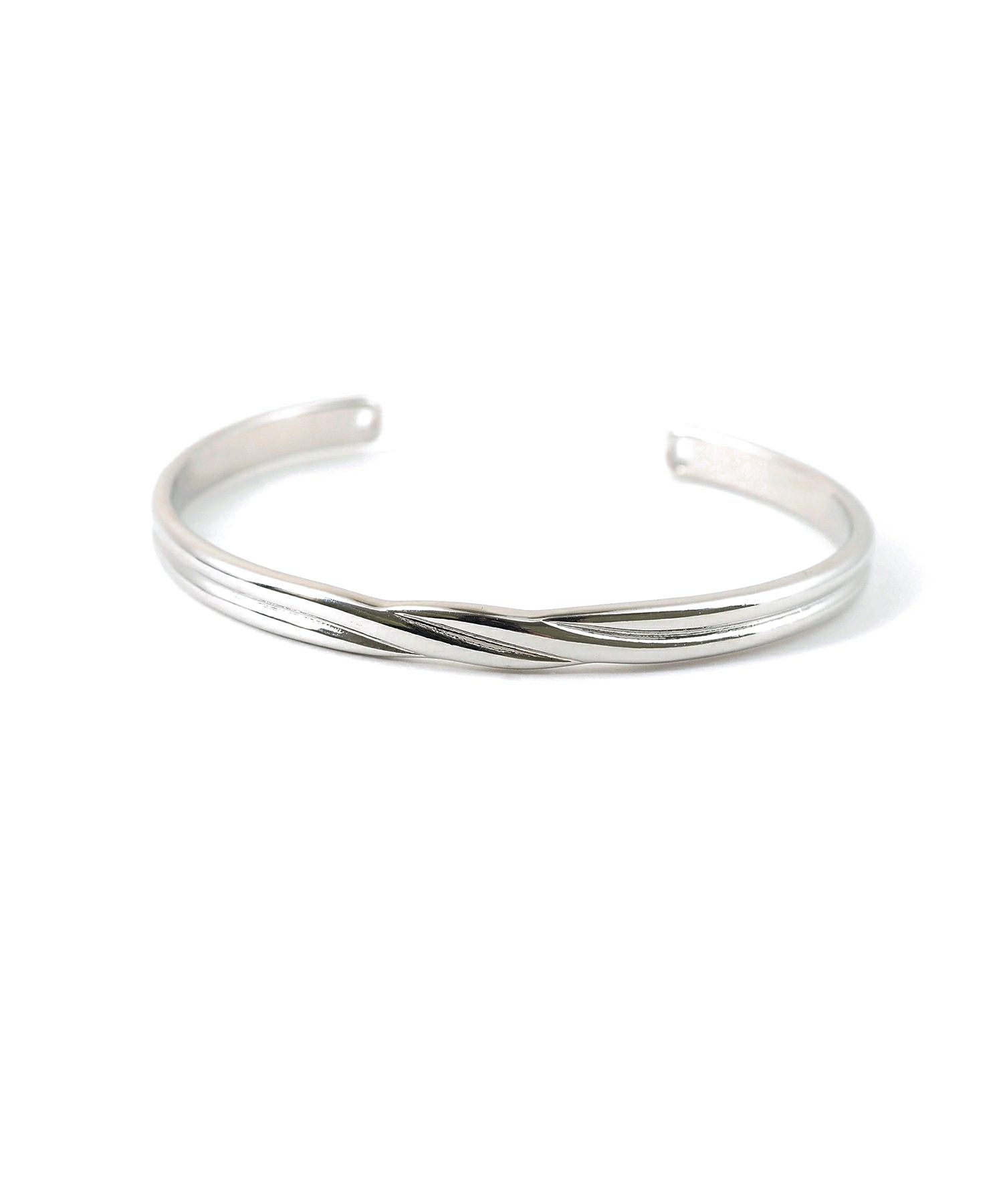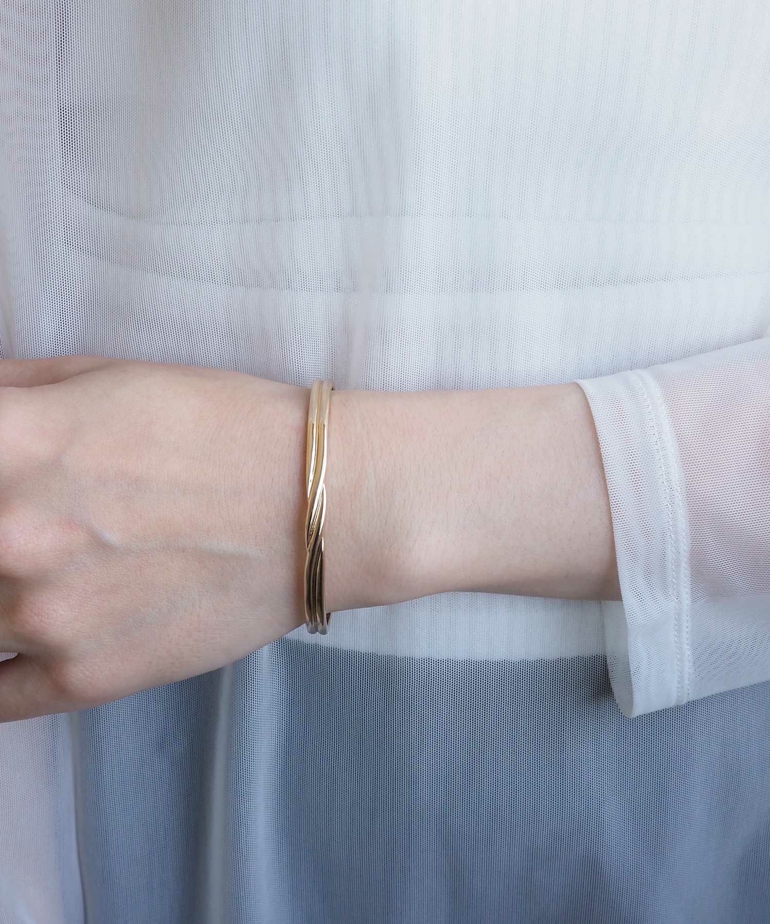 立体感のある2本のラインが交差したデザインのメタルバングル。シンプルなストレートシルエットにデザインが効いた、使いやすいボリューム感のアイテムです。
