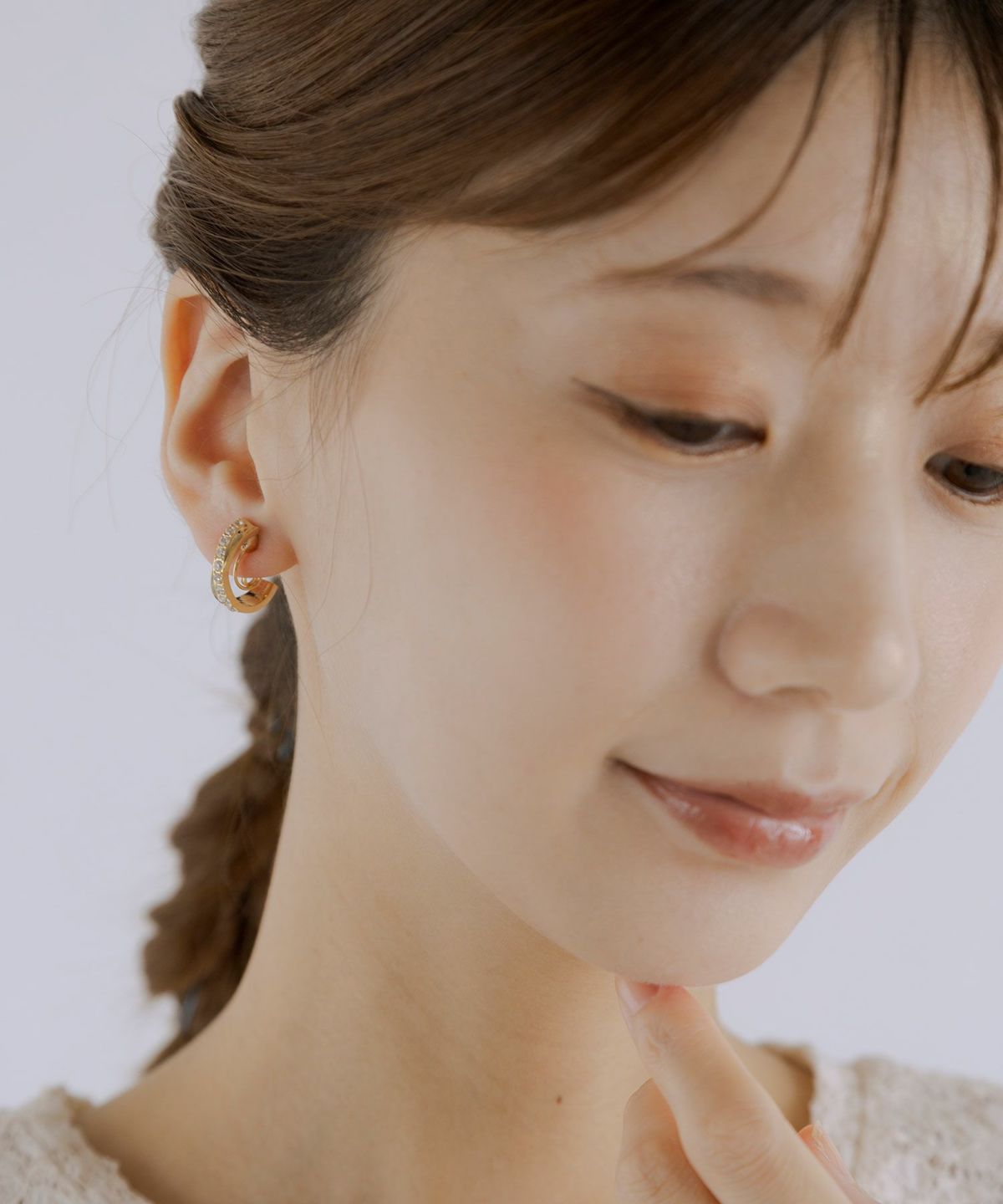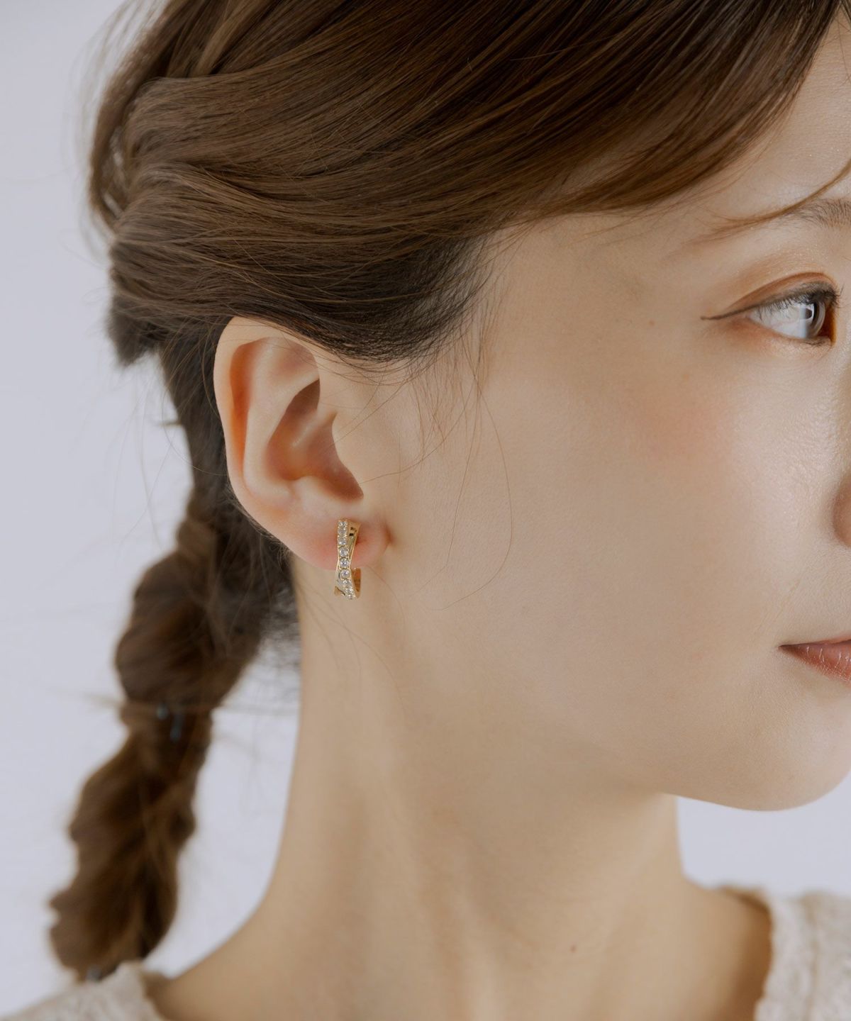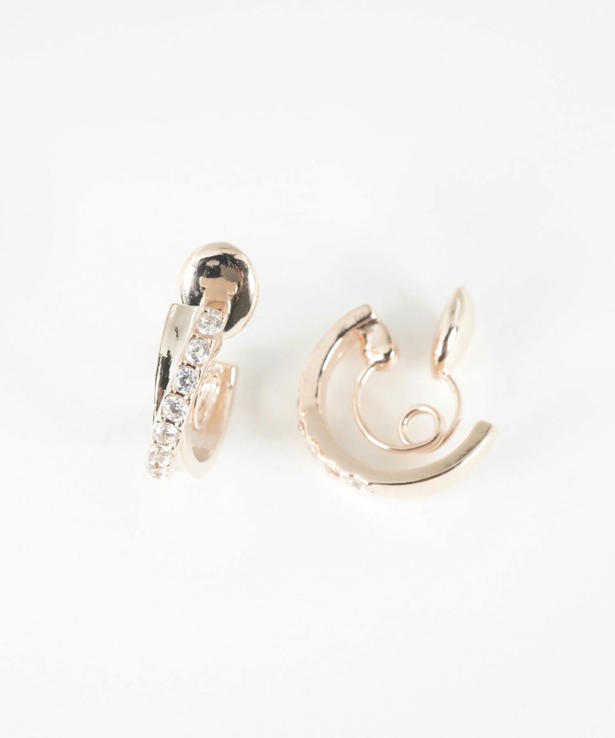 優美なラインが交差するデザインに、繊細なラインストーンを敷き詰めた、エレガントなループフィットイヤリング。デイリーはもちろん、パーティーシーンでも華やかさをプラスするデザインです。耳に優しくフィットするループフィット機能はそのままに、少し大きめで存在感のあるデザインに仕上げたグランループフィットイヤリングです。イヤリングパーツが目立たずピアスみたいな見ためも魅力。