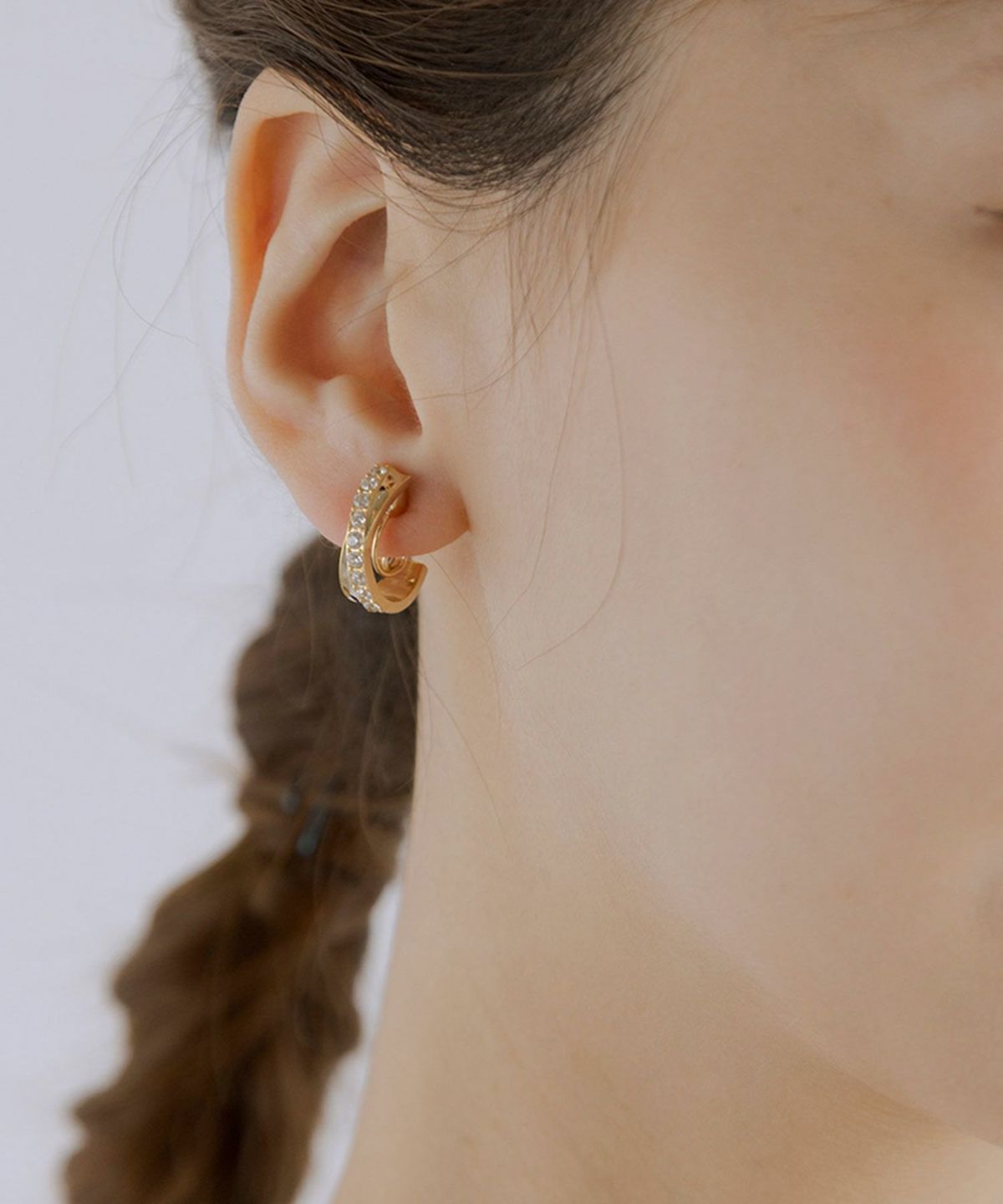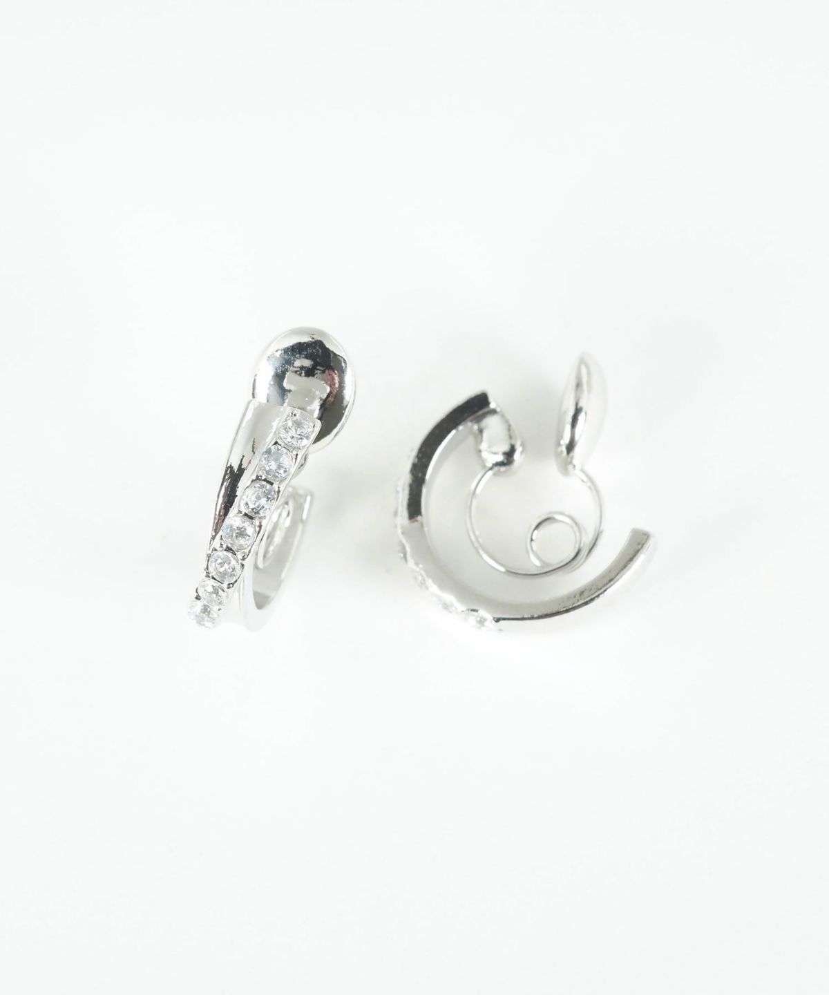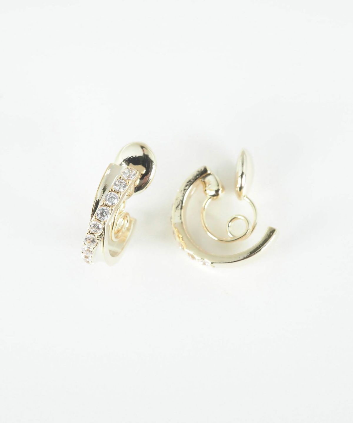 優美なラインが交差するデザインに、繊細なラインストーンを敷き詰めた、エレガントなループフィットイヤリング。デイリーはもちろん、パーティーシーンでも華やかさをプラスするデザインです。耳に優しくフィットするループフィット機能はそのままに、少し大きめで存在感のあるデザインに仕上げたグランループフィットイヤリングです。イヤリングパーツが目立たずピアスみたいな見ためも魅力。