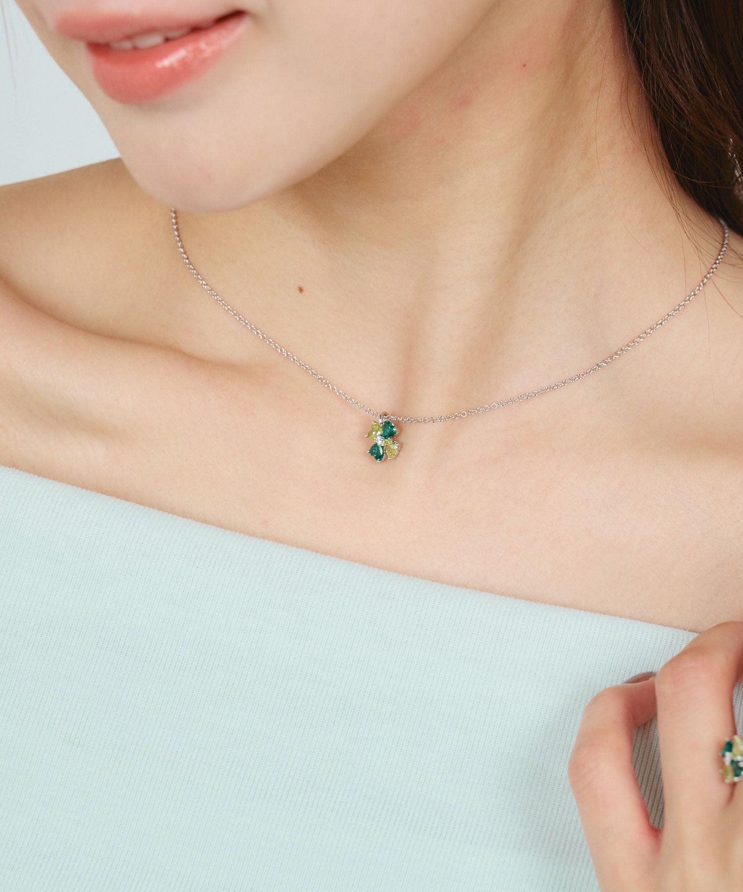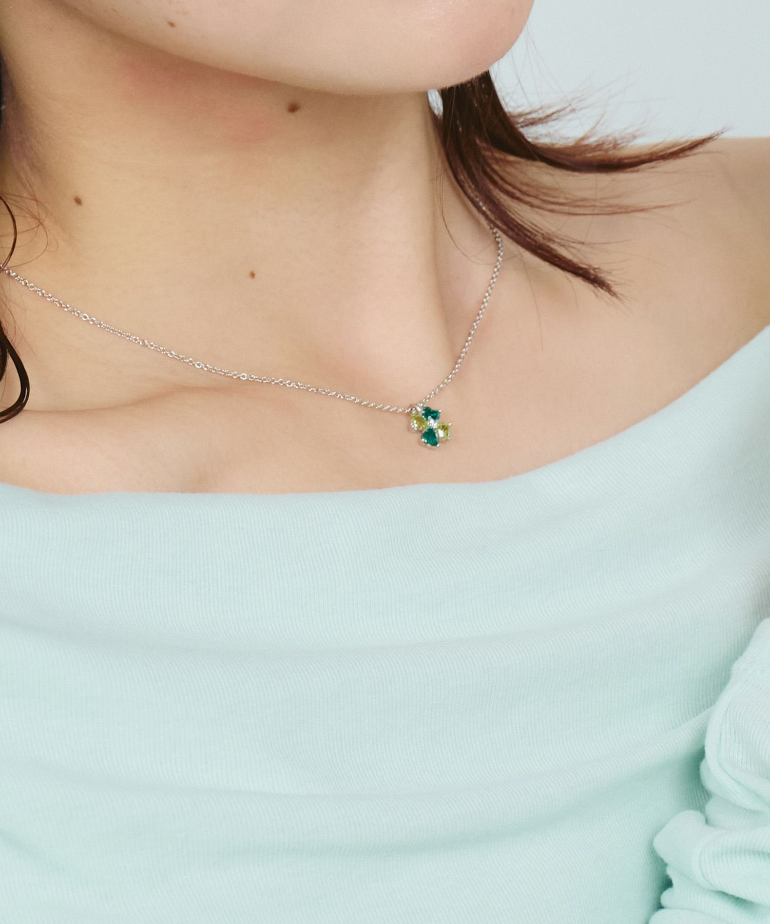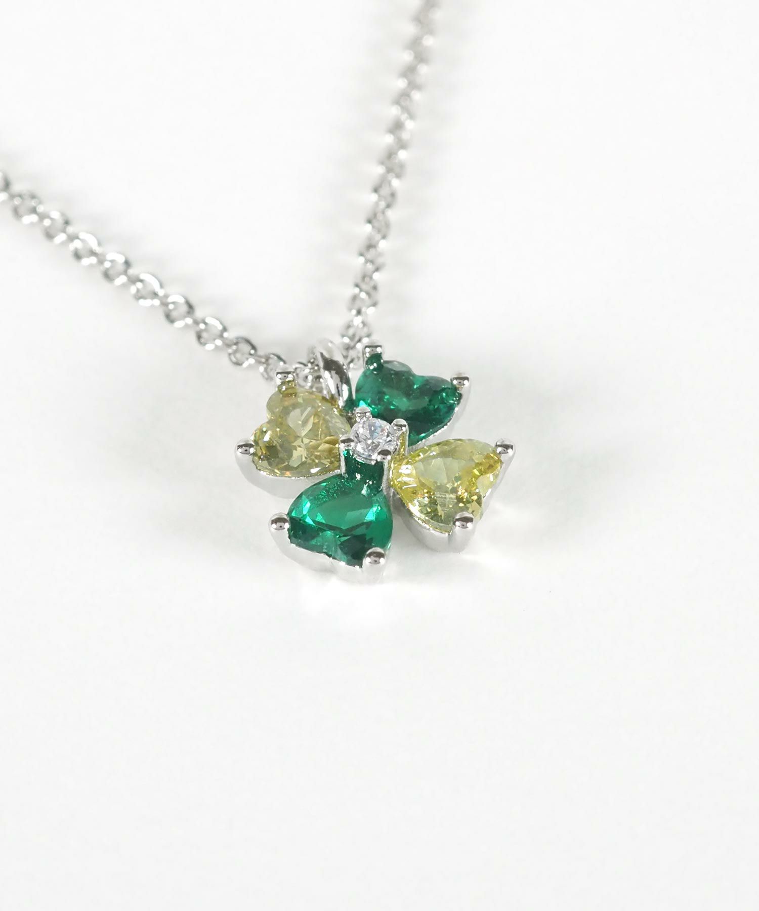 ビジューの四つ葉が目を惹く可愛らしいペンダント。幸せを招くクローバーが首元できらきらと輝き、気分を華やかに彩ります。