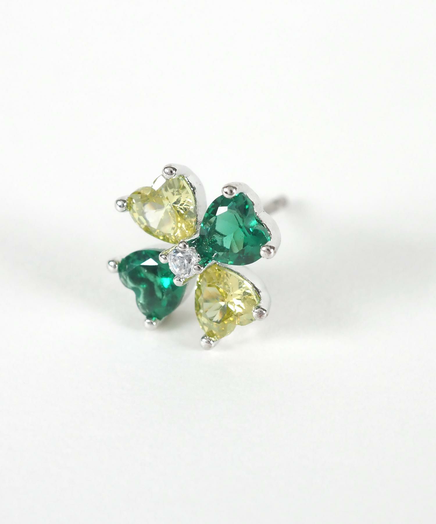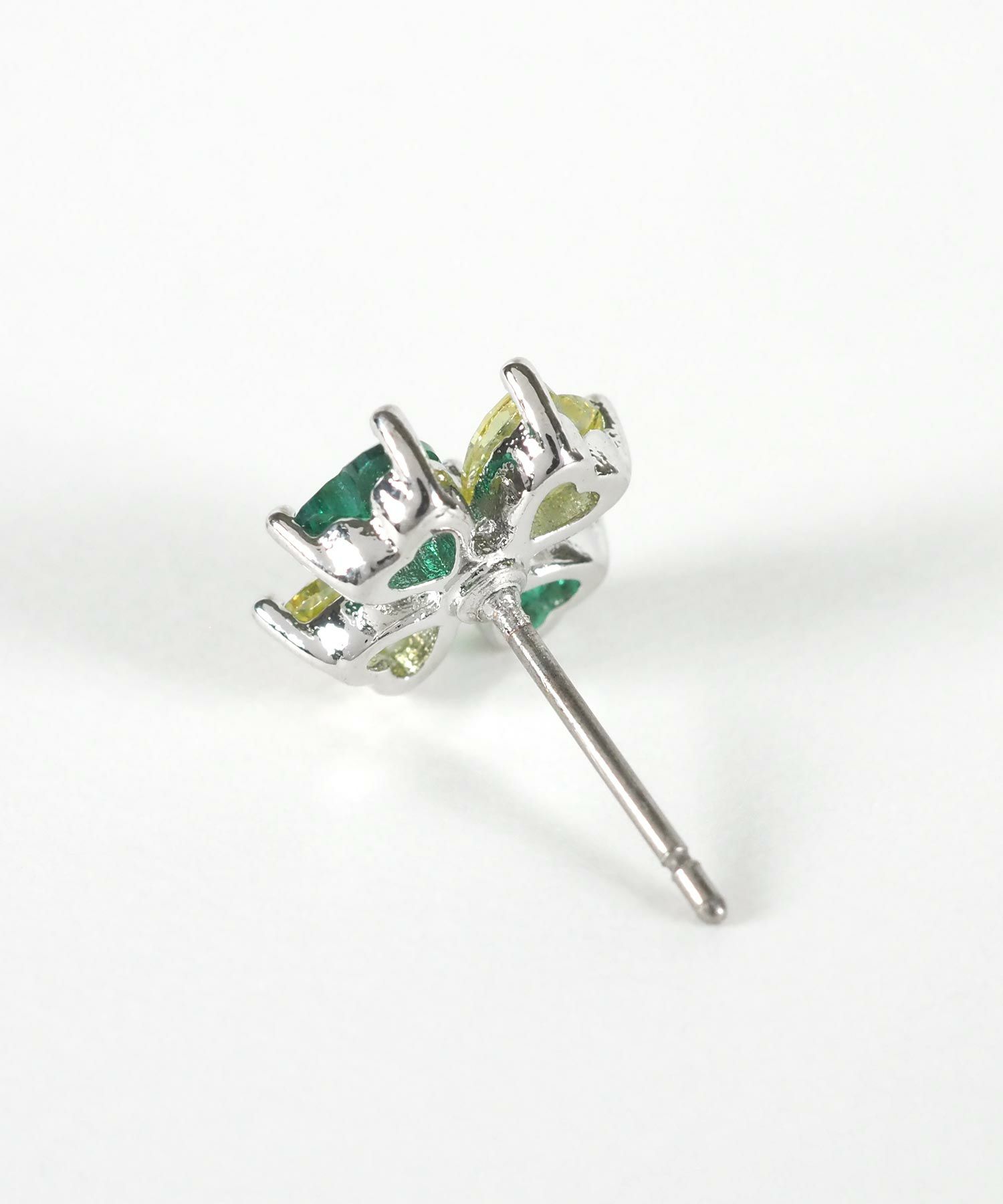 ビジューの四つ葉が目を惹く可愛らしいチタンポストピアス。幸せを招くクローバーが耳元できらきらと輝き、気分を華やかに彩ります。ペアピアス(両耳用)です。