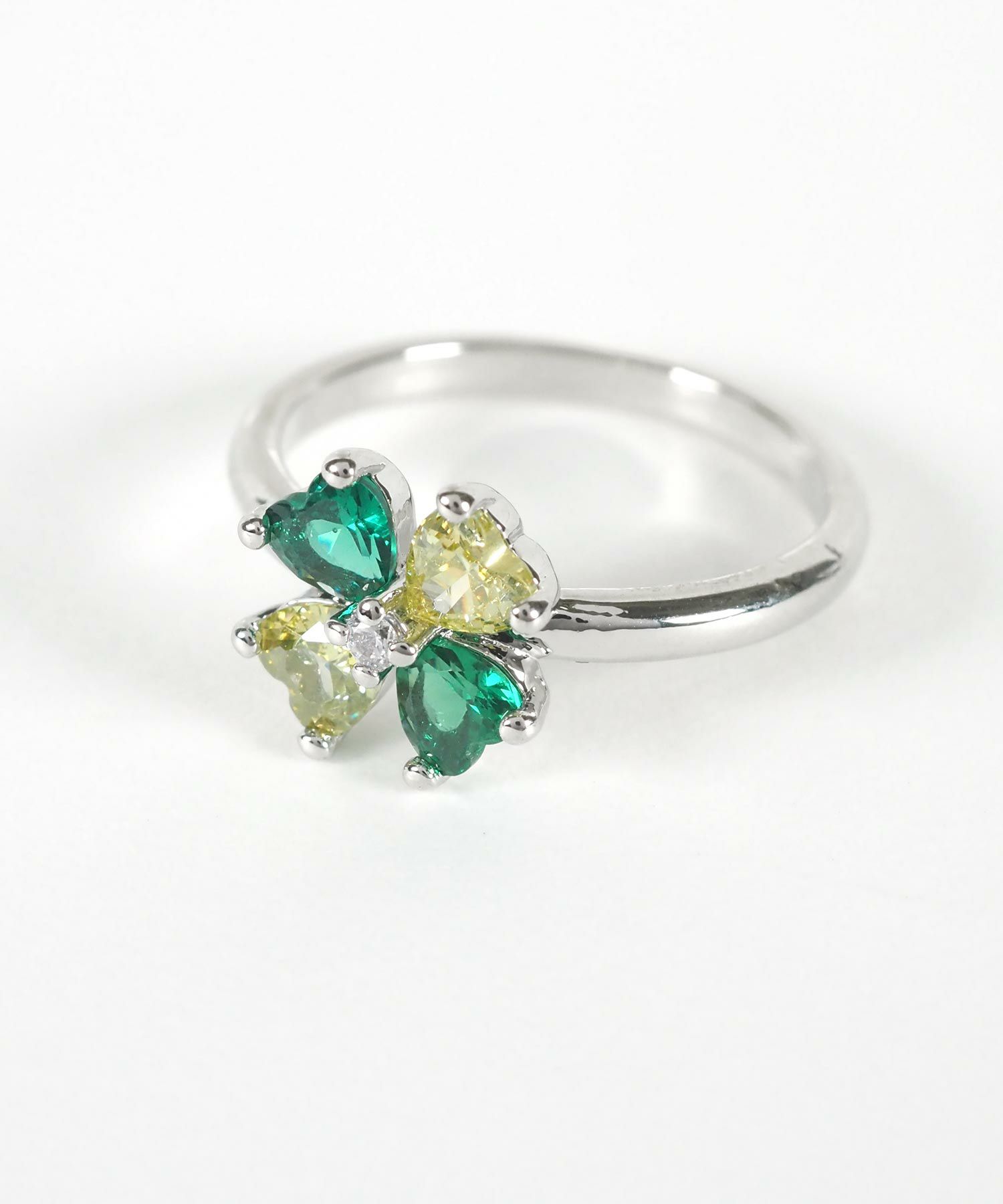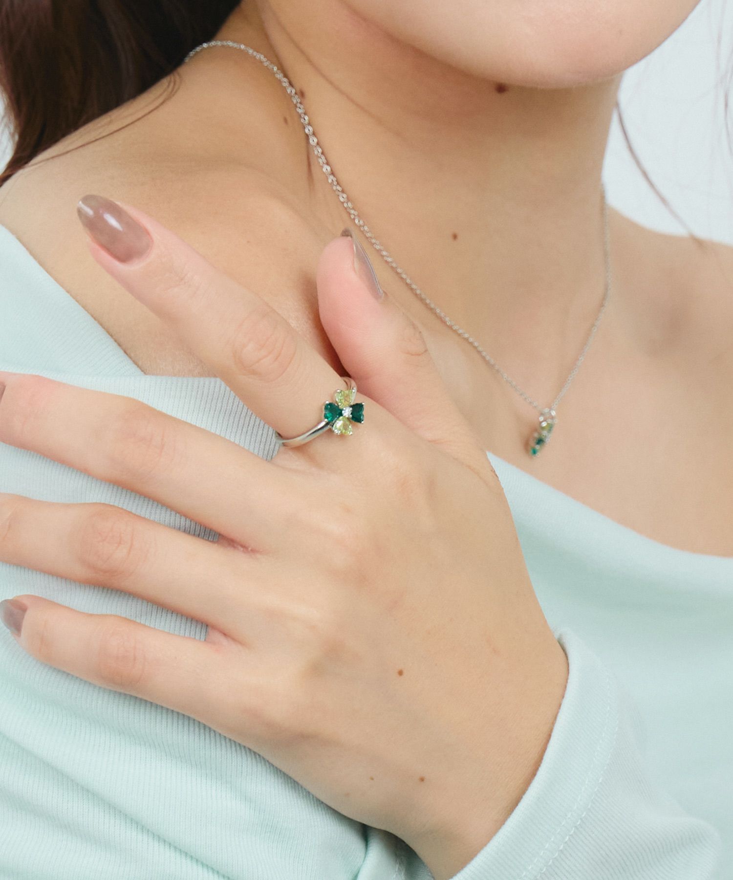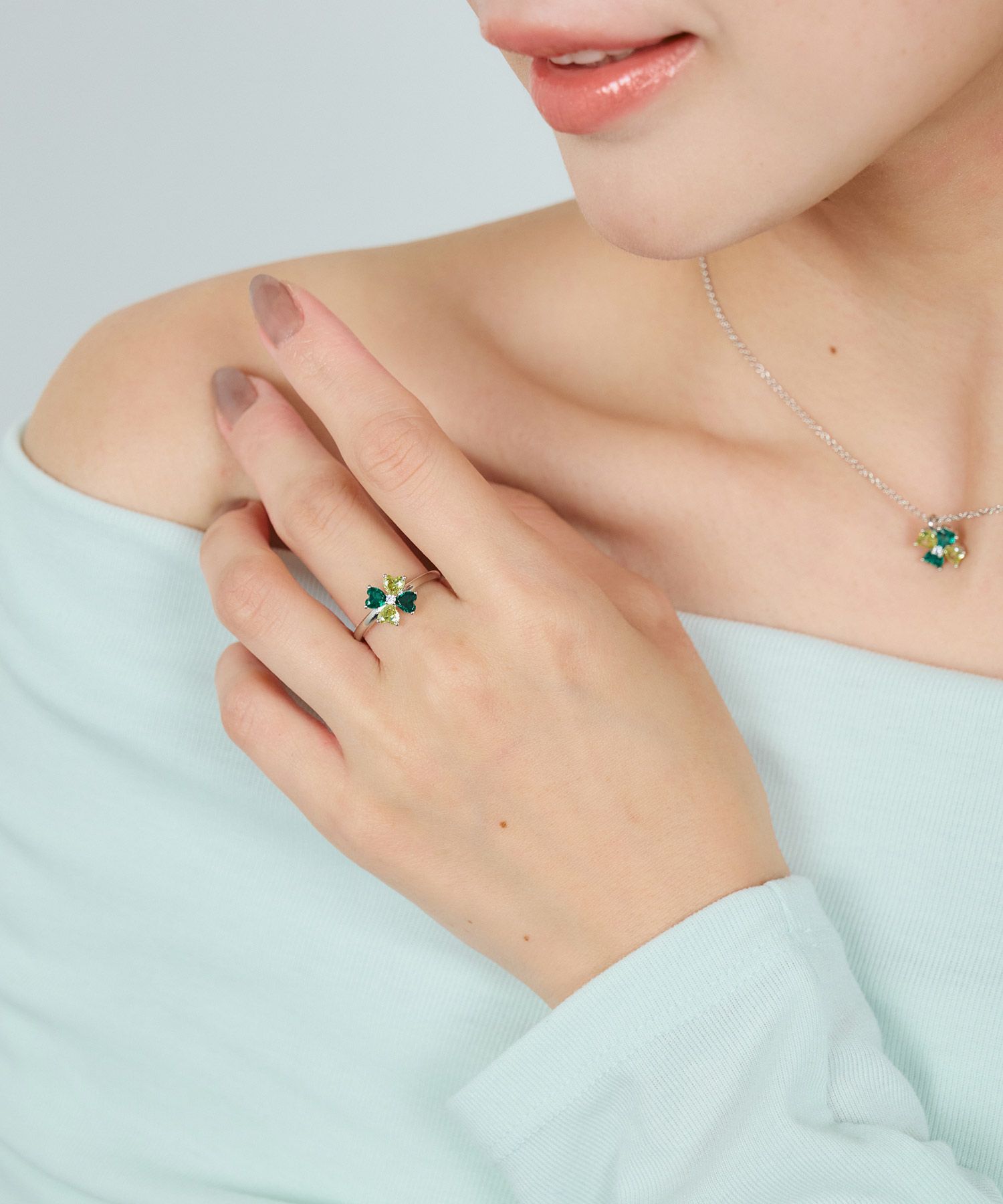 ビジューの四つ葉が目を惹く可愛らしいリング。幸せを招くクローバーが指元できらきらと輝き、気分を華やかに彩ります。