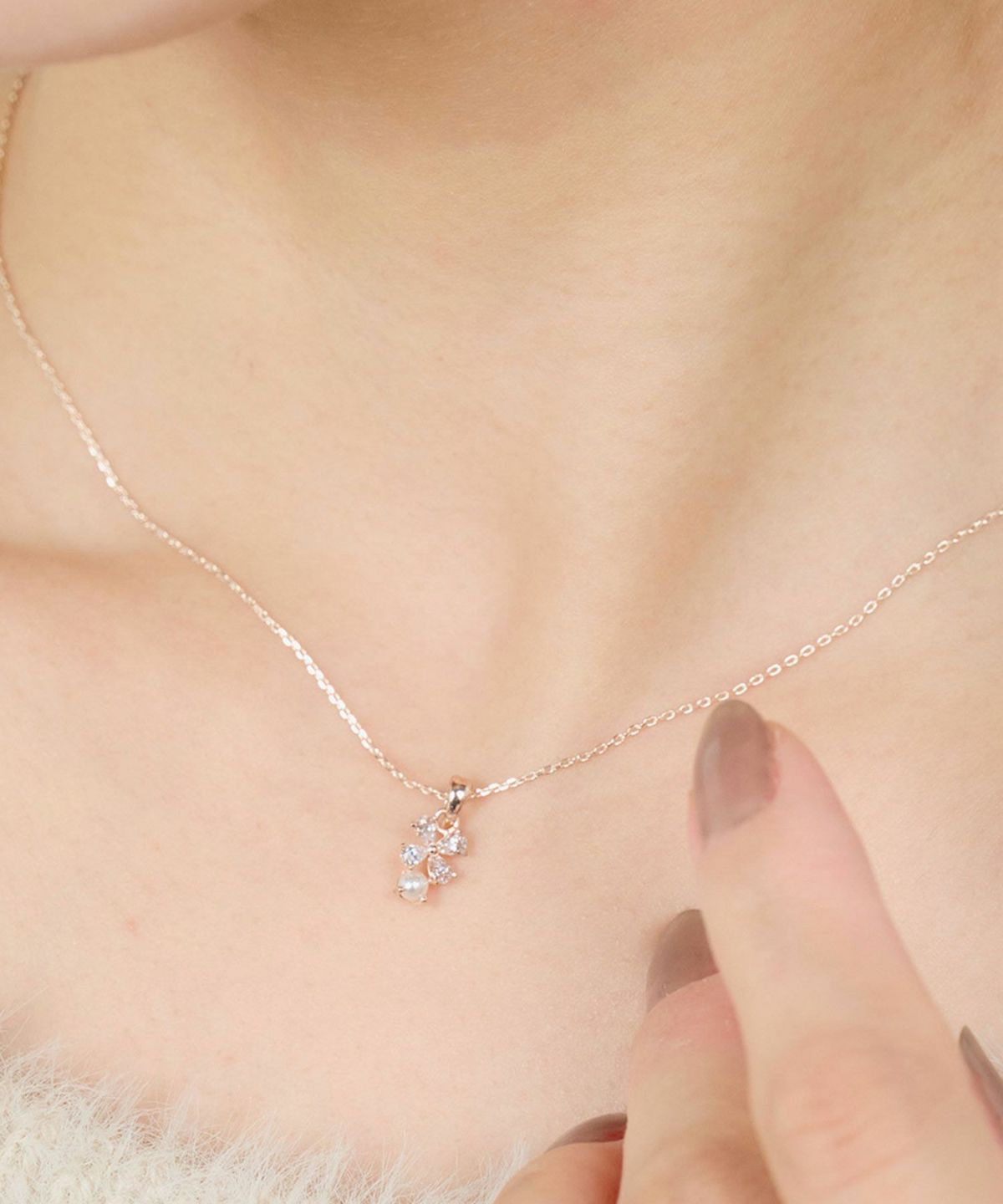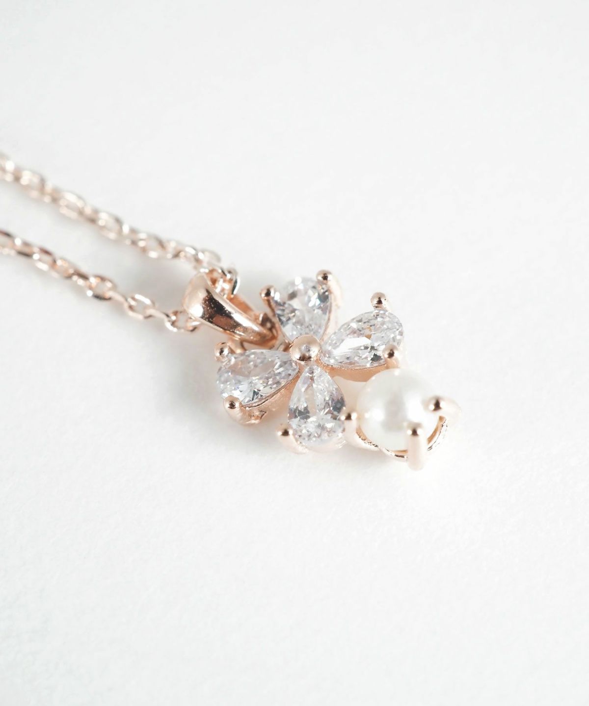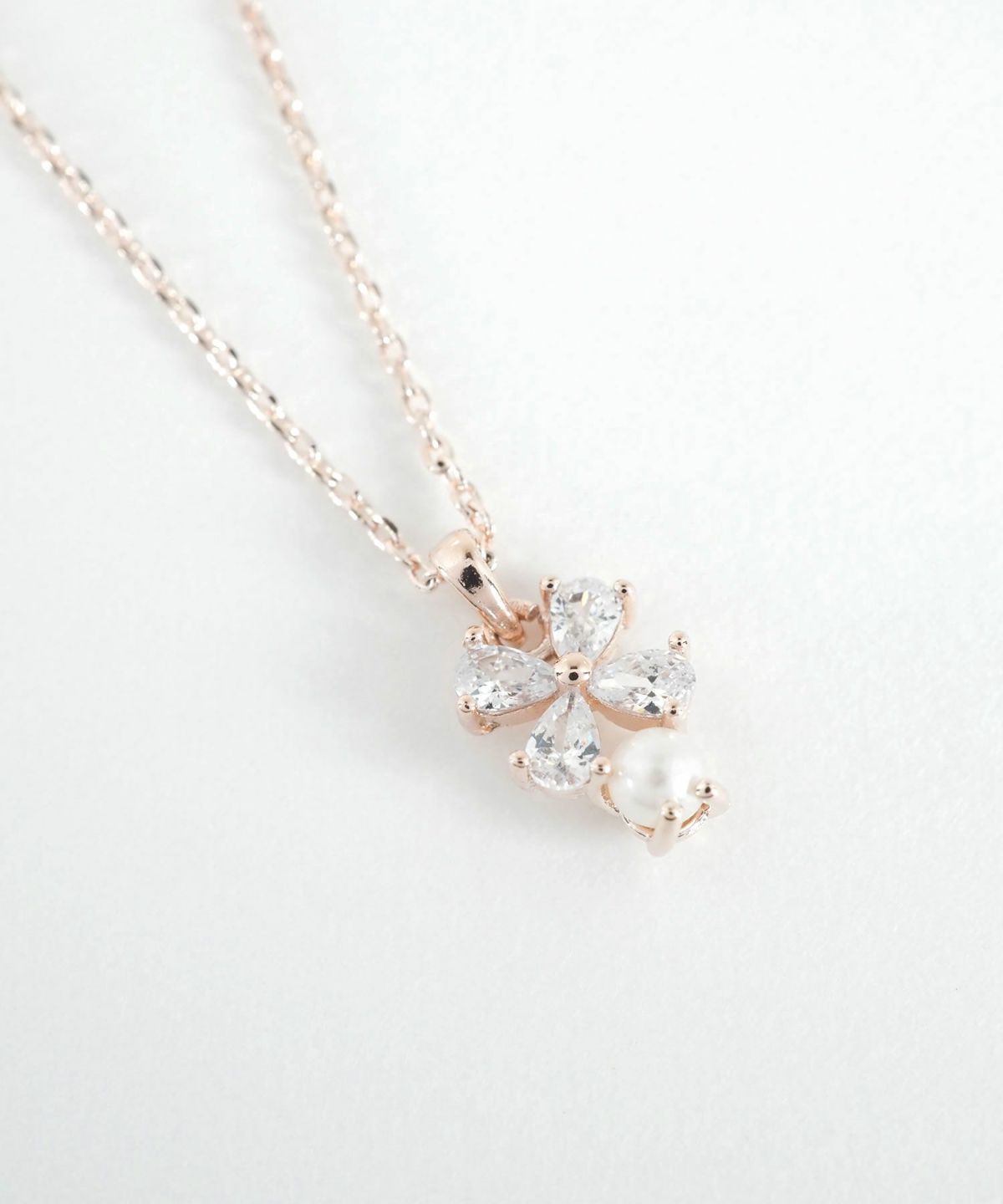 身につける人に幸せを運ぶと言われる四つ葉のクローバーをモチーフにパールがついた、エレガントなネックレスです。葉の部分には、本物のダイヤモンドのような輝きを放つキュービックジルコニアを贅沢に敷き詰め、どの角度から見ても眩い光を集めます。ピンクゴールドの柔らかな色味がデコルテに溶け込み、大人の女性にふさわしい上品な華やかさを演出します。