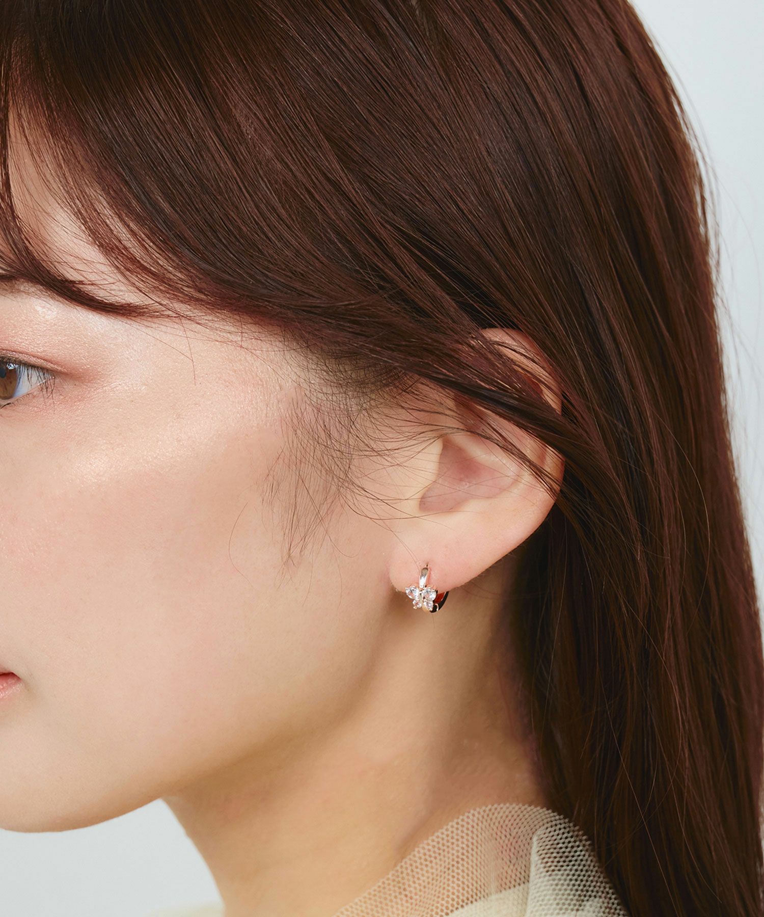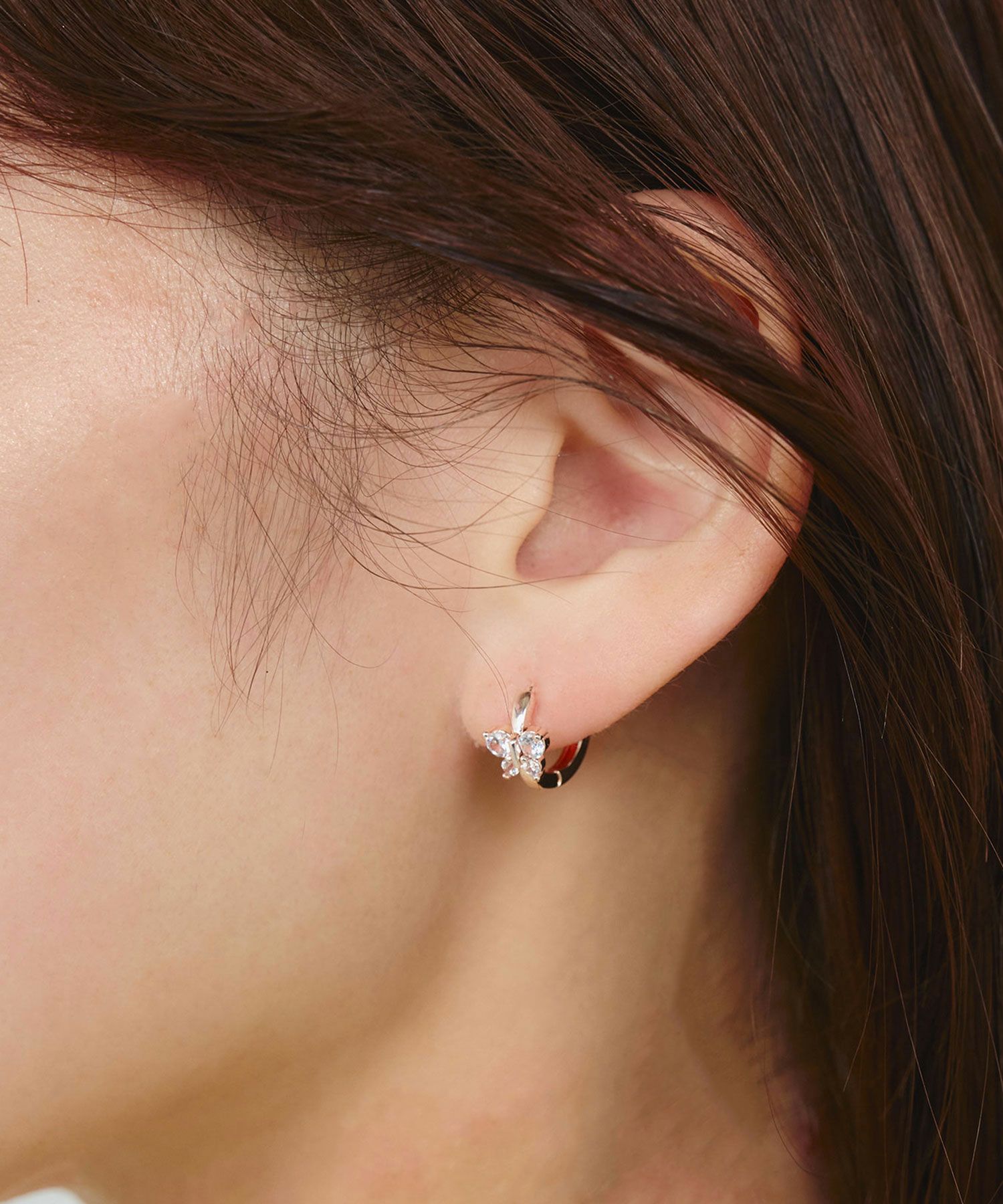 忙しい毎日でもサッと着けられる、人気のワンタッチピアスです。温かみのあるピンクゴールドのフープに、幸運や変化のシンボルとされるバタフライ(蝶)をモチーフにした、華やかなピアスです。繊細にデザインされた羽にはキュービックジルコニアが敷き詰められ、まるで本物の蝶が羽ばたいているかのように、耳元で眩い輝きを放ちます。ペアピアス(両耳用)です。