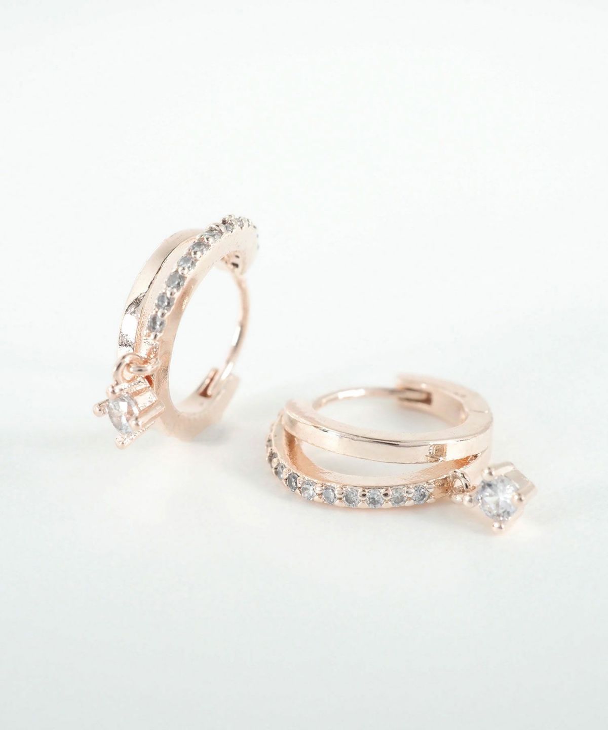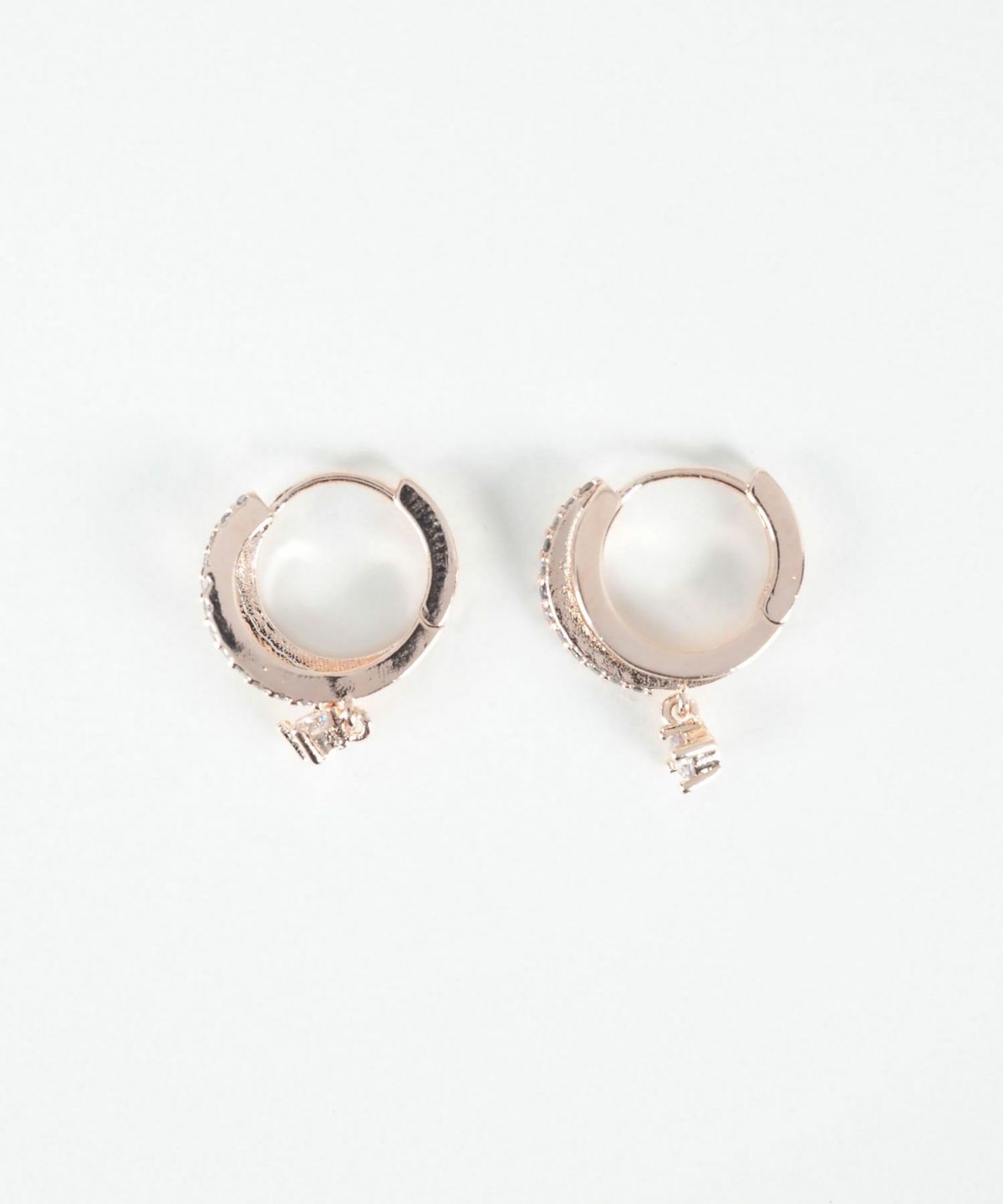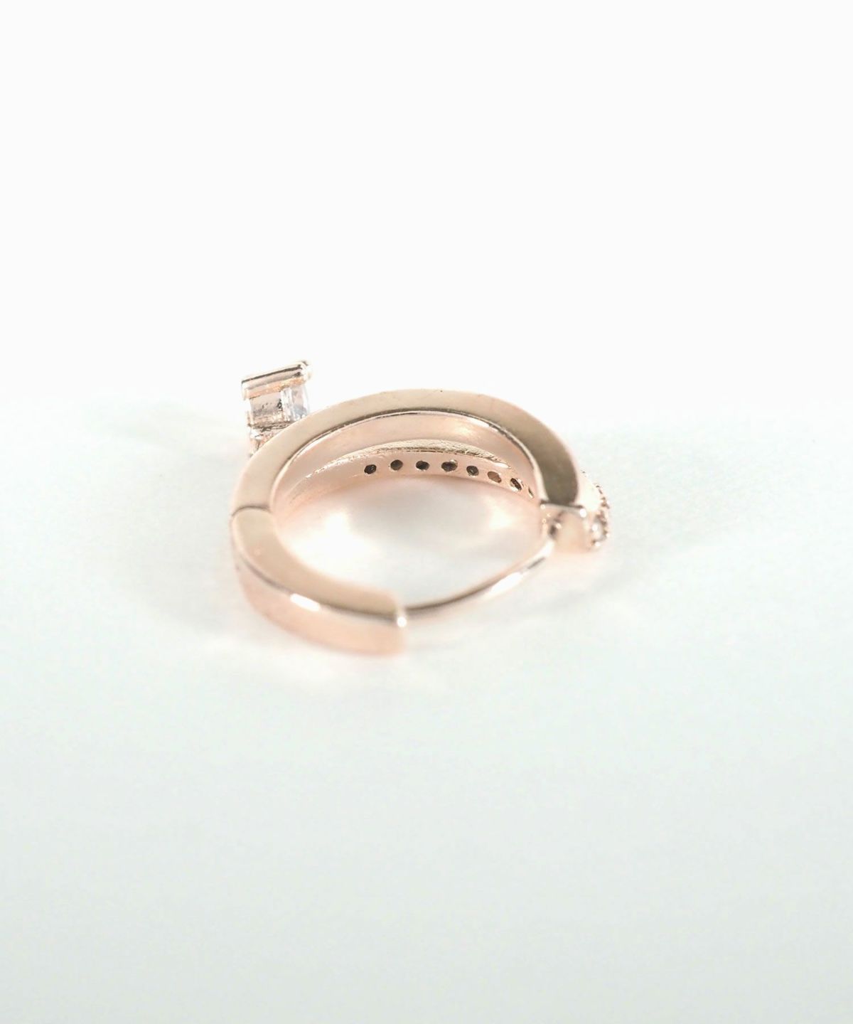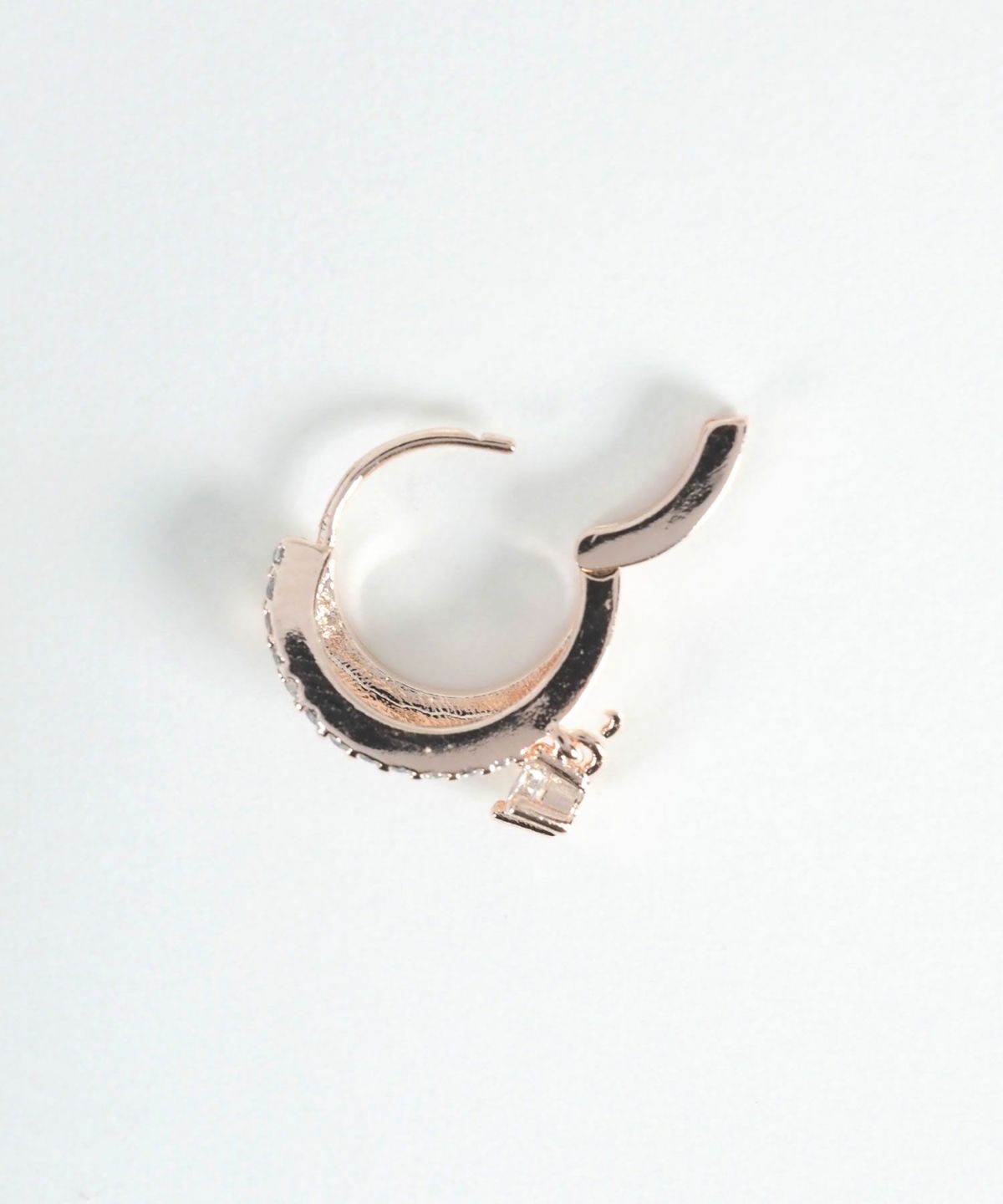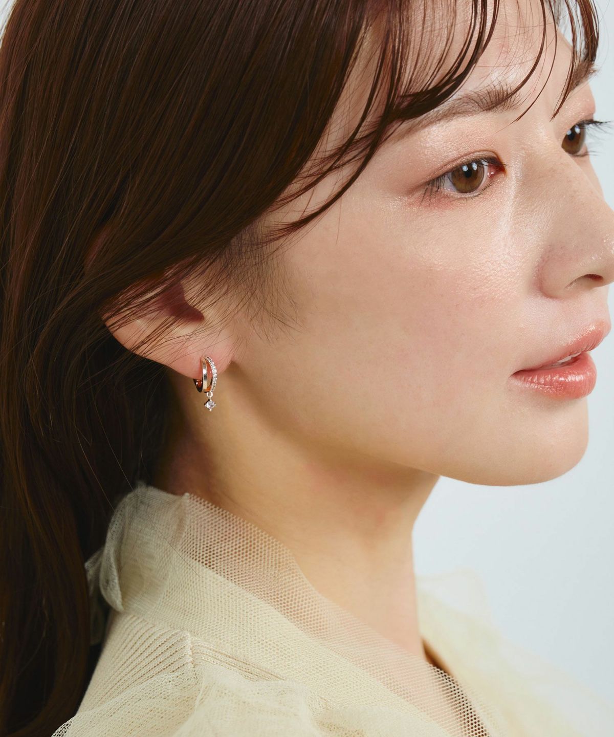 忙しい毎日でもサッと着けられる、人気のワンタッチピアスです。フープの半分にはラインストーンを繊細に敷き詰め、その下に一粒のキュービックジルコニアが優雅に揺らめきます。異なる種類の輝きが耳元で重なり合い、立体感のある華やかさを演出します。肌なじみが最も良いピンクゴールドを使用し、暖かみのある柔らかな輝きで顔周りに上品な血色感と華やかさをプラスします。ペアピアス(両耳用)です。