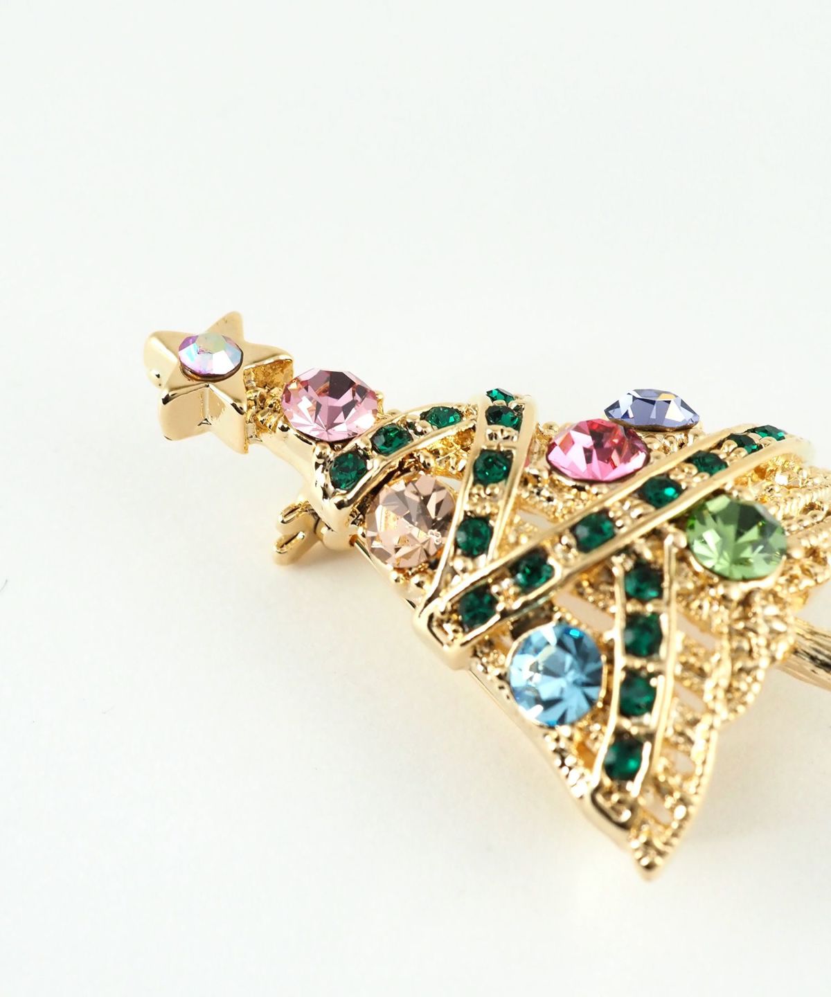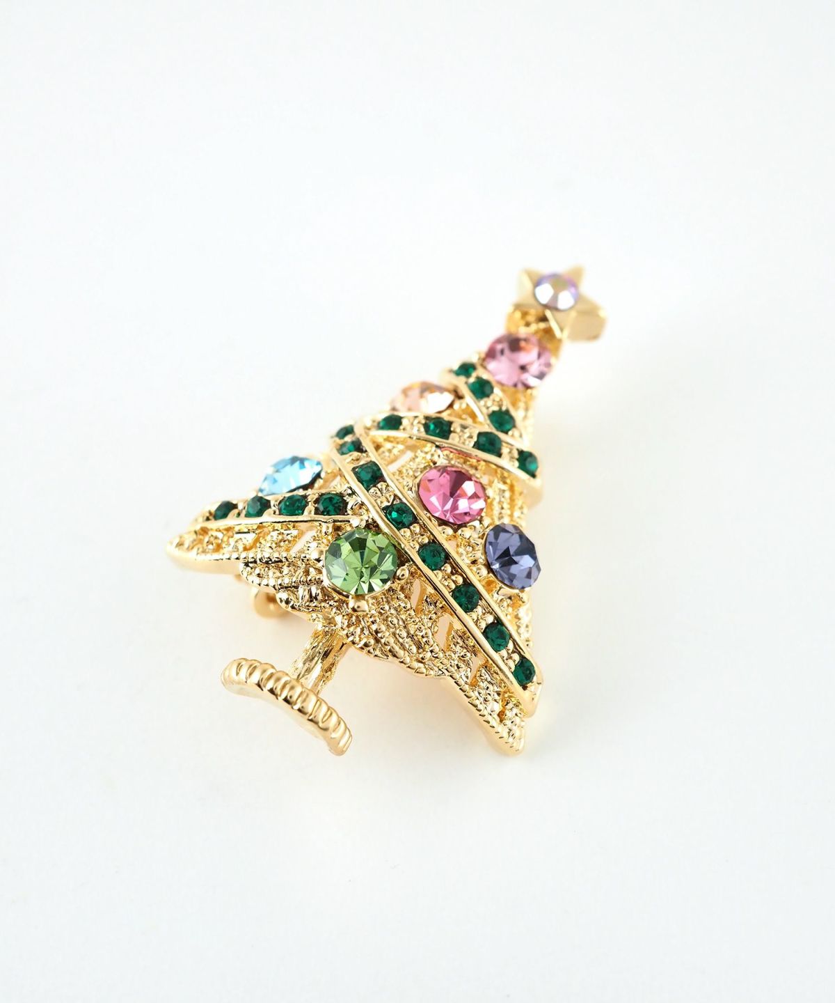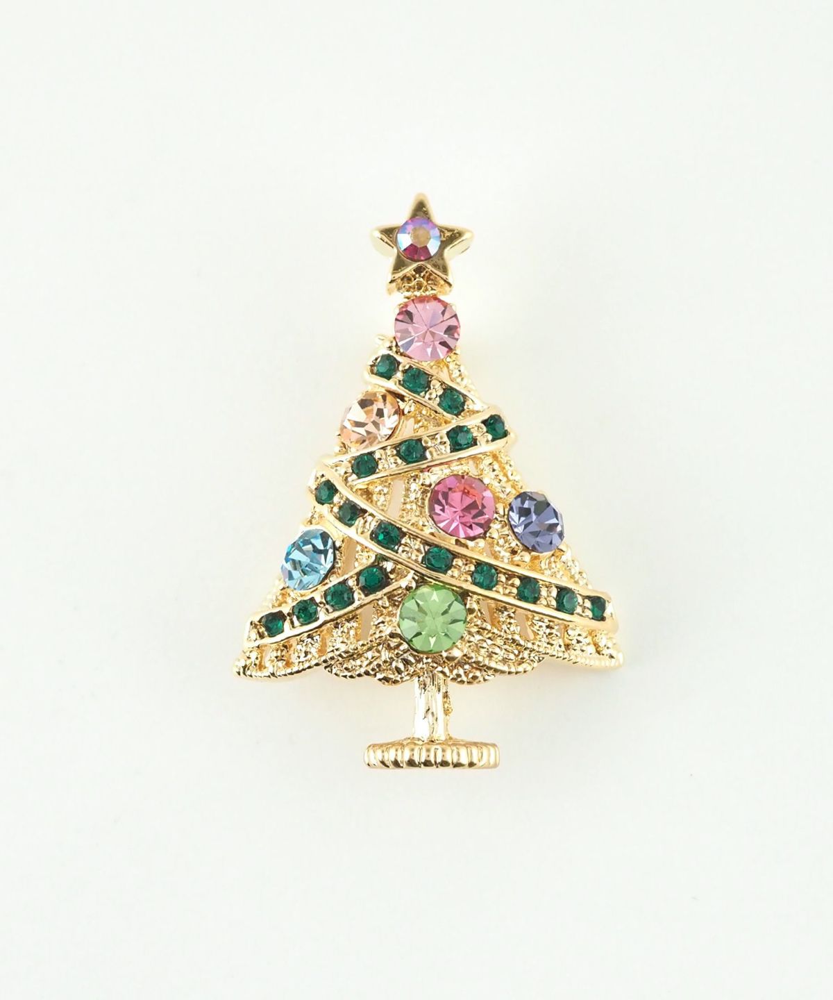 ホリデーシーズンの装いにぴったりの、華やかで可愛らしいツリーモチーフのブローチです。ラインストーンが散りばめられた、カラフルで存在感のあるデザインです。