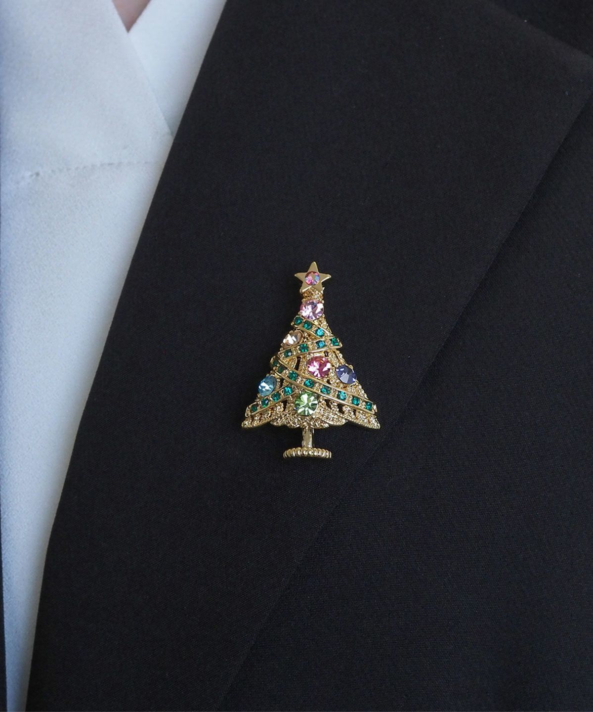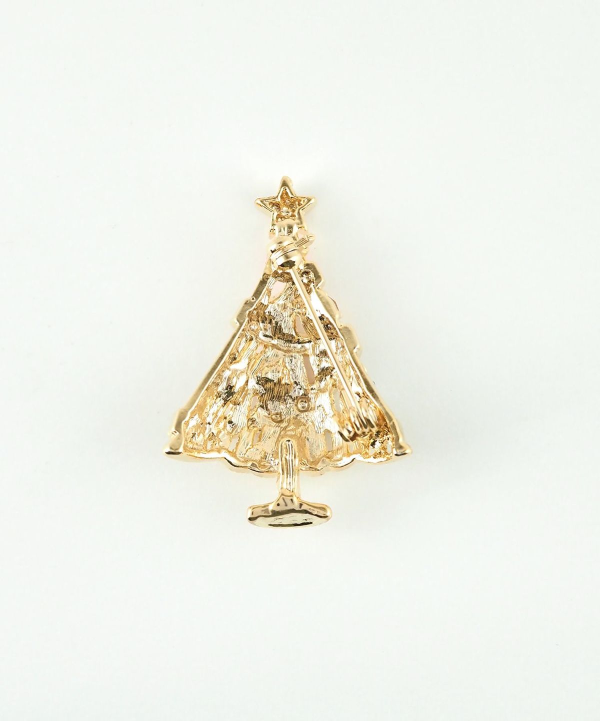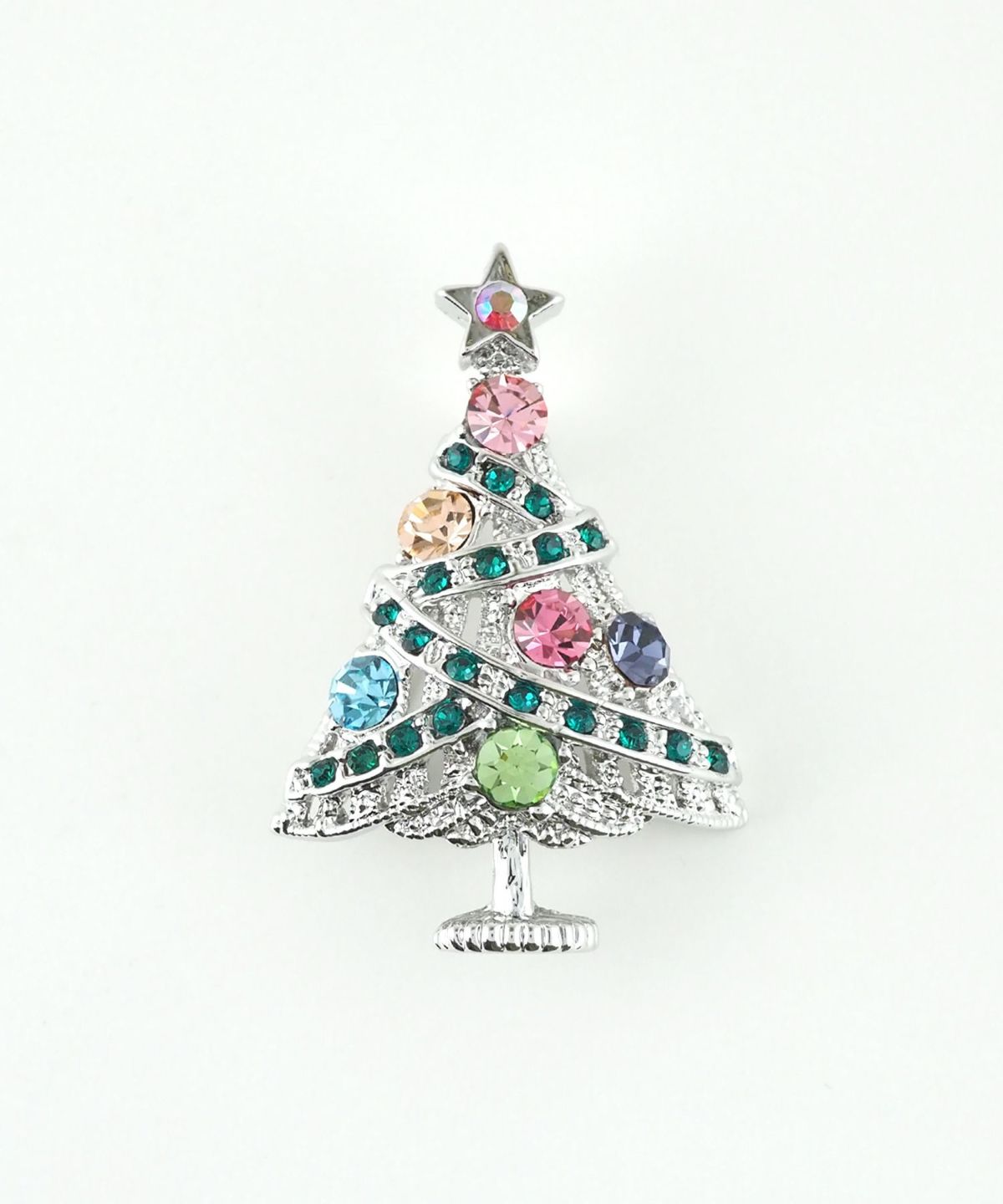 ホリデーシーズンの装いにぴったりの、華やかで可愛らしいツリーモチーフのブローチです。ラインストーンが散りばめられた、カラフルで存在感のあるデザインです。