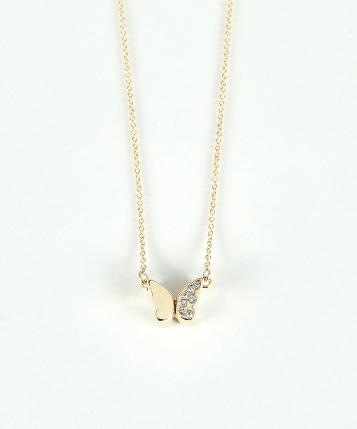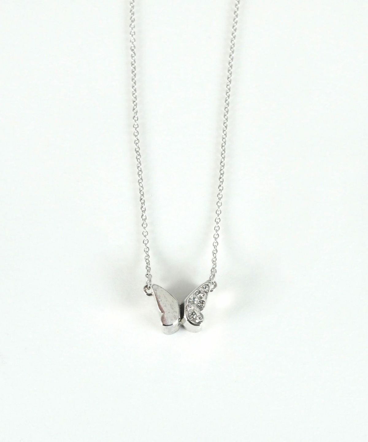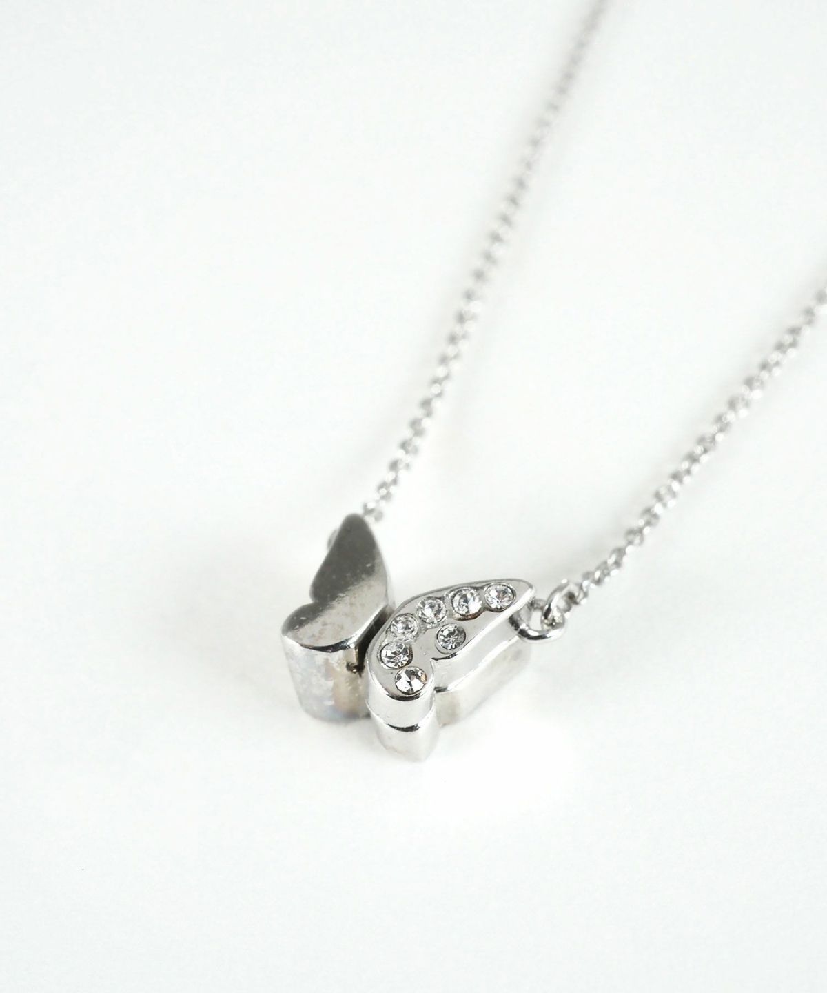 優雅に羽ばたくバタフライモチーフにビジューをあしらった、可愛らしさと上品さを兼ね備えたマグネットネックレス。近づけるとくっつくマグネット使用で、簡単&ストレスフリー。金具がないのですっきり見えるのも魅力。