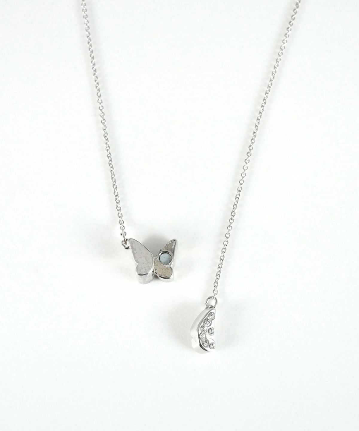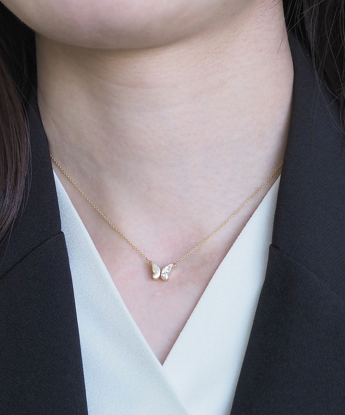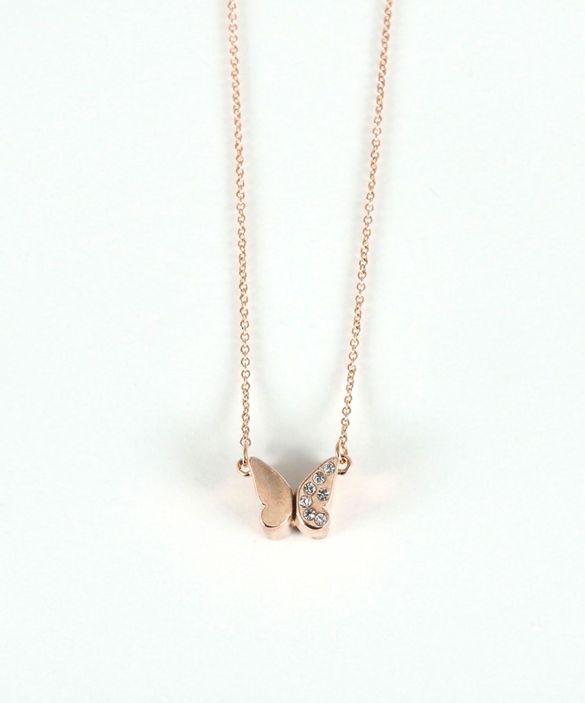 優雅に羽ばたくバタフライモチーフにビジューをあしらった、可愛らしさと上品さを兼ね備えたマグネットネックレス。近づけるとくっつくマグネット使用で、簡単&ストレスフリー。金具がないのですっきり見えるのも魅力。