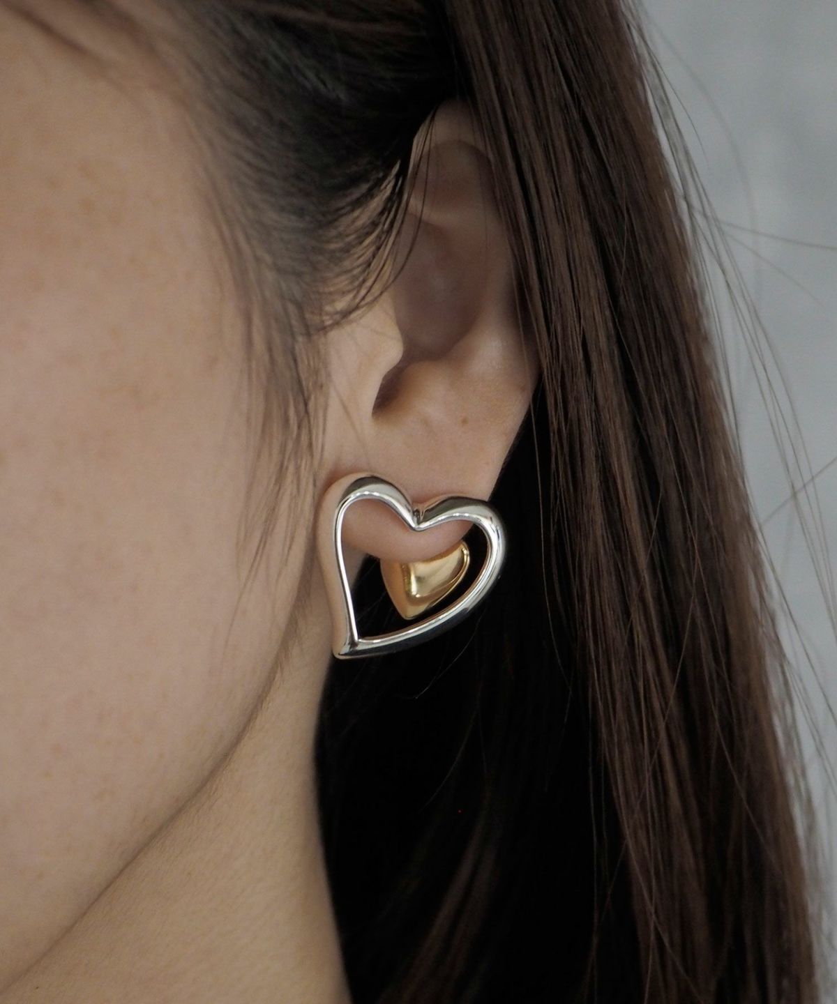 いつものコーディネートに大人の可愛さをプラスする、甘さを抑えた、大人のためのバックキャッチピアス。 シルバーとゴールドのバイカラーで、一気にトレンド感をアップさせます。前後からハートが覗くデザインは、横顔に視線を集める主役級の存在感。立体的で新鮮なスタイルを演出します。手持ちのアクセサリーとも合わせやすい、洗練されたアイテムです。ペアピアス(両耳用)です。
