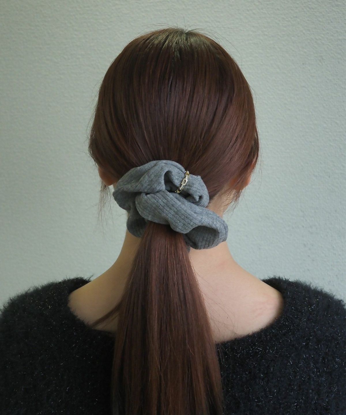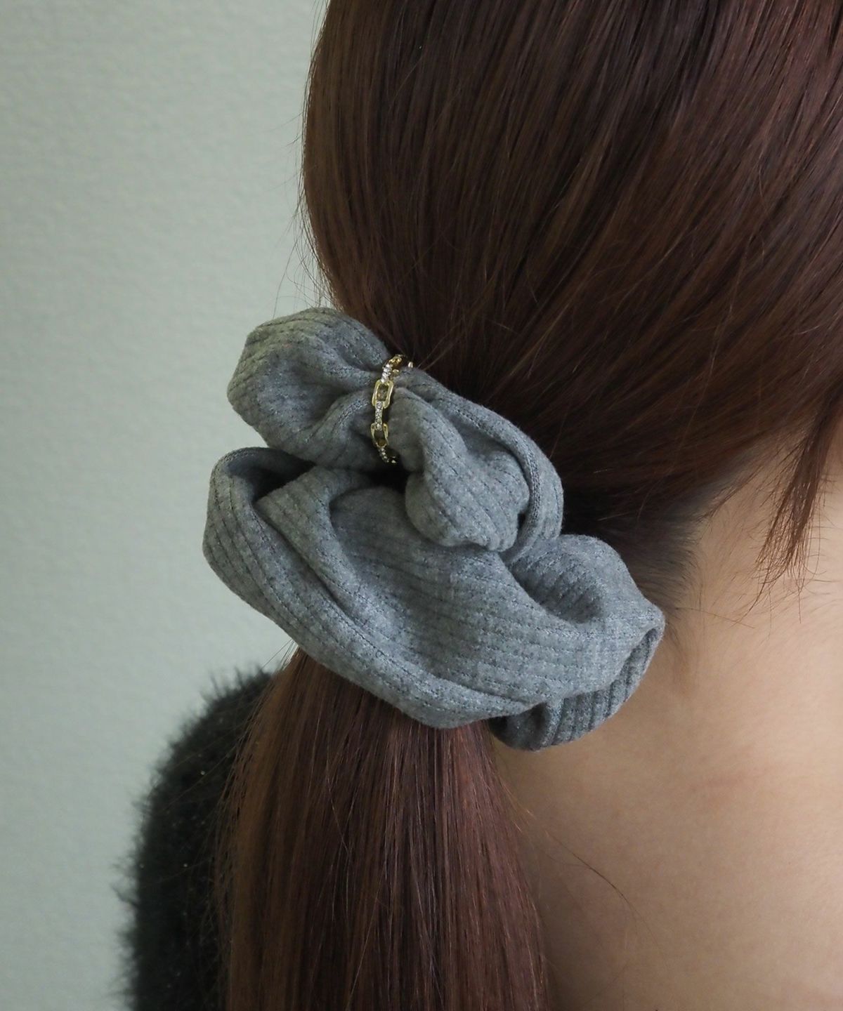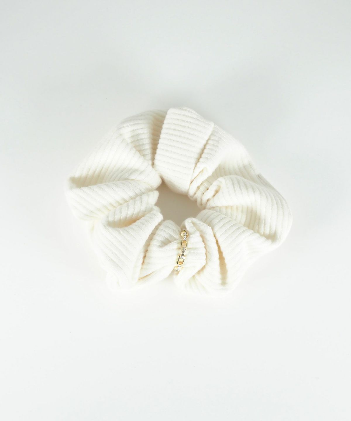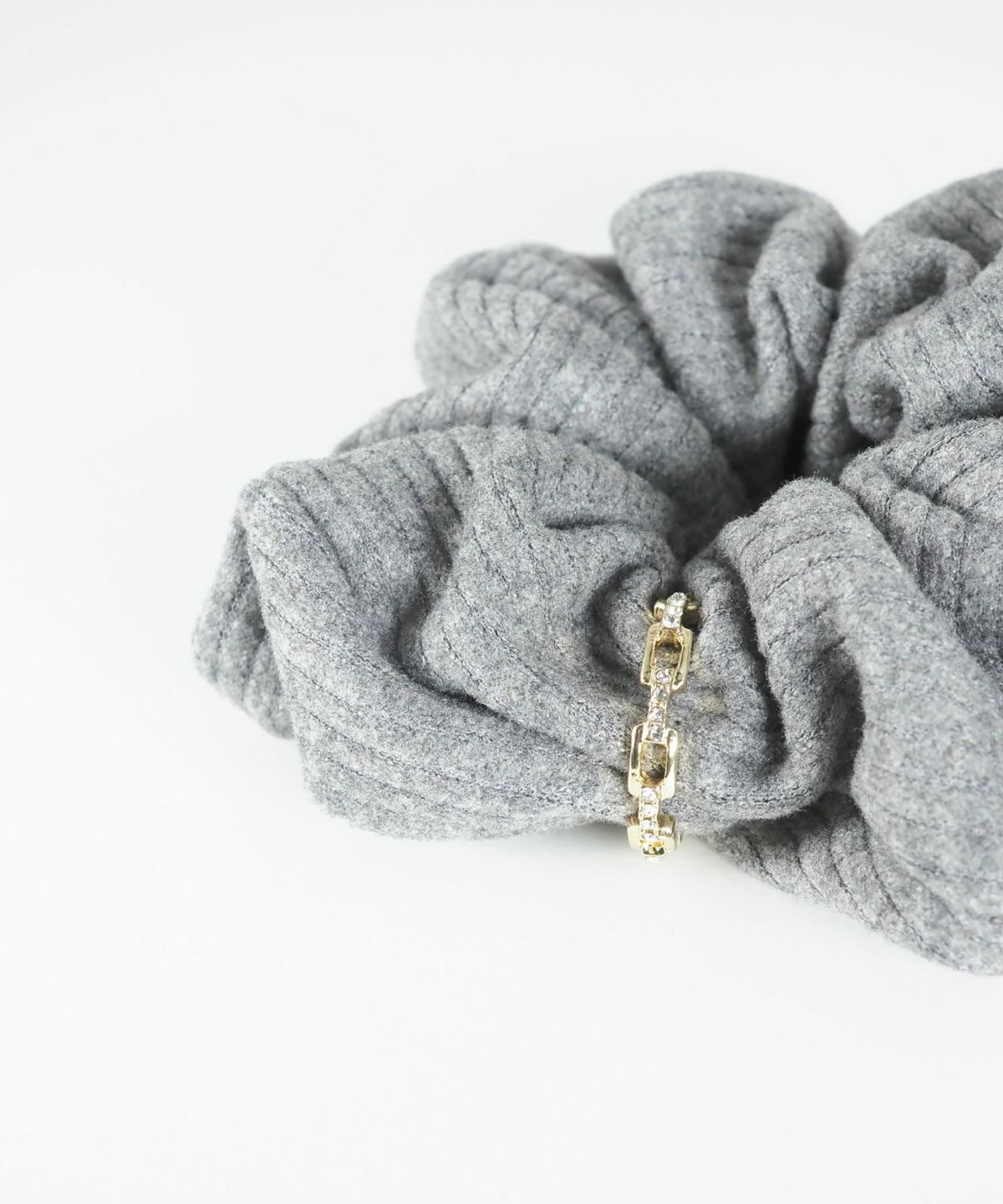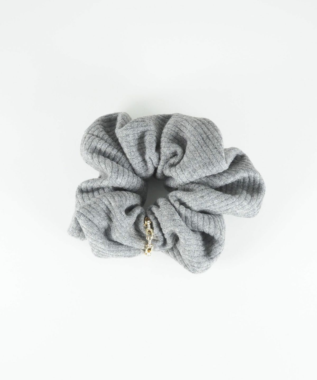 ふんわりと柔らかな肌触りのリブ生地に、硬質な光を放つメタルリングを巻き付けたシュシュ。カジュアルなリブ素材にメタリックなアクセントが加わり、モードで洗練された印象を与えます。