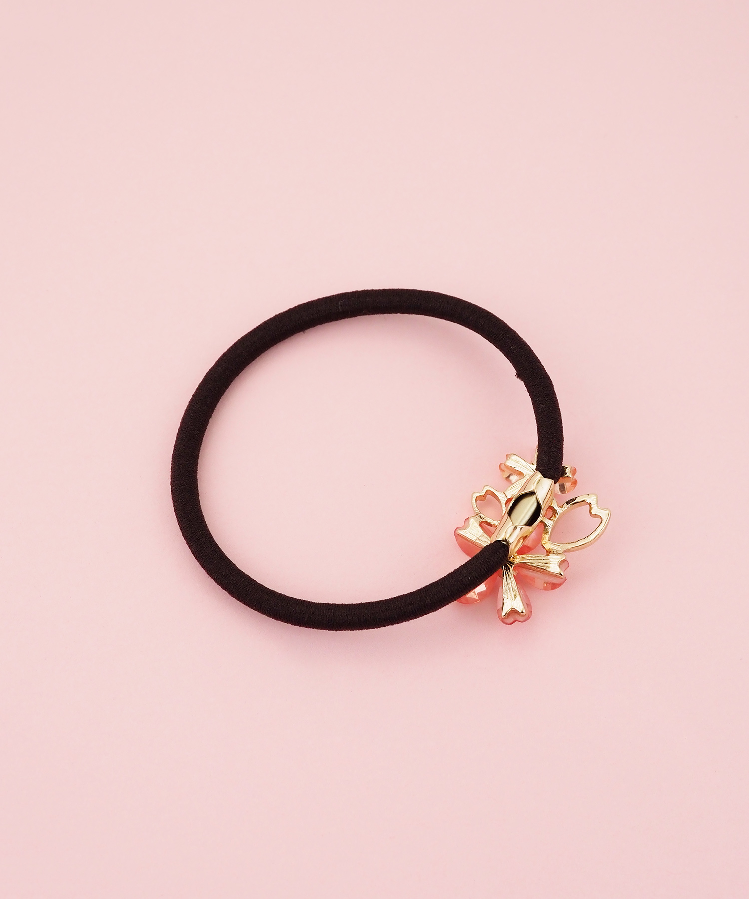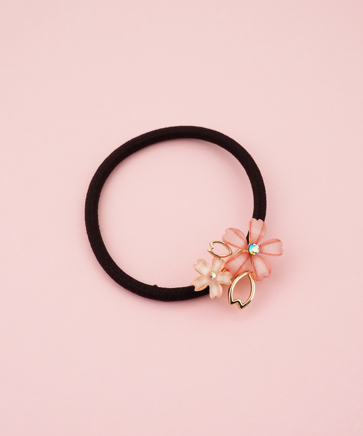 美しい姿から多くの人に愛される桜(さくら)モチーフのヘアポニー。桜(さくら)色ともよばれる淡いピンクは上品で美しい印象。パーツの中にはガラスビジューがキラキラと光ります。
