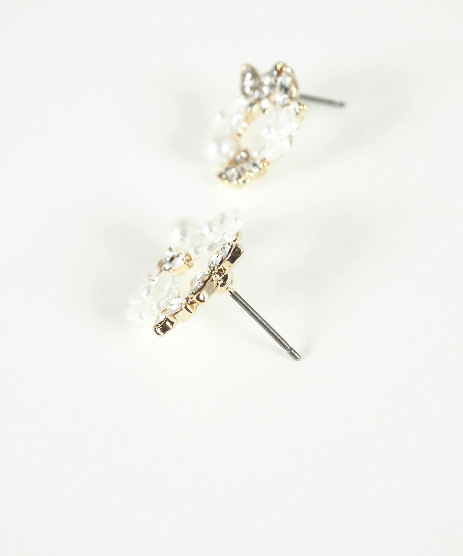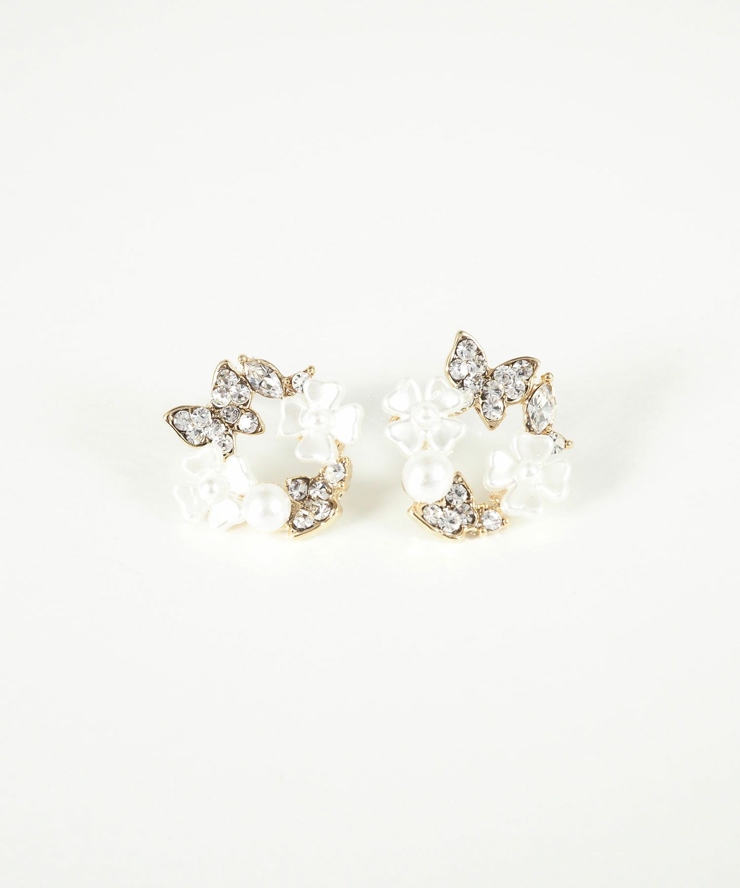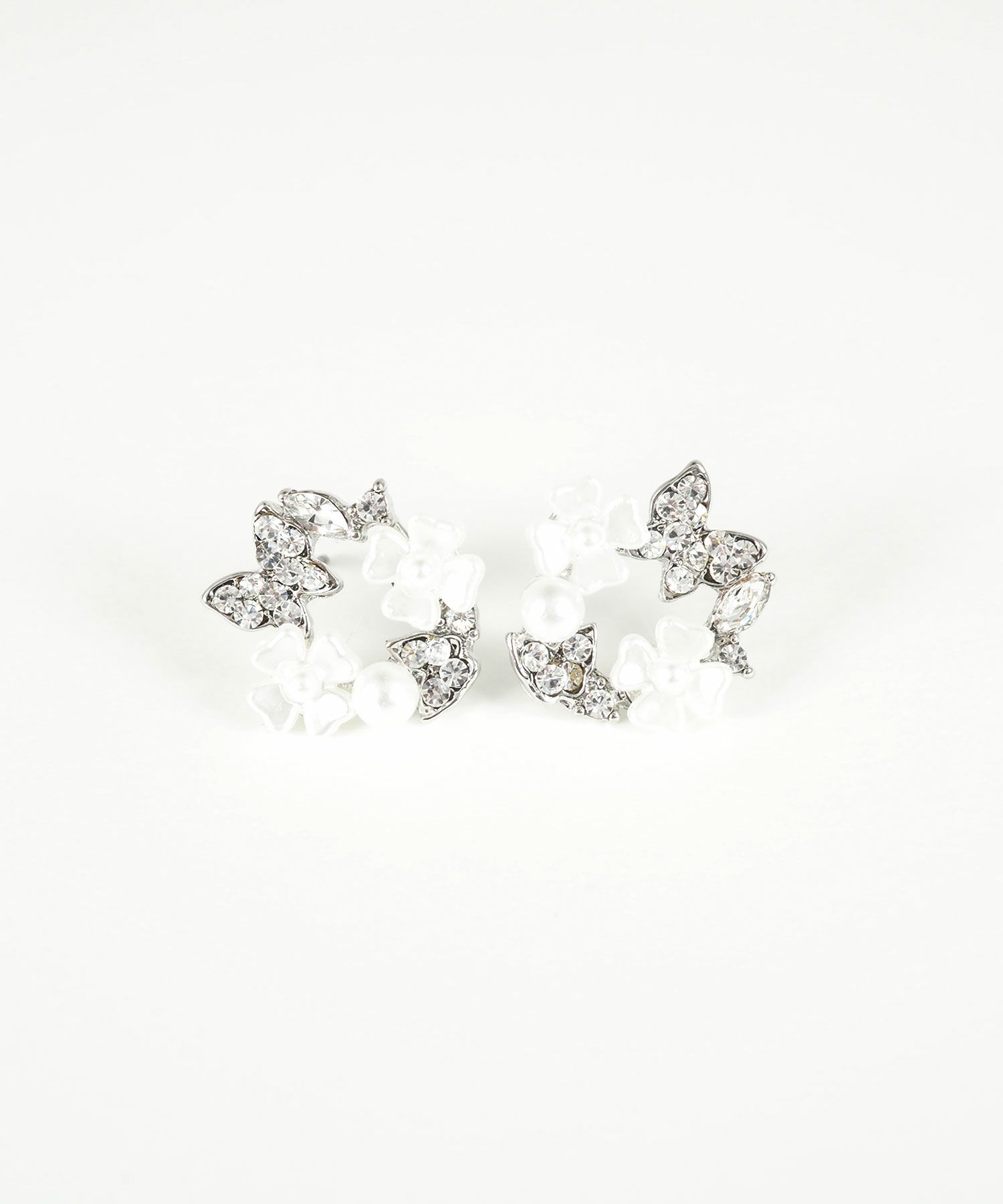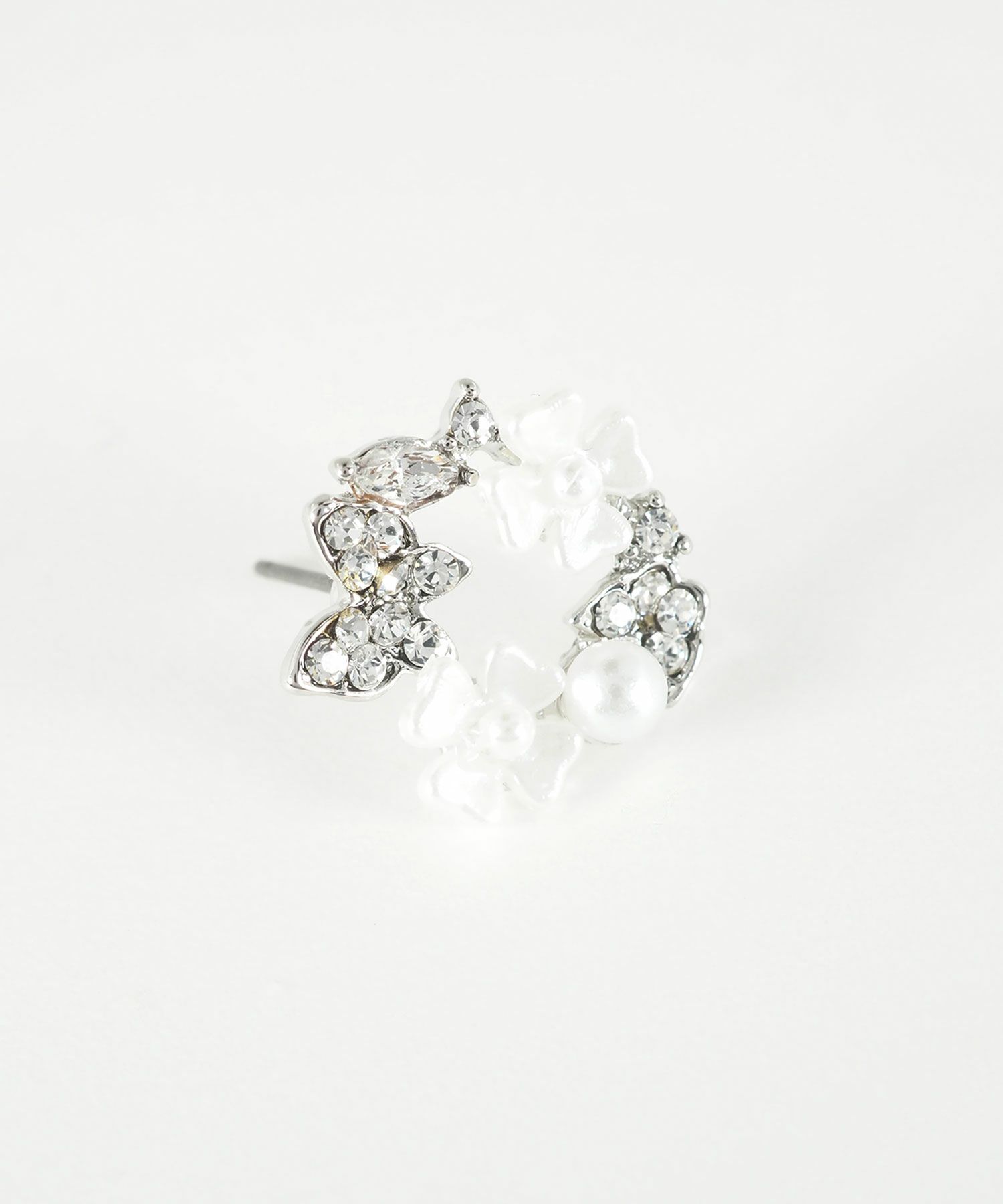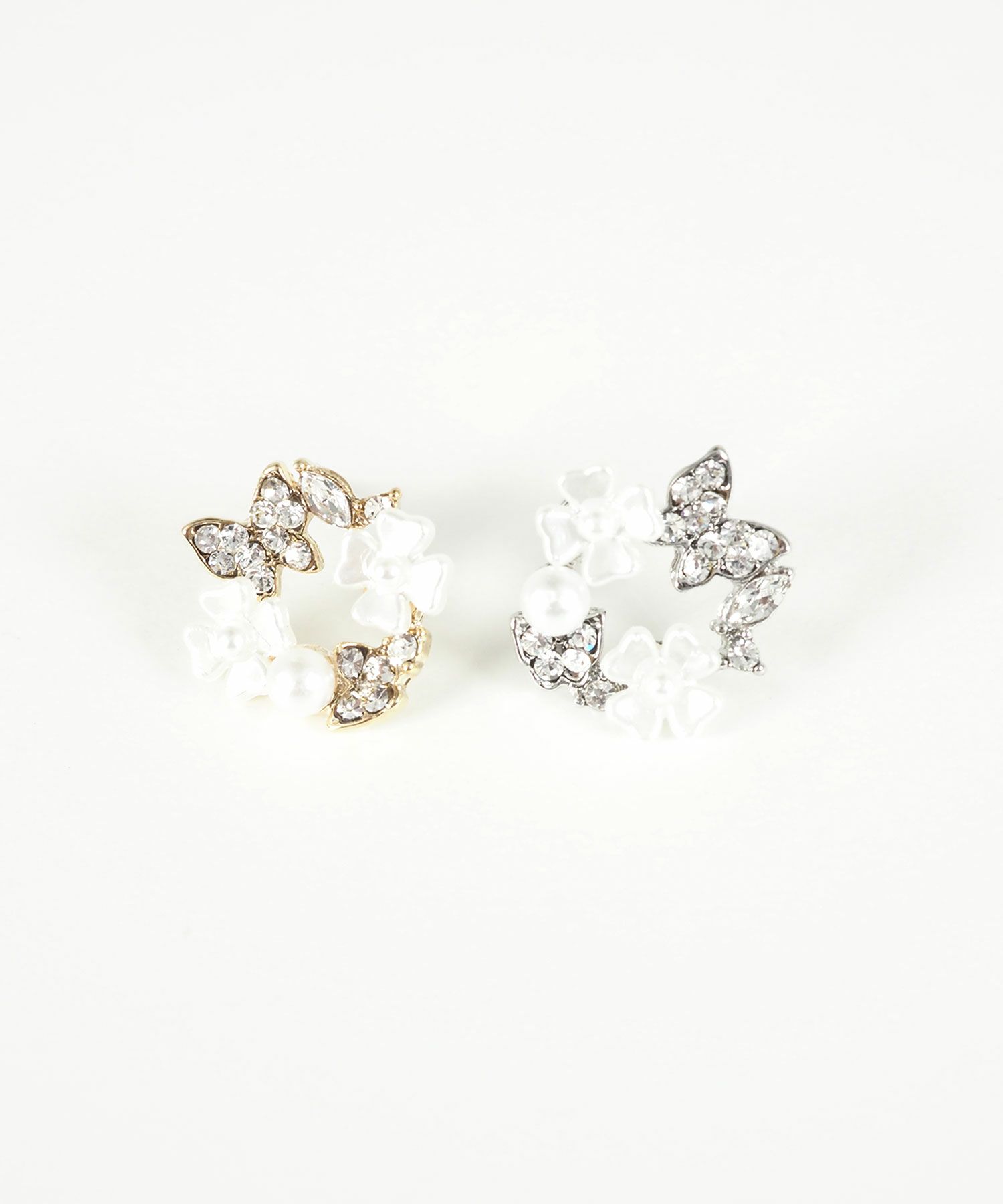 二輪の花、輝くビジューの蝶、そしてパール付きの葉を贅沢に組み合わせた、華やかなリースデザインのピアス。耳元に自然の美しさと光のきらめきを集めます。特別なシーンにはもちろん、シンプルなお洋服に合わせるだけで一気に優雅で洗練された印象に。ペアピアス(両耳用)です。