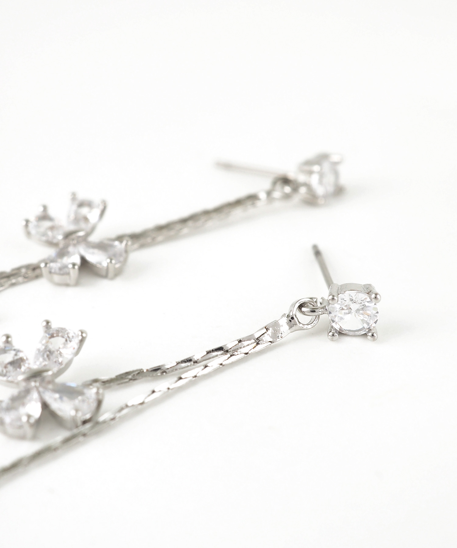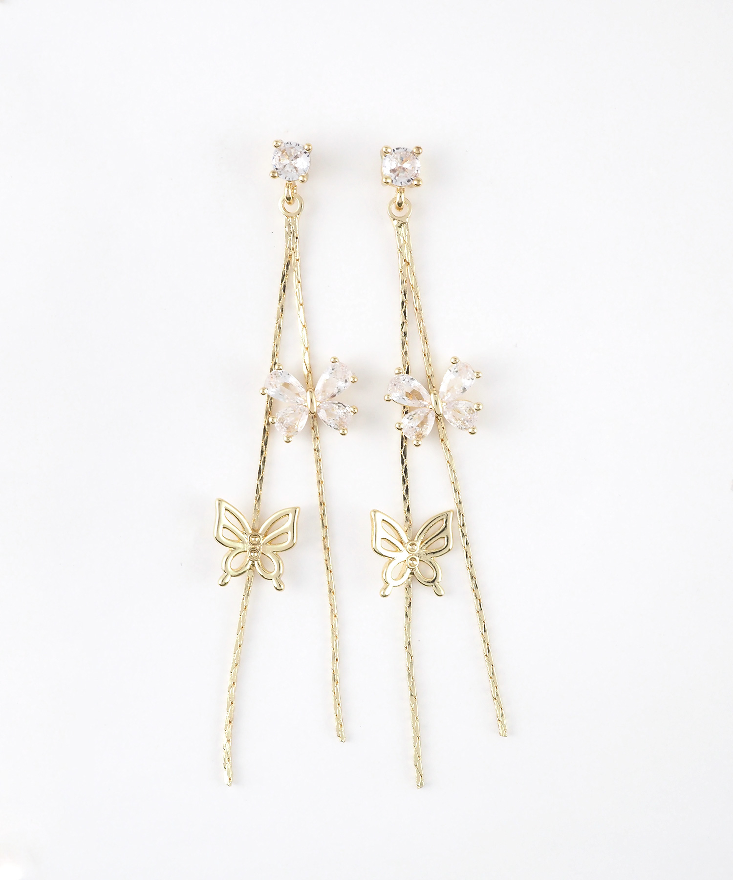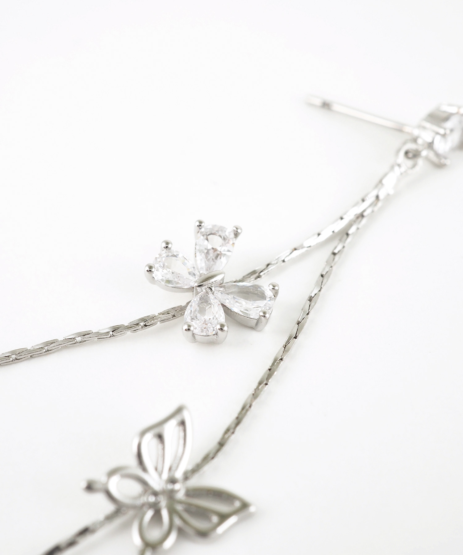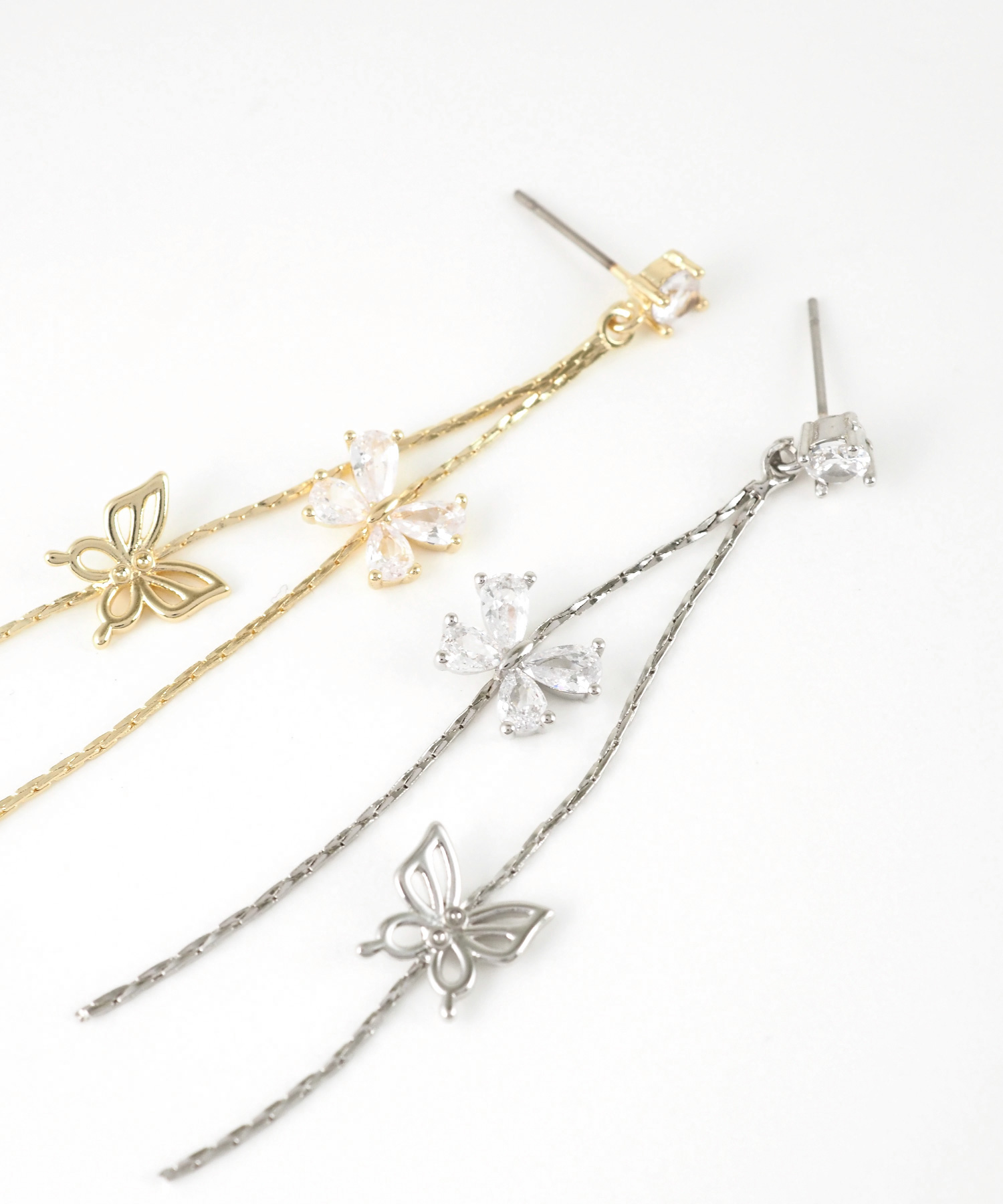 耳元で軽やかに揺れる、2羽の蝶をあしらったロングチタンポストピアスです。 ビジューが煌めく蝶と、繊細なラインで描かれたメタルの蝶。異なる質感のモチーフを組み合わせることで、奥行きのある上品な輝きを演出しました。ペアピアス(両耳用)です。