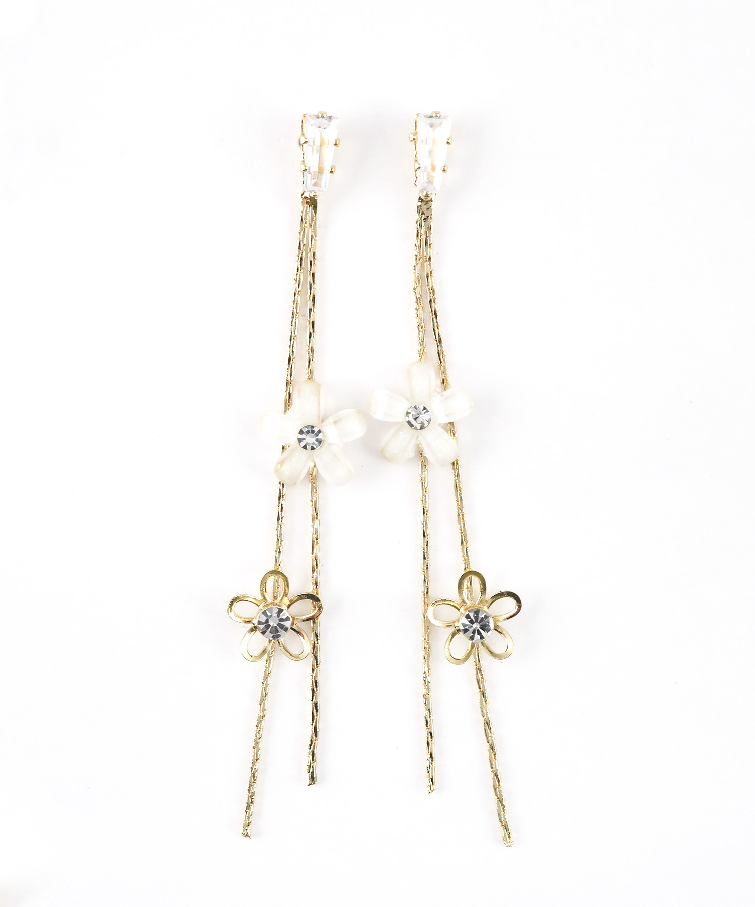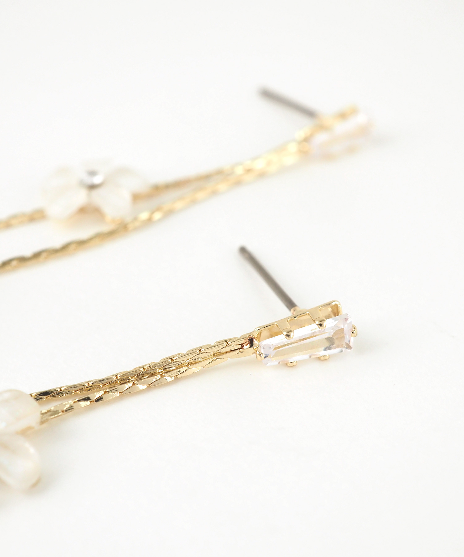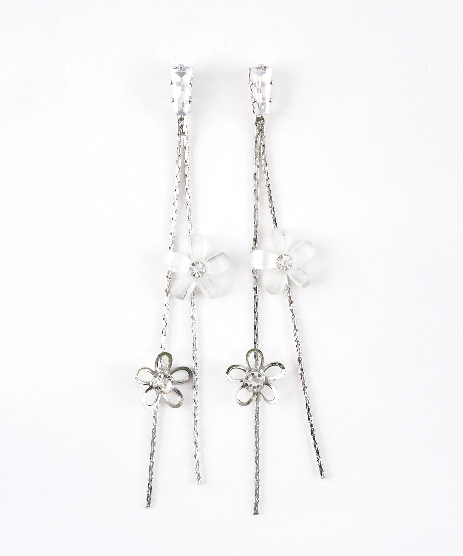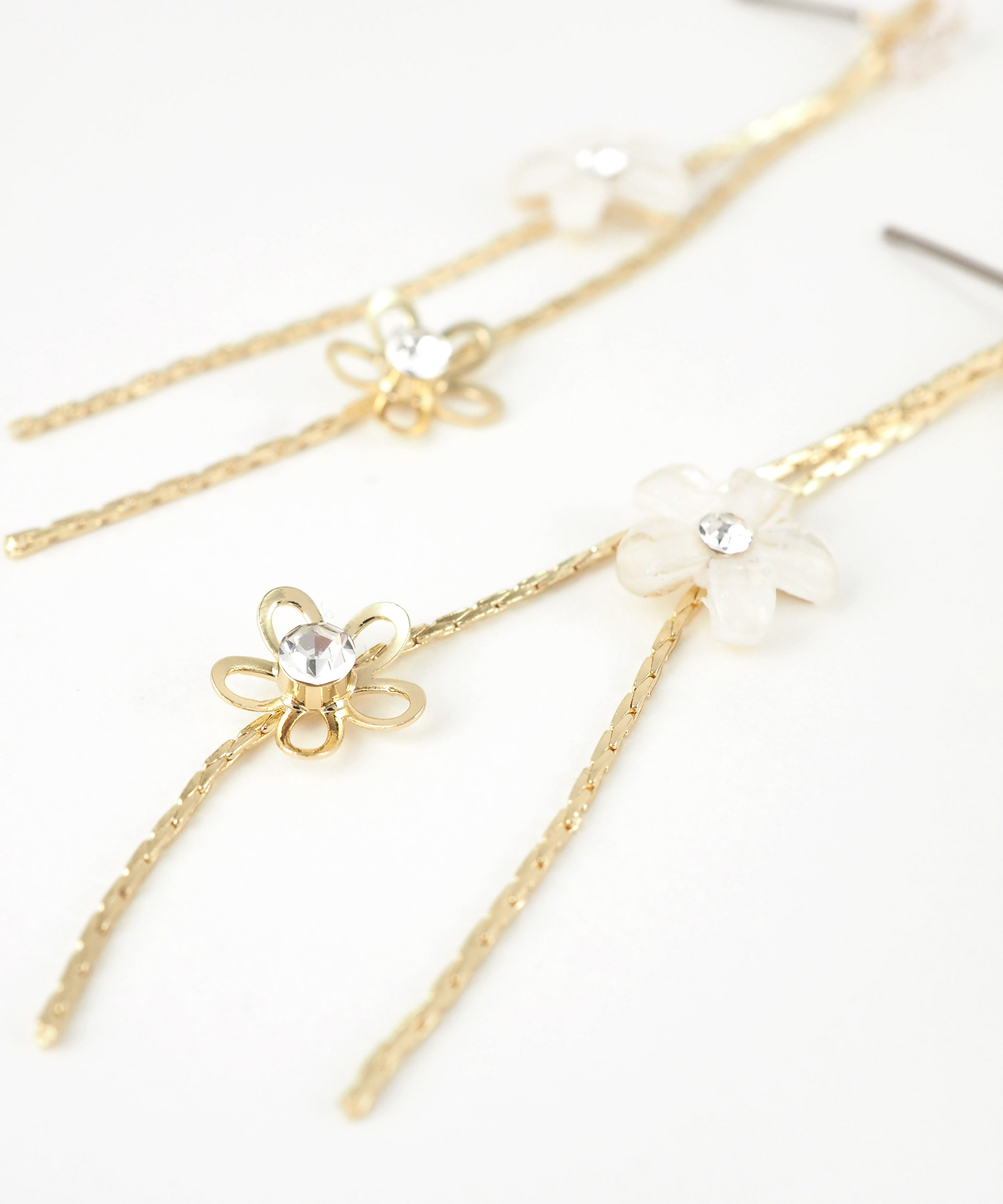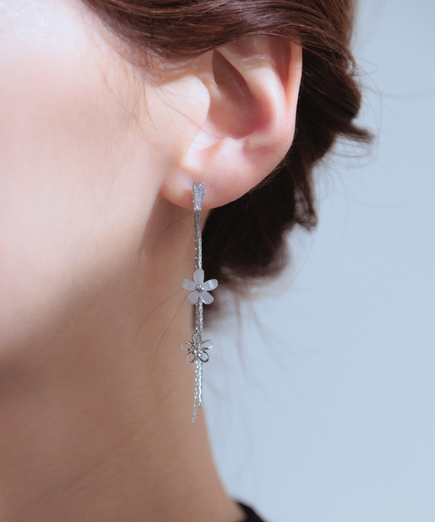 耳元に可憐な花を咲かせる、2連チェーンのロングチタンポストピアス。 すりガラスのような質感のフラワーと、光を反射するメタルフラワーを組み合わせ、奥行きのある大人可愛いデザインに。 いつものカジュアルスタイルにプラスするだけで、パッと華やかな印象に様変わりするアイテムです。ペアピアス(両耳用)です。