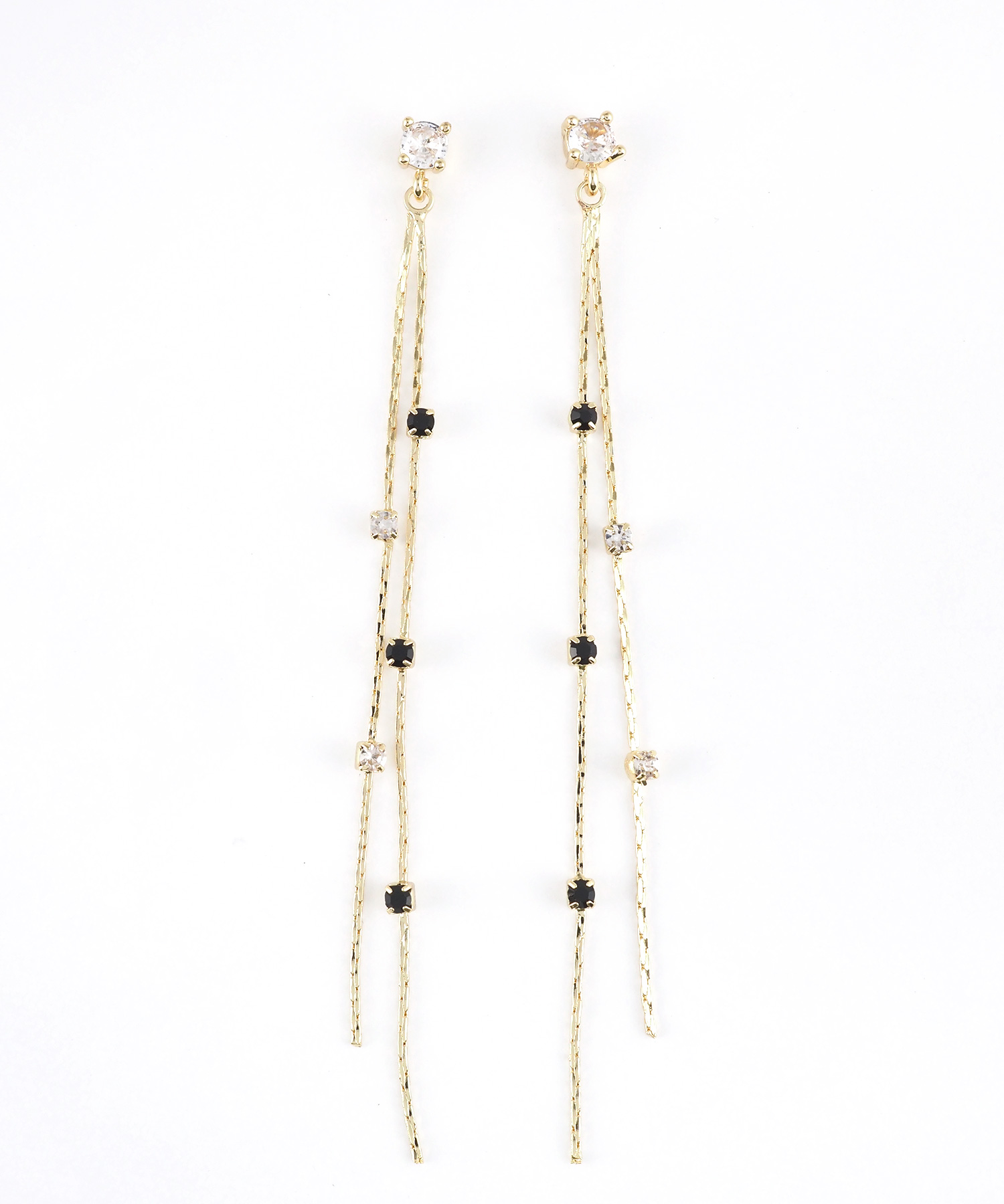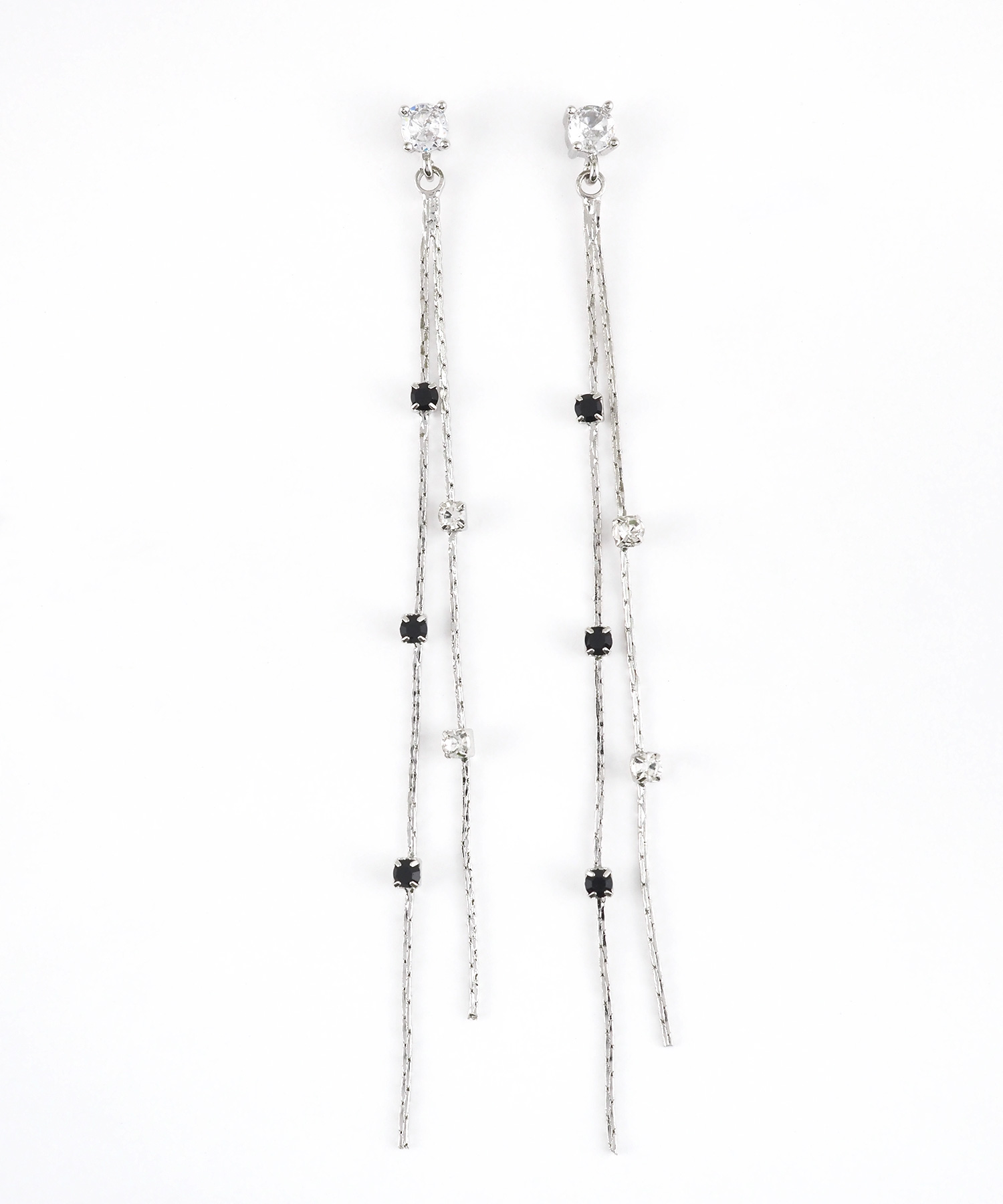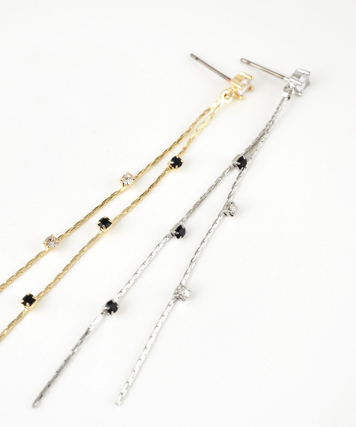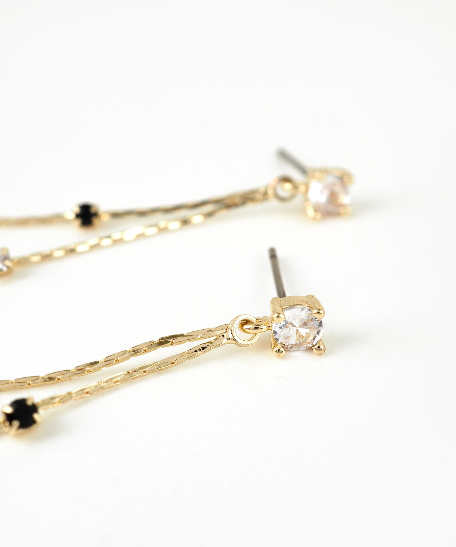 シックなブラックと澄んだクリアの2色のビジューを交互に配置した、都会的で洗練されたロングチタンポストピアスです。 細やかに輝く2本のチェーンが、動くたびに異なる表情を見せてくれます。甘さを抑えたモードなデザインは、オフィスからプライベートまでシーンを問わず幅広く活躍します。ペアピアス(両耳用)です。