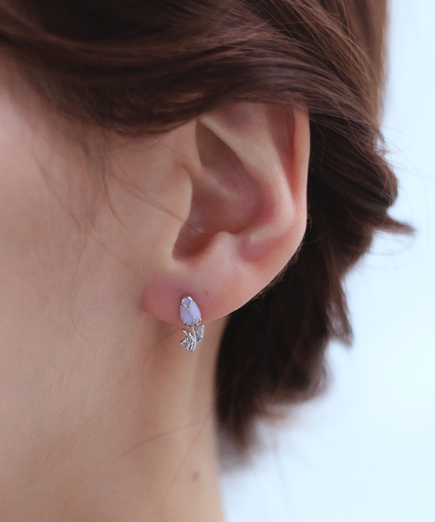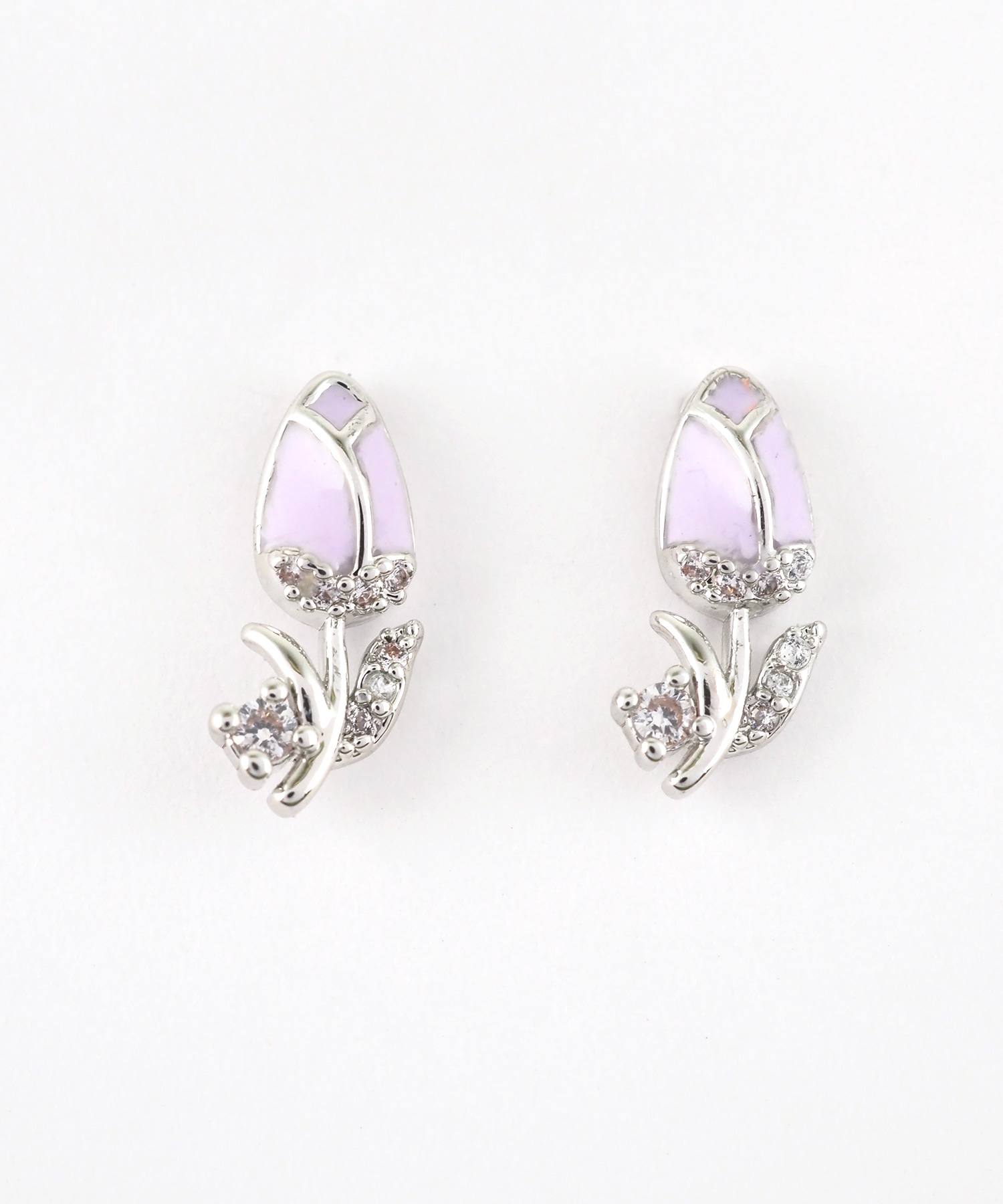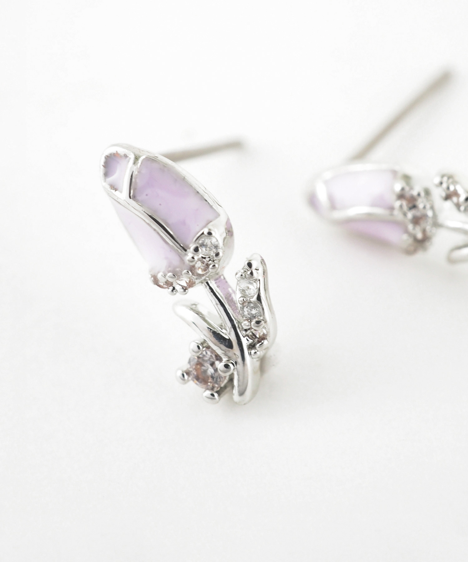 繊細に輝くビジューを添えた、可憐なチューリップモチーフのステンレスポストピアス。シルバーの茎と葉にはストーンが散りばめられており、お顔周りを華やかに演出します。フェミニンなピンクと透明感のあるパープルの2色展開で、日常使いからオフィスまで幅広く活躍します。ペアピアス(両耳用)です。