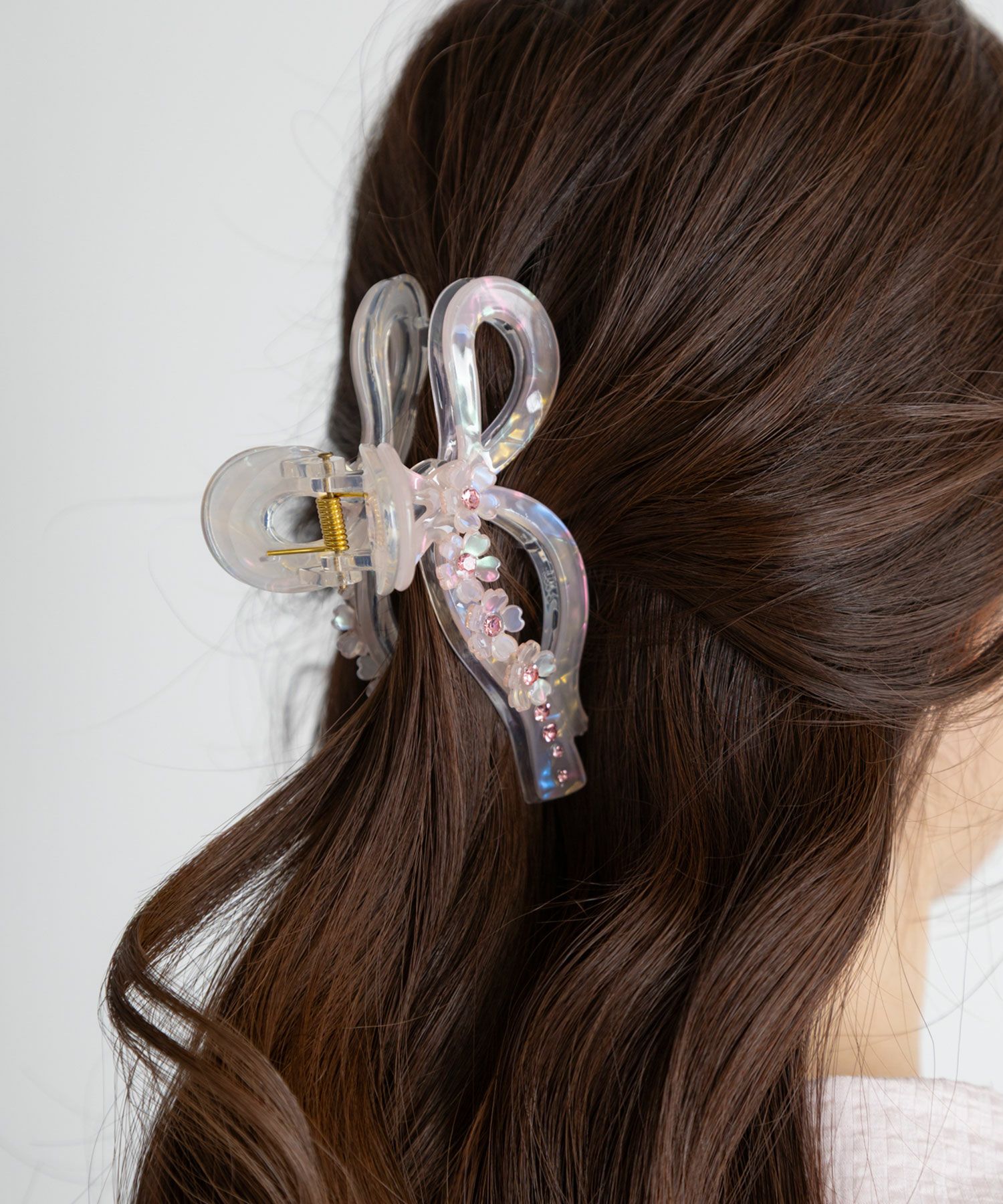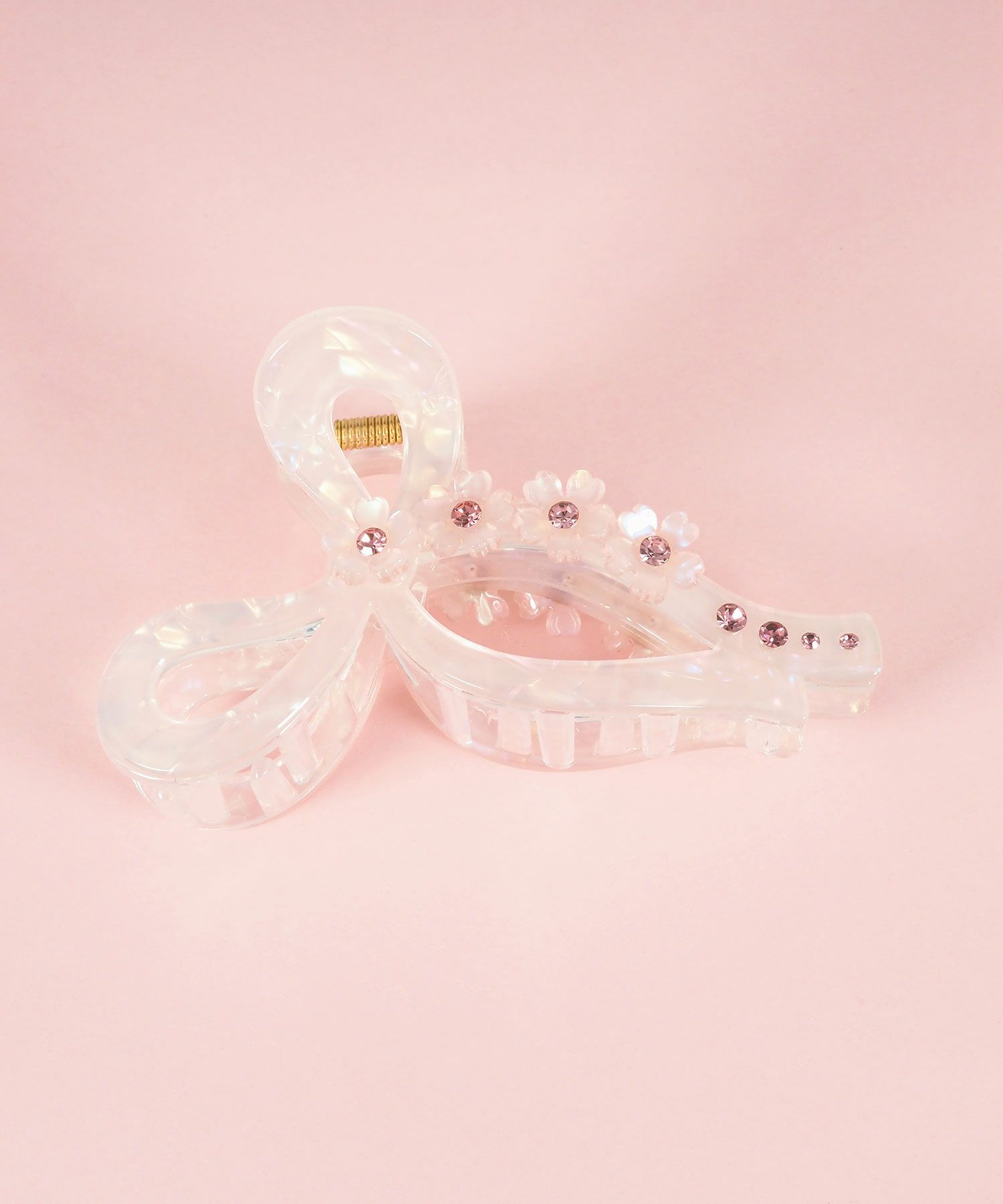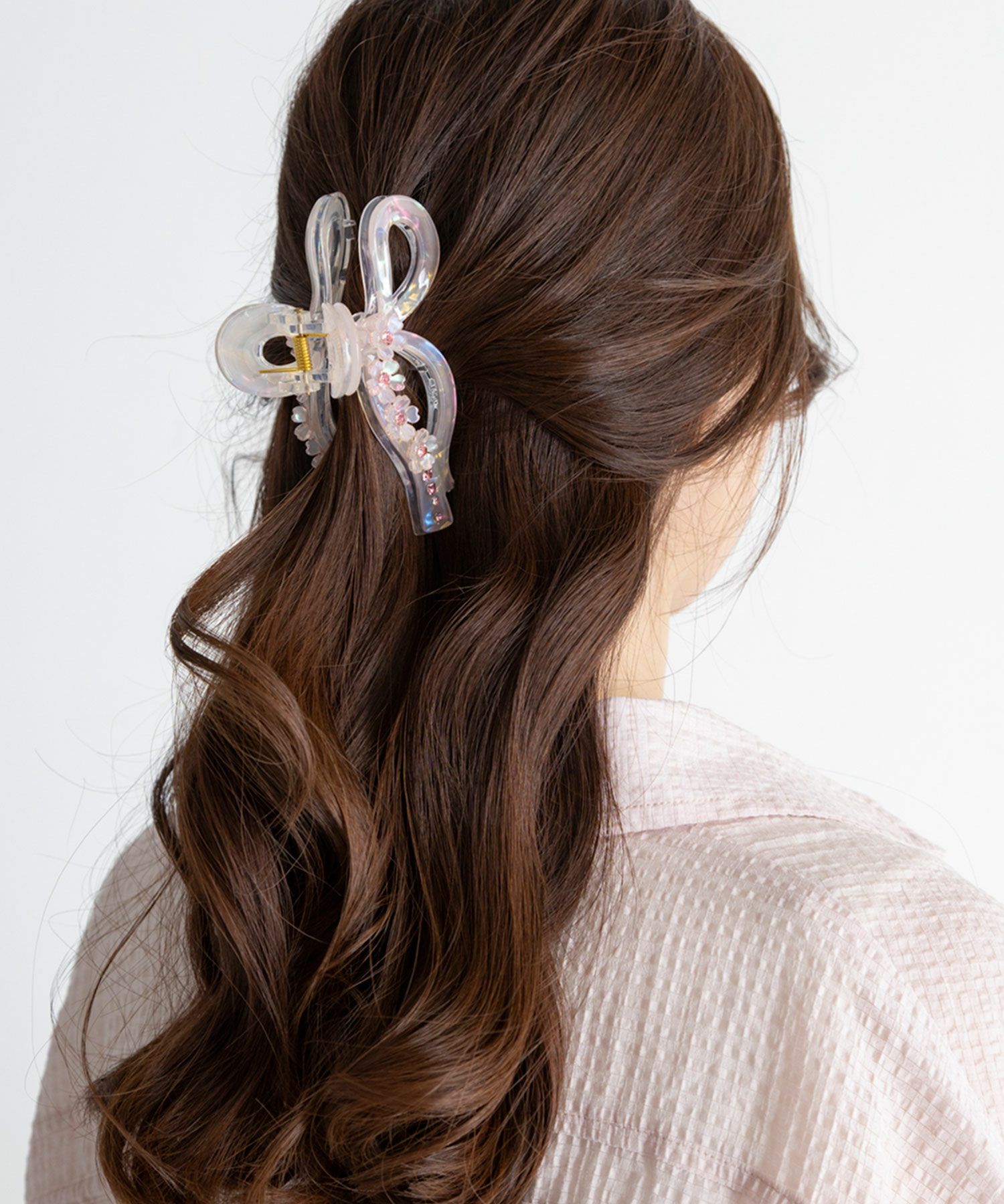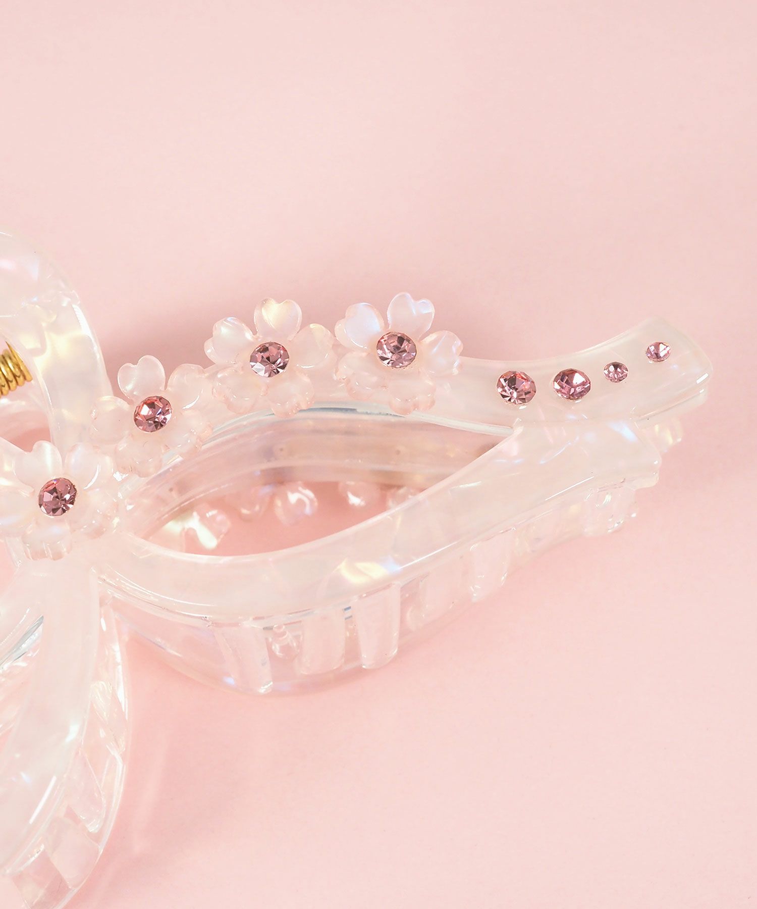 小さな桜を連ねたオーロラデザインにフェミニンなリボンの形をプラスし春らしい軽やかな印象に。角度によって表情を変えるオーロラと淡い桜色が後ろ姿を華やかに彩ります。髪をしっかりと掴んでくれる安定のホールド力が魅力。手間なく美しいシルエットが作れるサイズ感で、ハーフアップやラフなお団子も、さっと挟むだけで決まります。