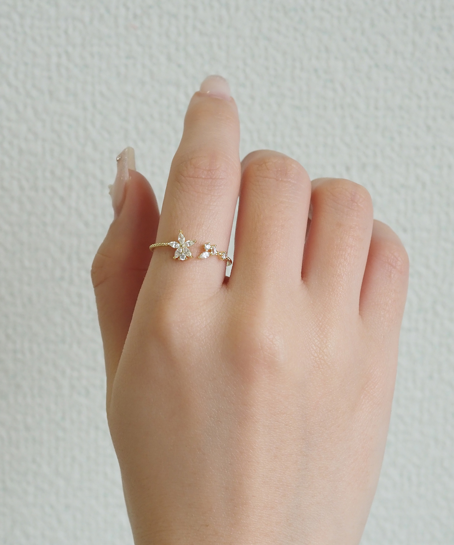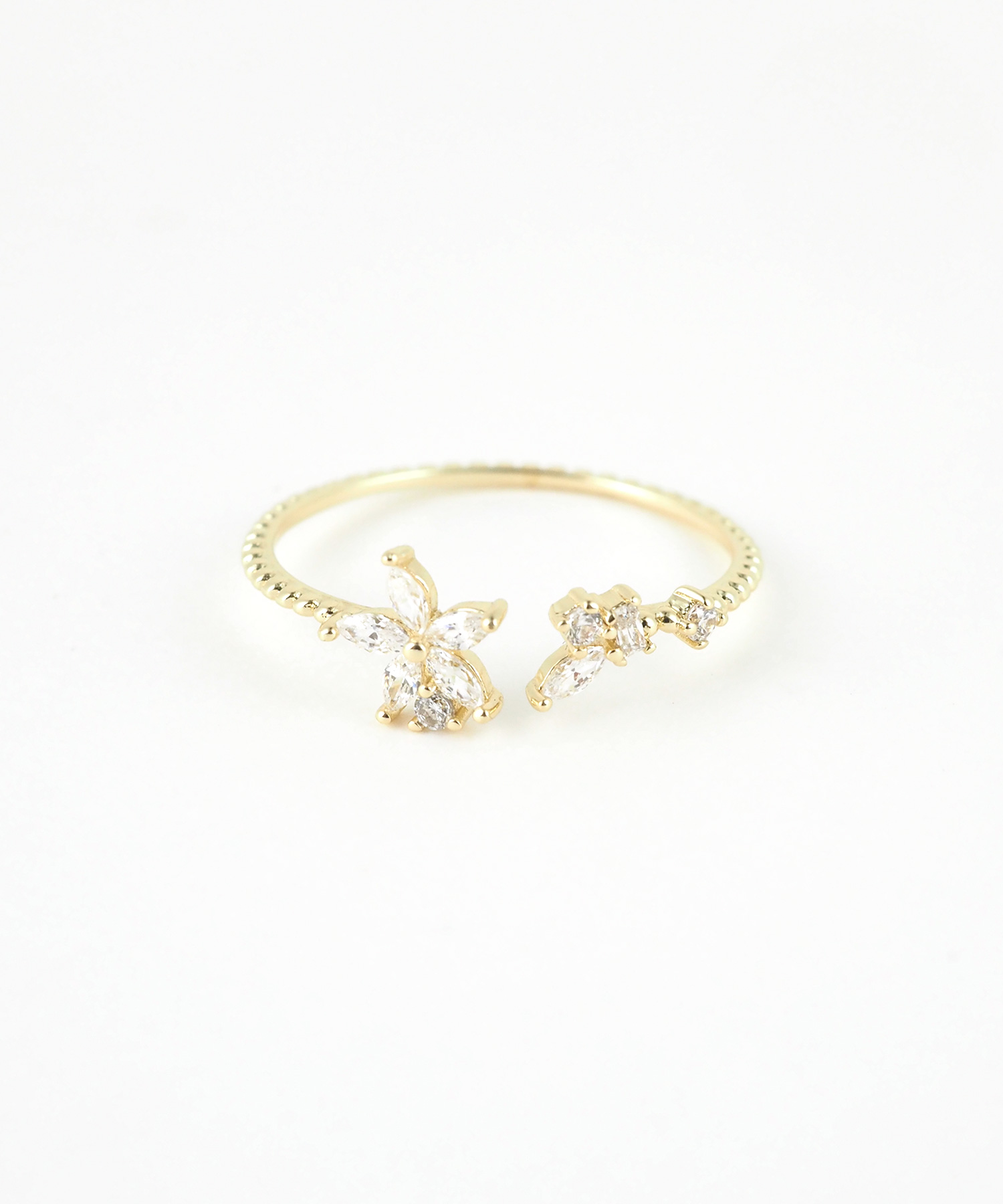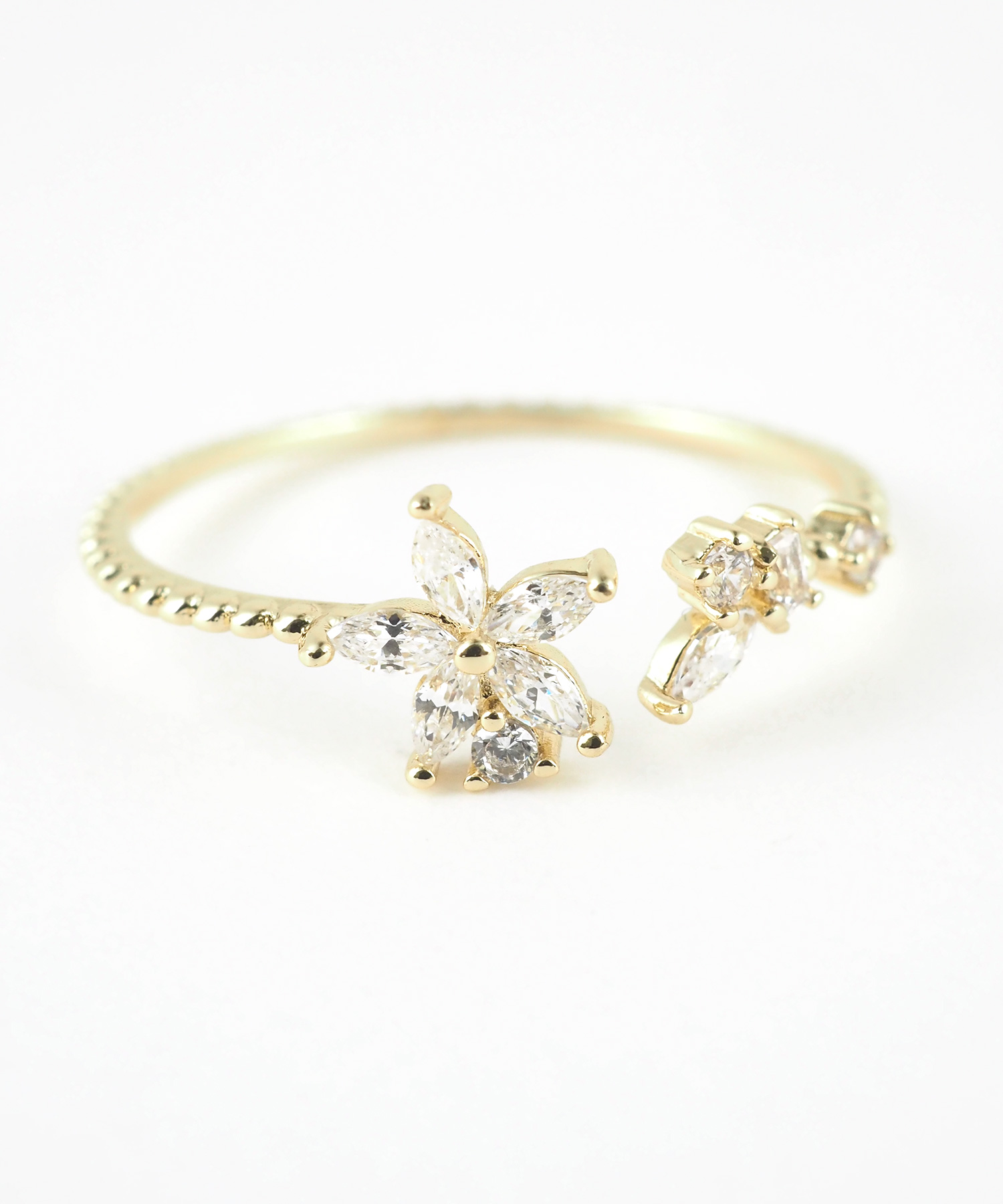 可憐なフラワーモチーフがフェミニンな印象のオープンリング。光を受けるたびにキュービックジルコニアがキラキラと輝き、手元を華やかに演出。細身のデザインアームが、指をより細く、美しく見せてくれます。