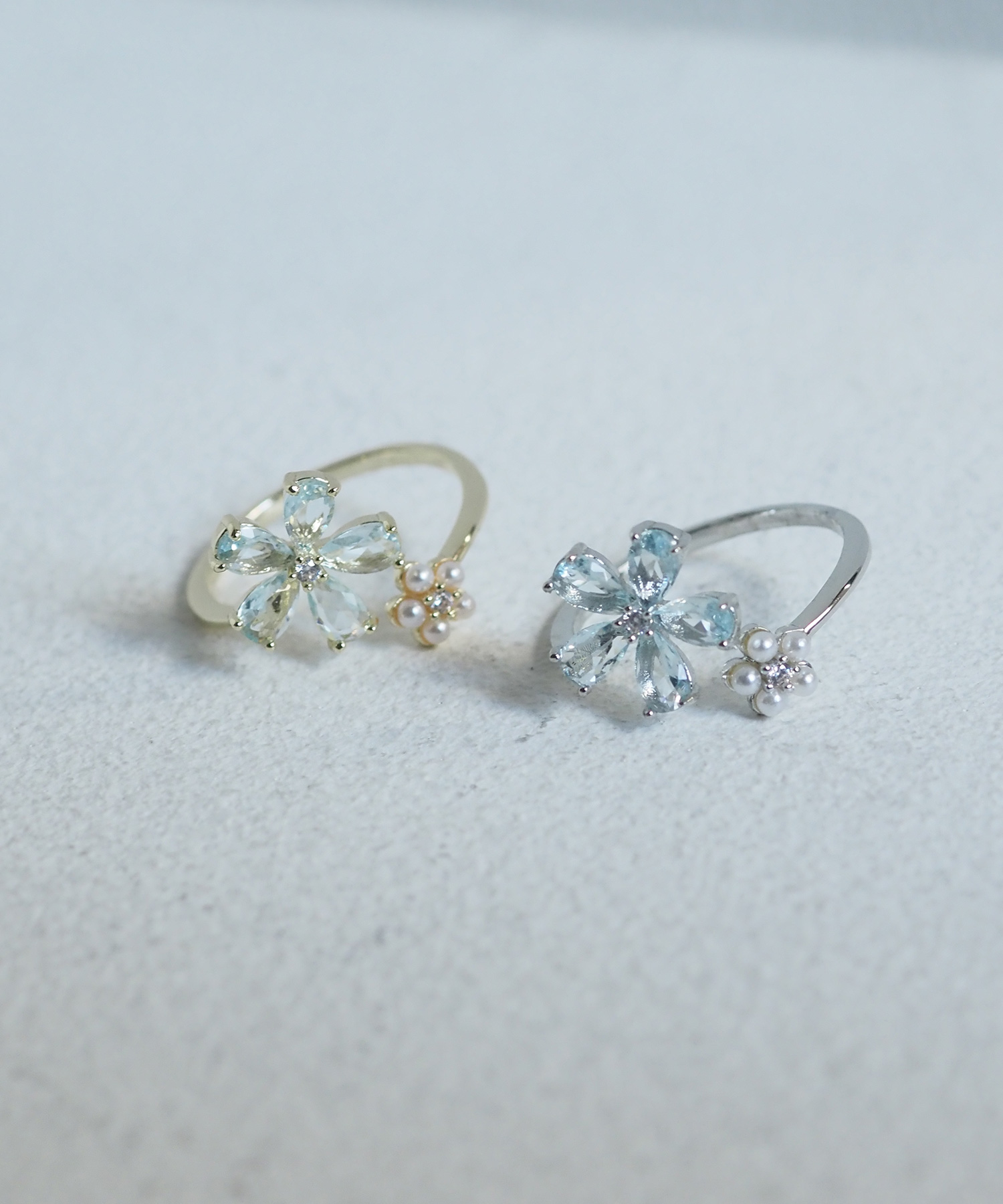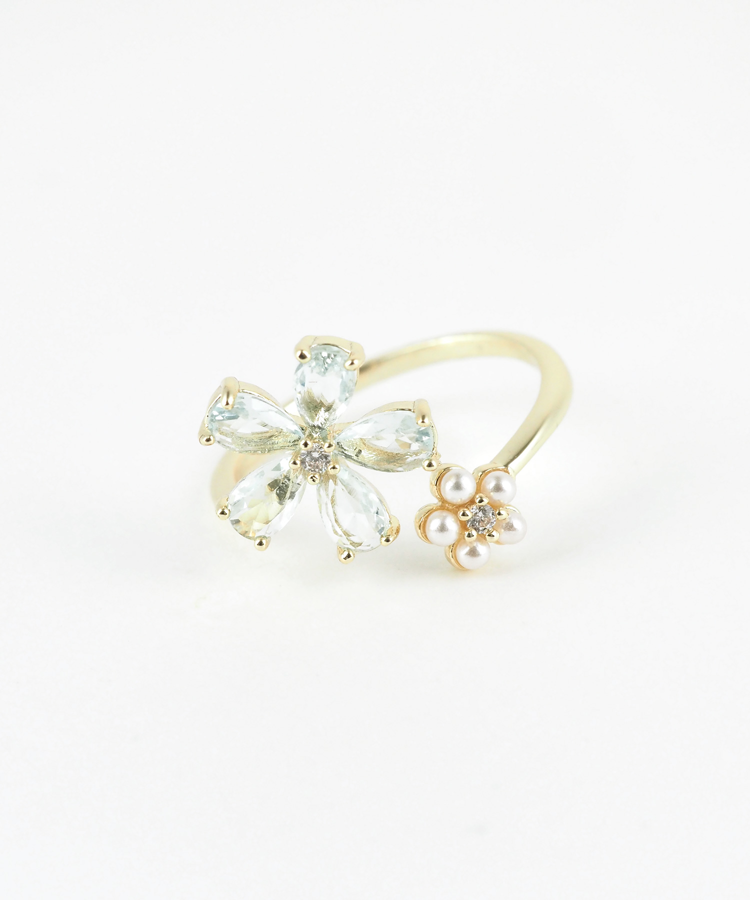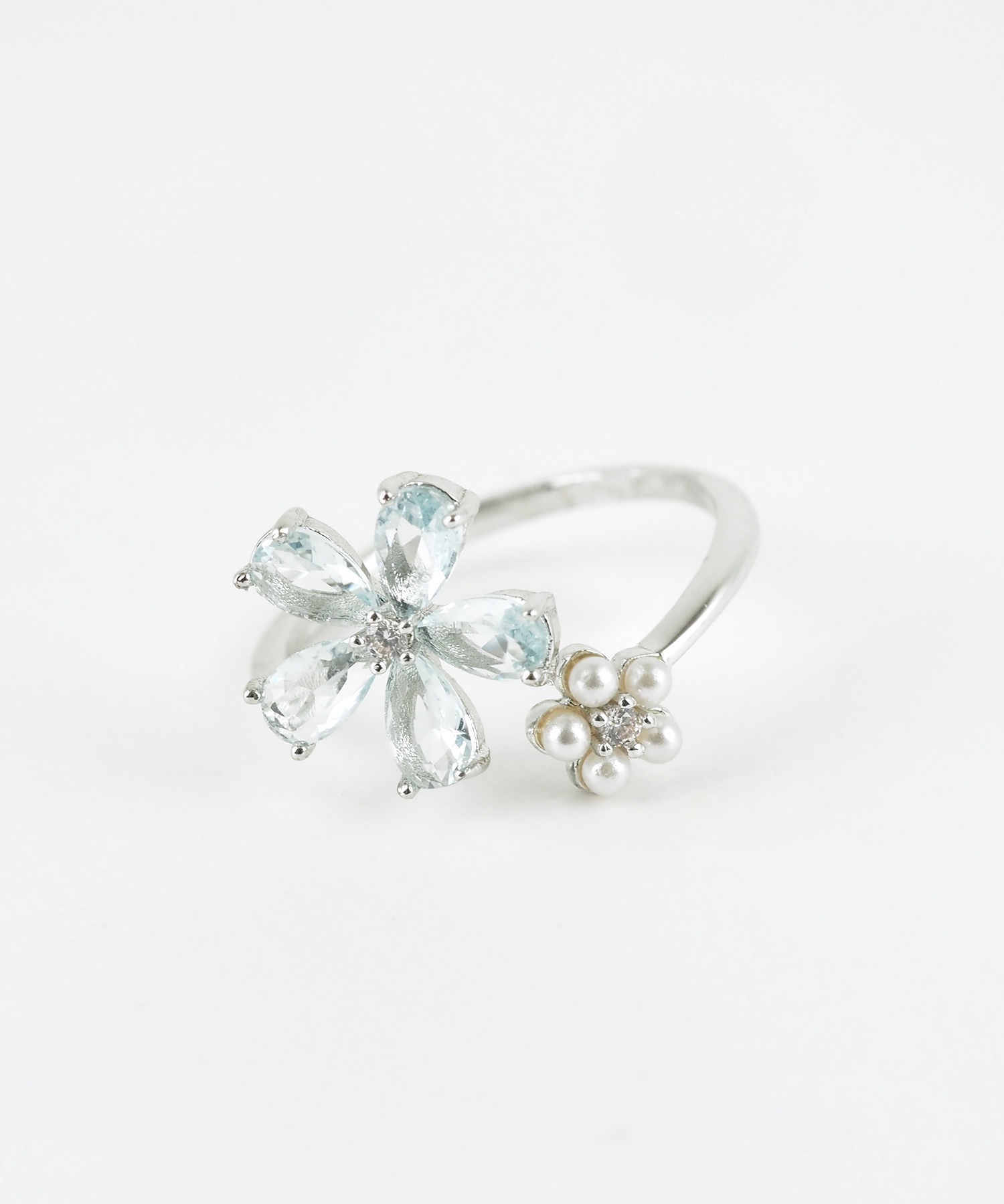ブルーキュービックとパールの花モチーフが美しい、透明感あふれるフォークリング。 質感の異なる二つの花が、手元をすっきりと知的に彩ります。程よい抜け感で、日常に爽やかな輝きを添えるアイテムです。