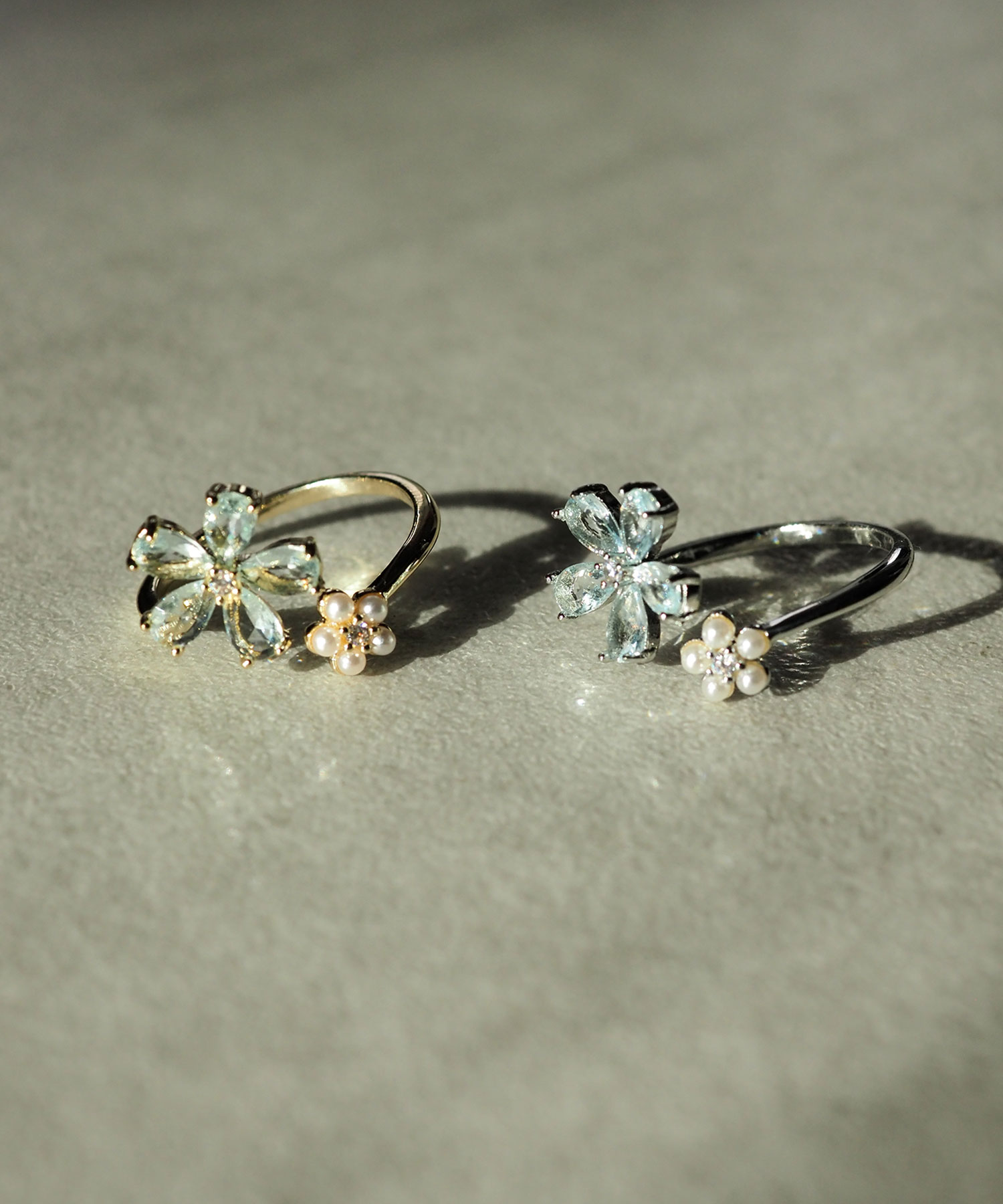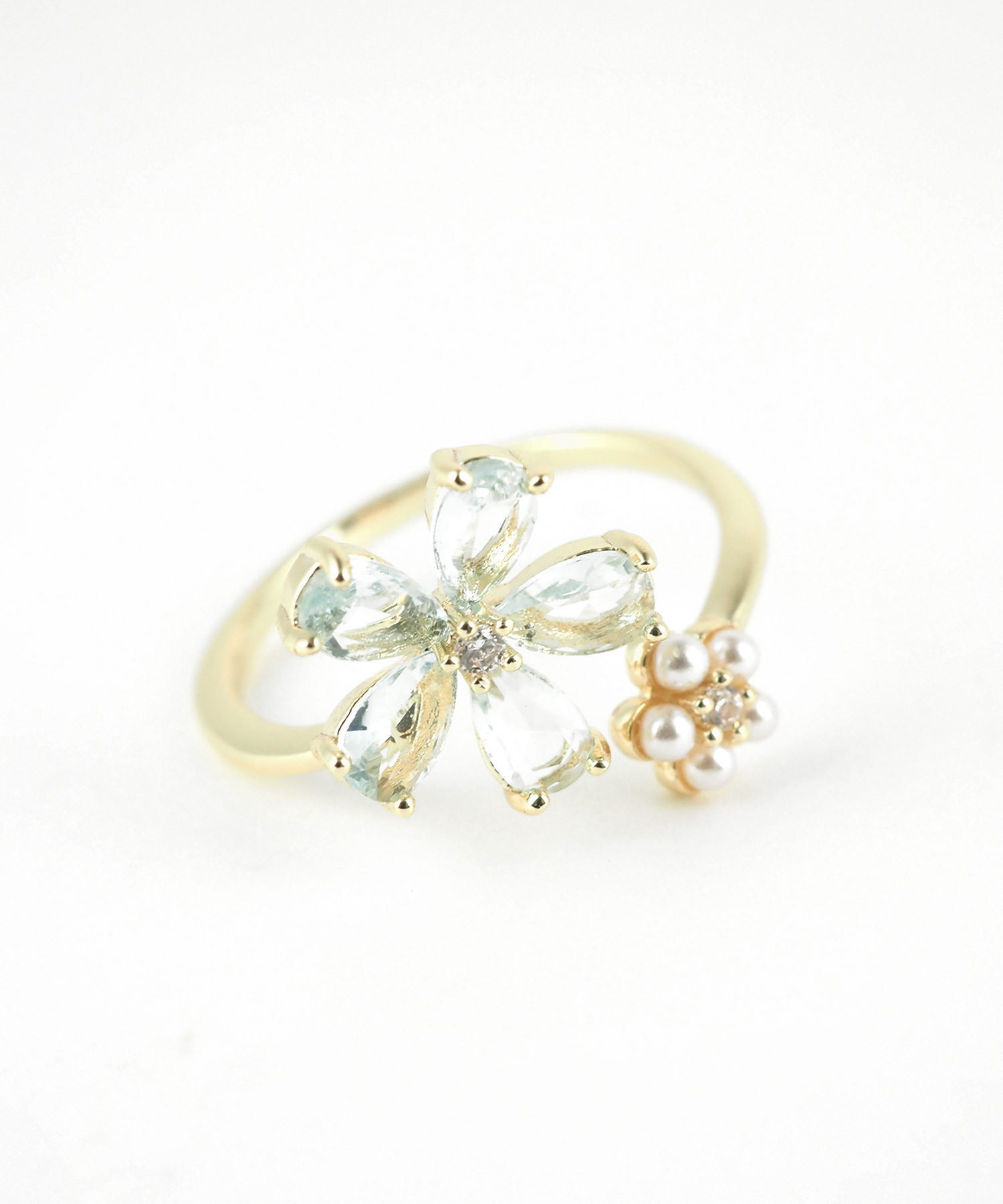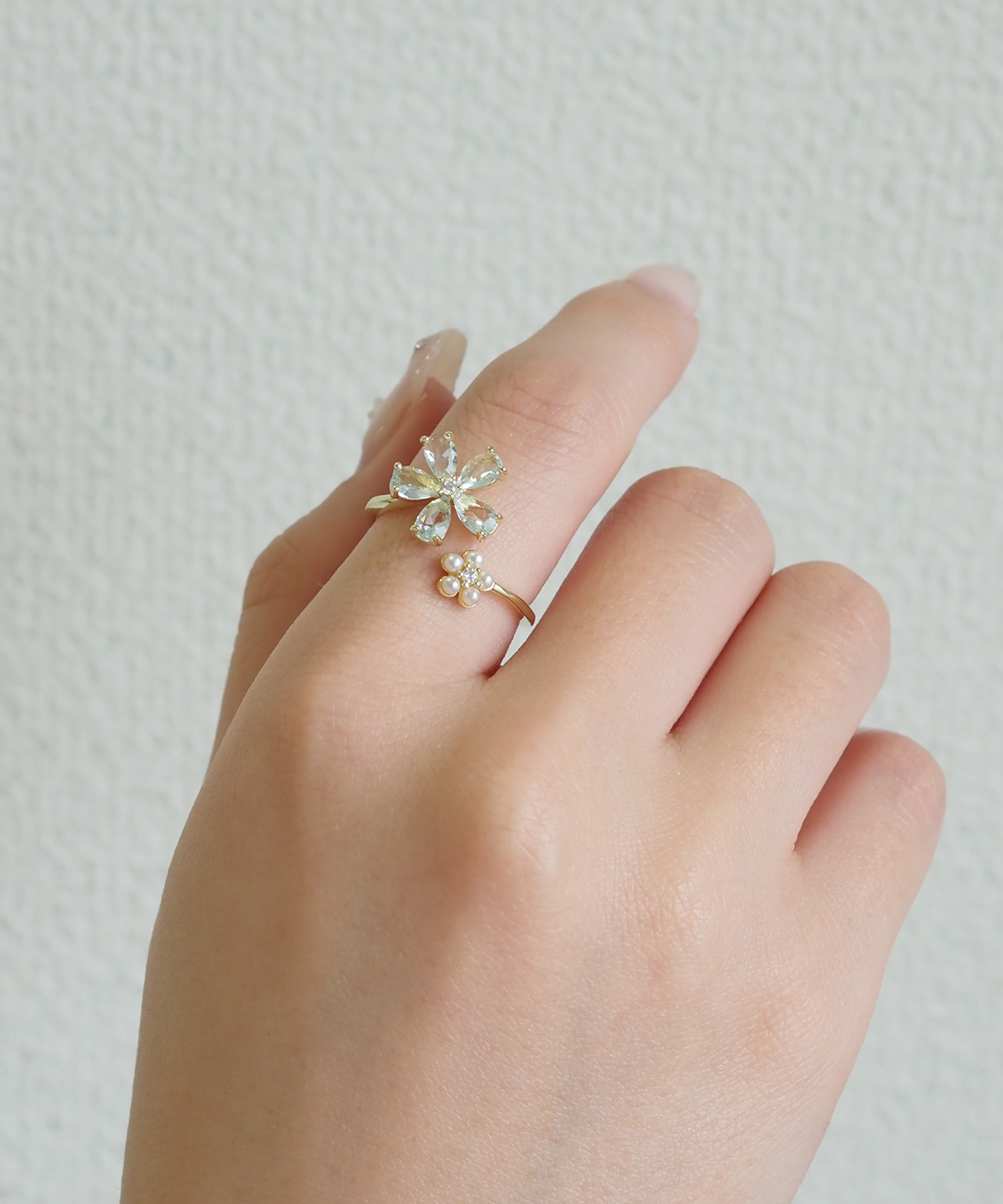 ブルーキュービックとパールの花モチーフが美しい、透明感あふれるフォークリング。 質感の異なる二つの花が、手元をすっきりと知的に彩ります。程よい抜け感で、日常に爽やかな輝きを添えるアイテムです。