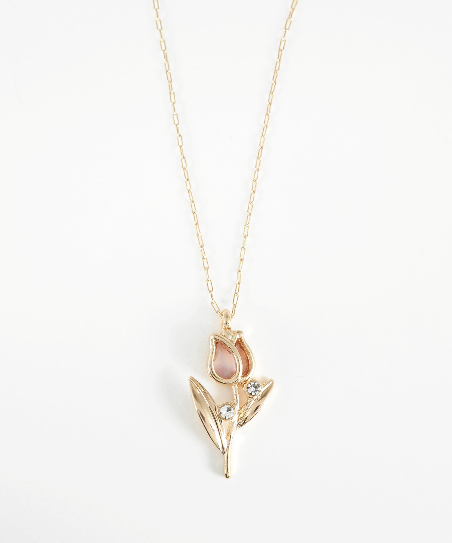 一輪のチューリップが清楚でとても可愛いネックレス。 艶やかな花びらとビジューの輝きがエレガントで優しく、首元を女性らしく柔らかな印象に仕上げてくれます。 チューリップの可憐さと、ラインストーンの上品さが互いの魅力を引き立て合うデザインです。