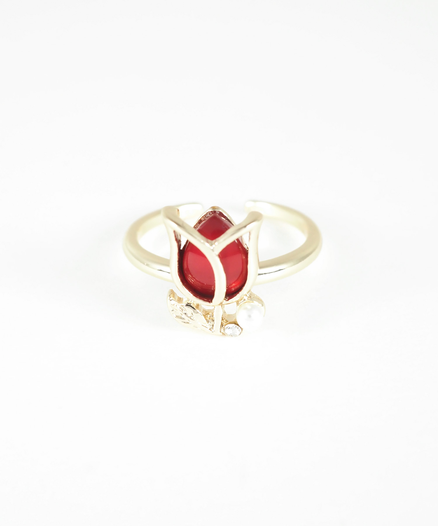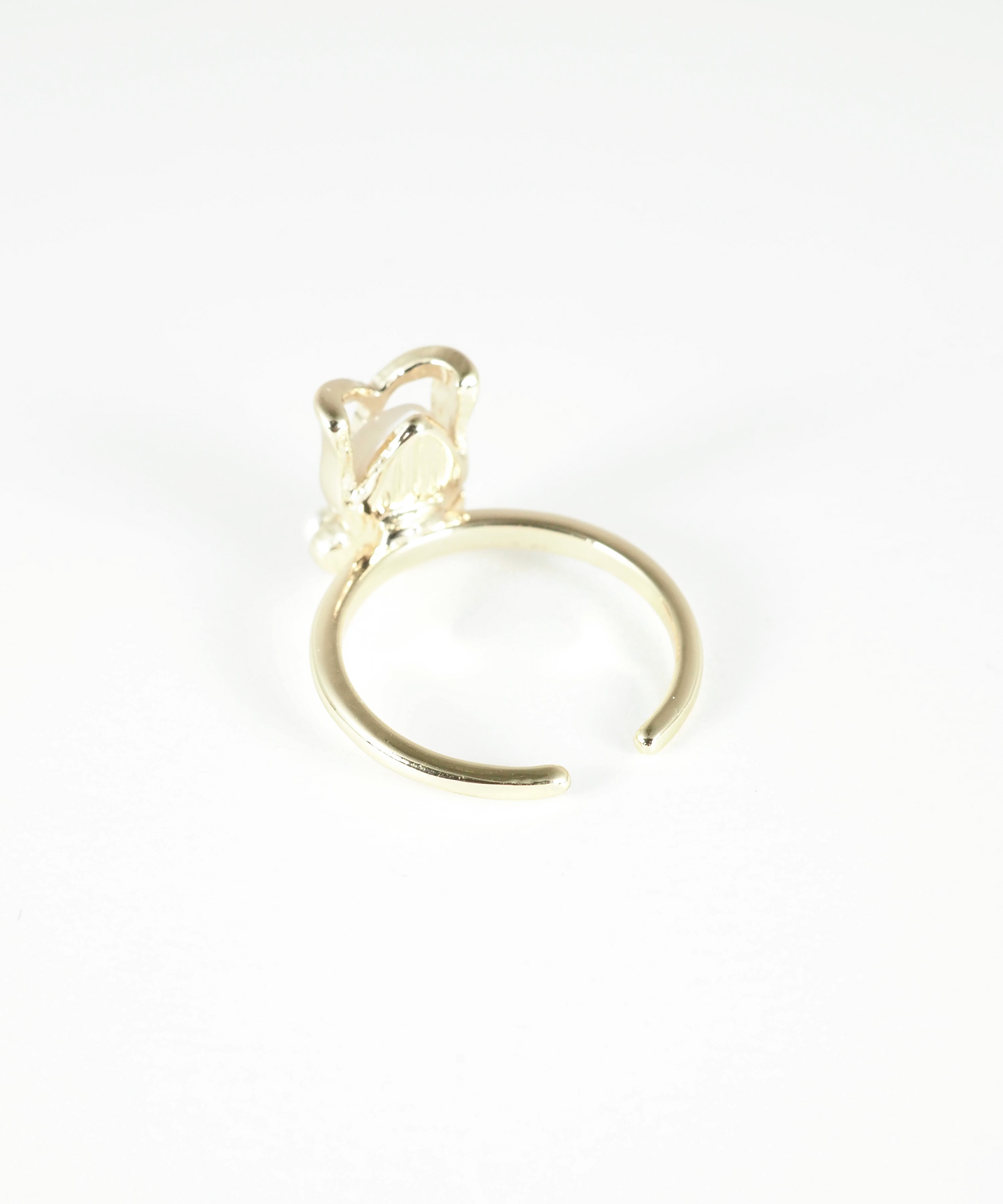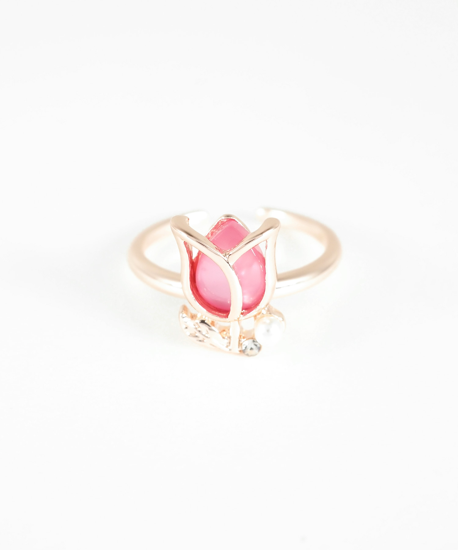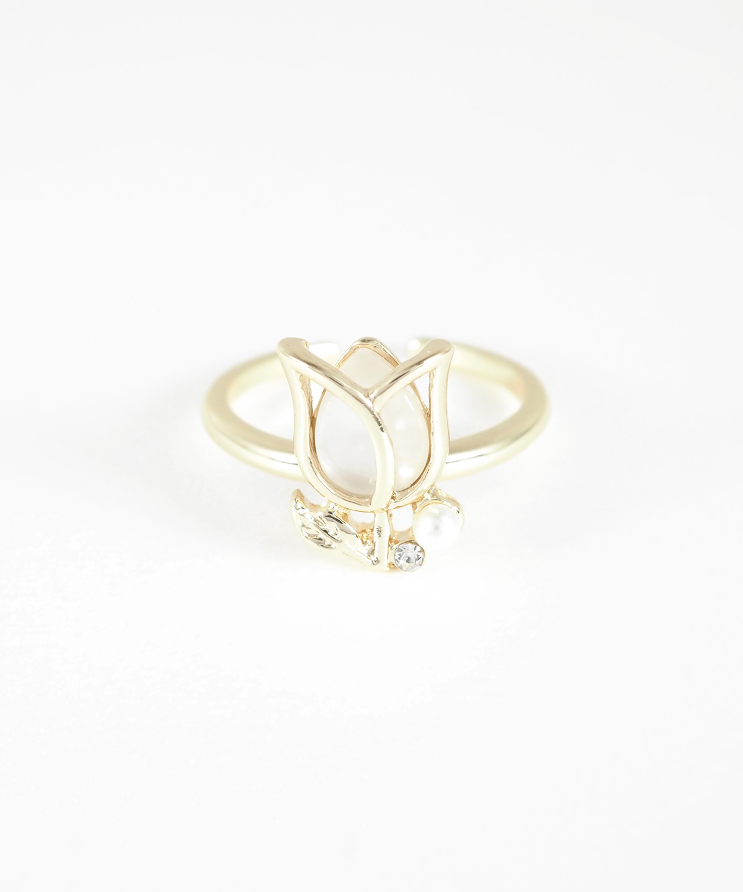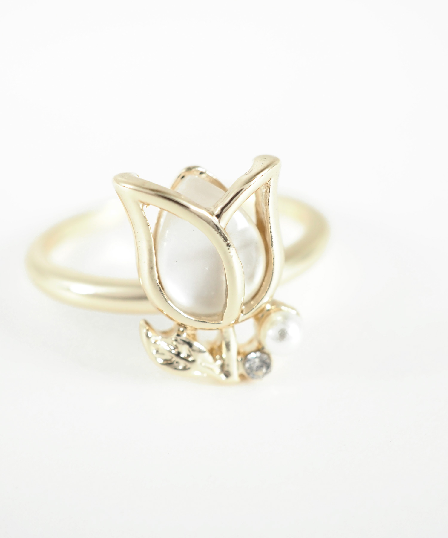 可憐に咲くチューリップをモチーフにした、手元を華やかに彩るリング。キャッツアイ調ストーンの柔らかな光沢に、パールとビジューを添えて上品に仕上げました。