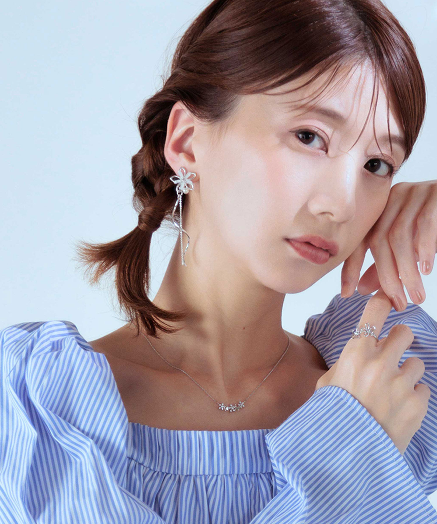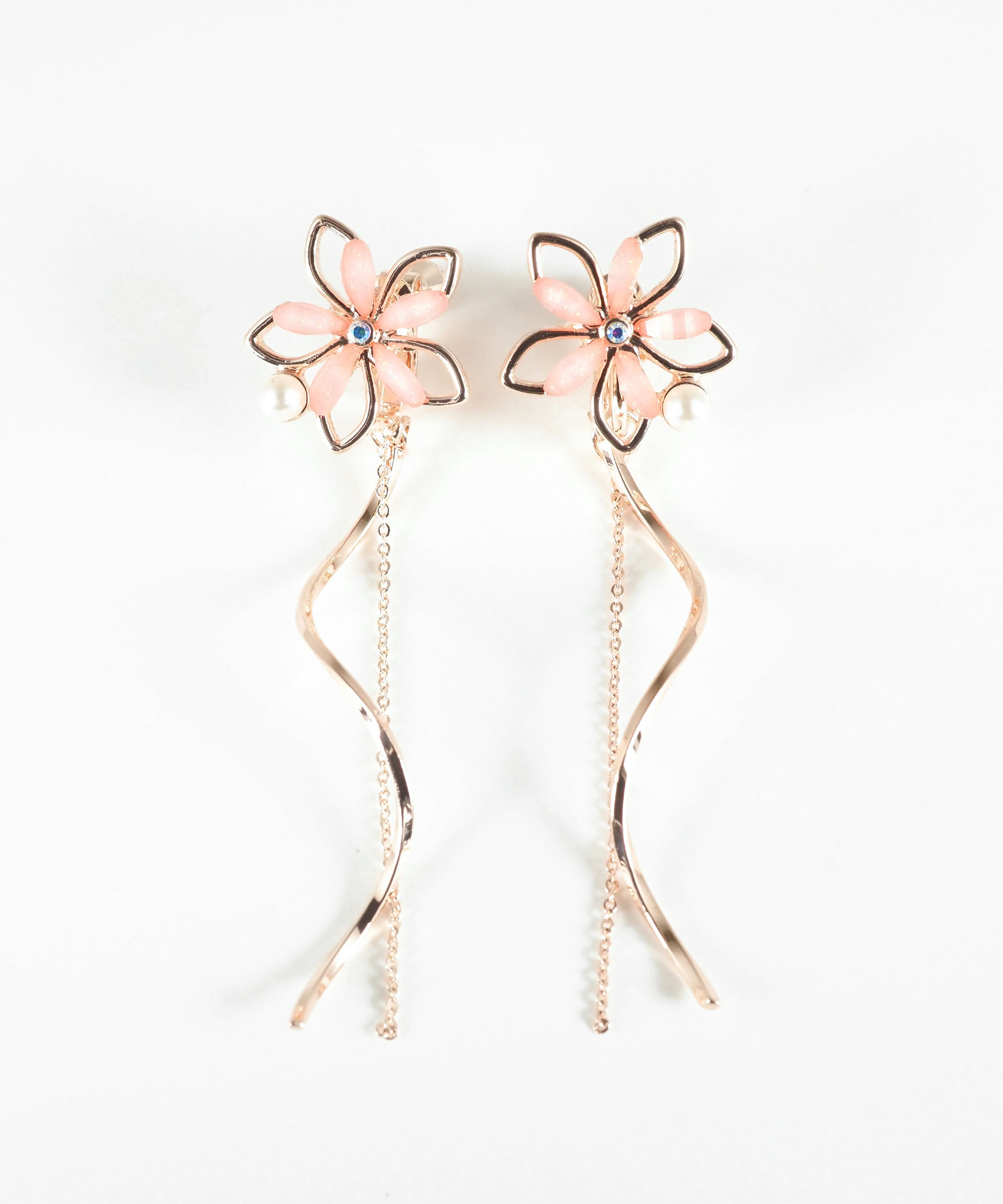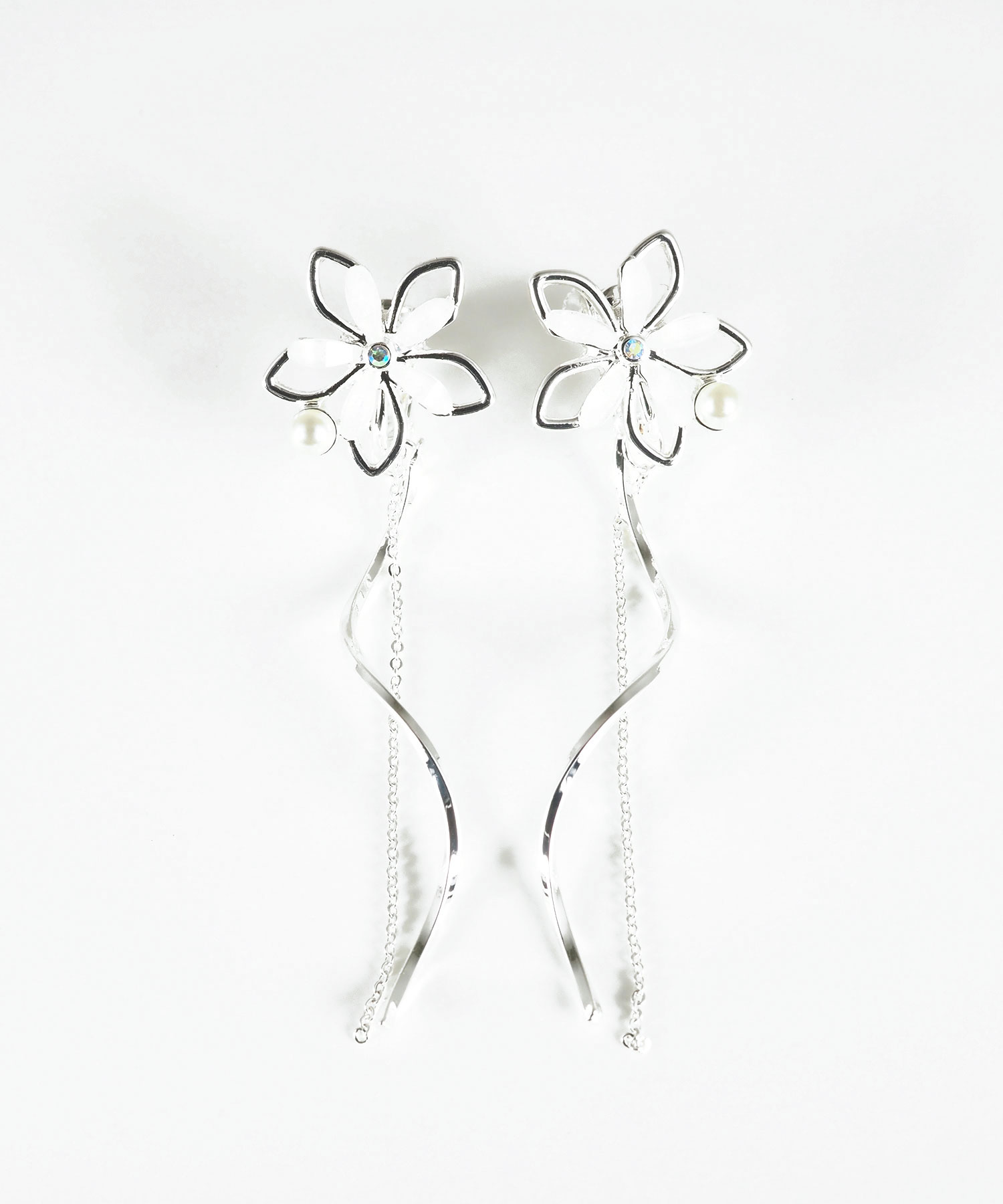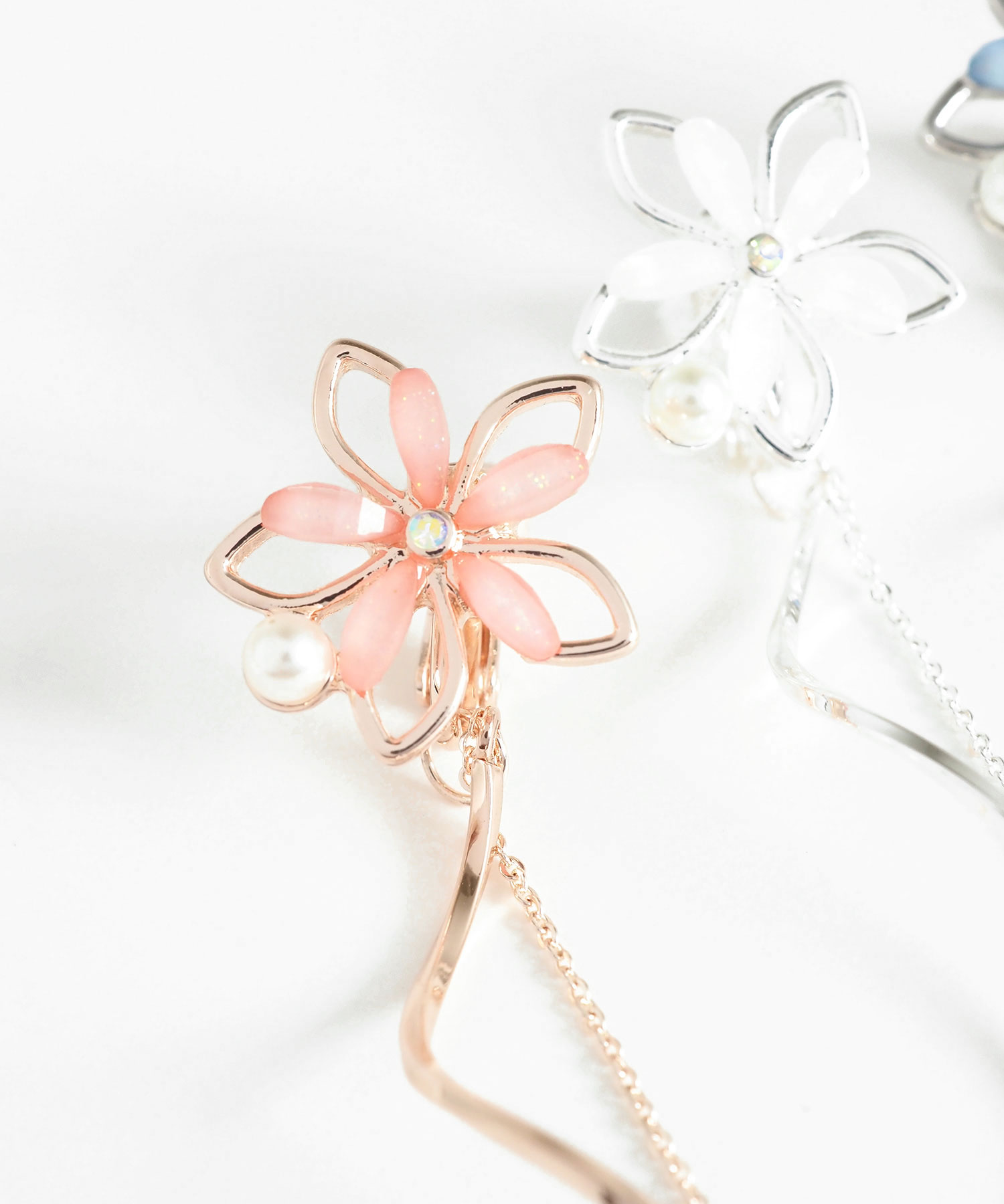 透き通るような花びらにパールとビジューを添えた、可憐な表情のイヤリング。耳元から美しく描かれるウェーブラインと、細やかに揺れるチェーンが、お顔周りにドラマチックな動きをプラスします。
