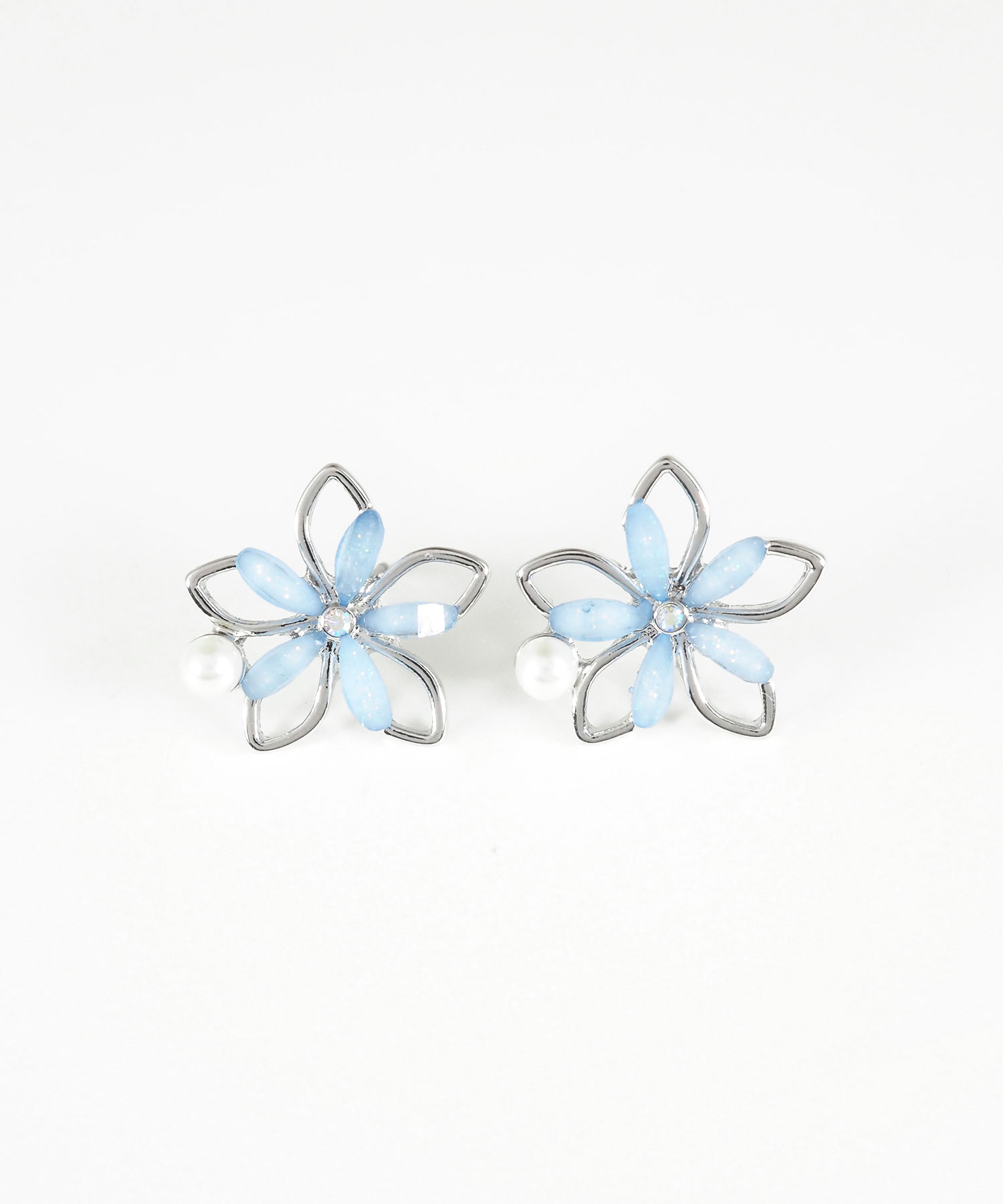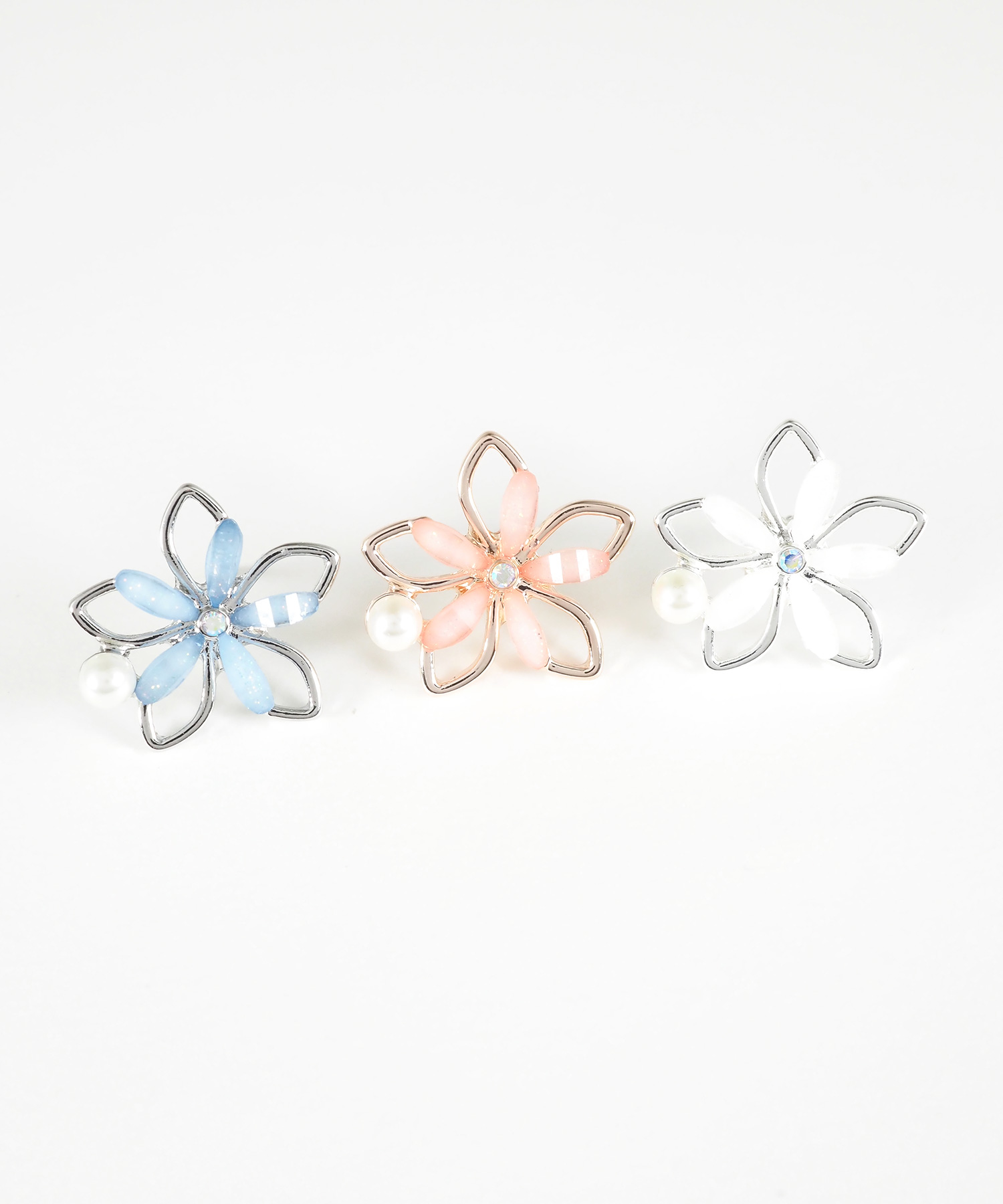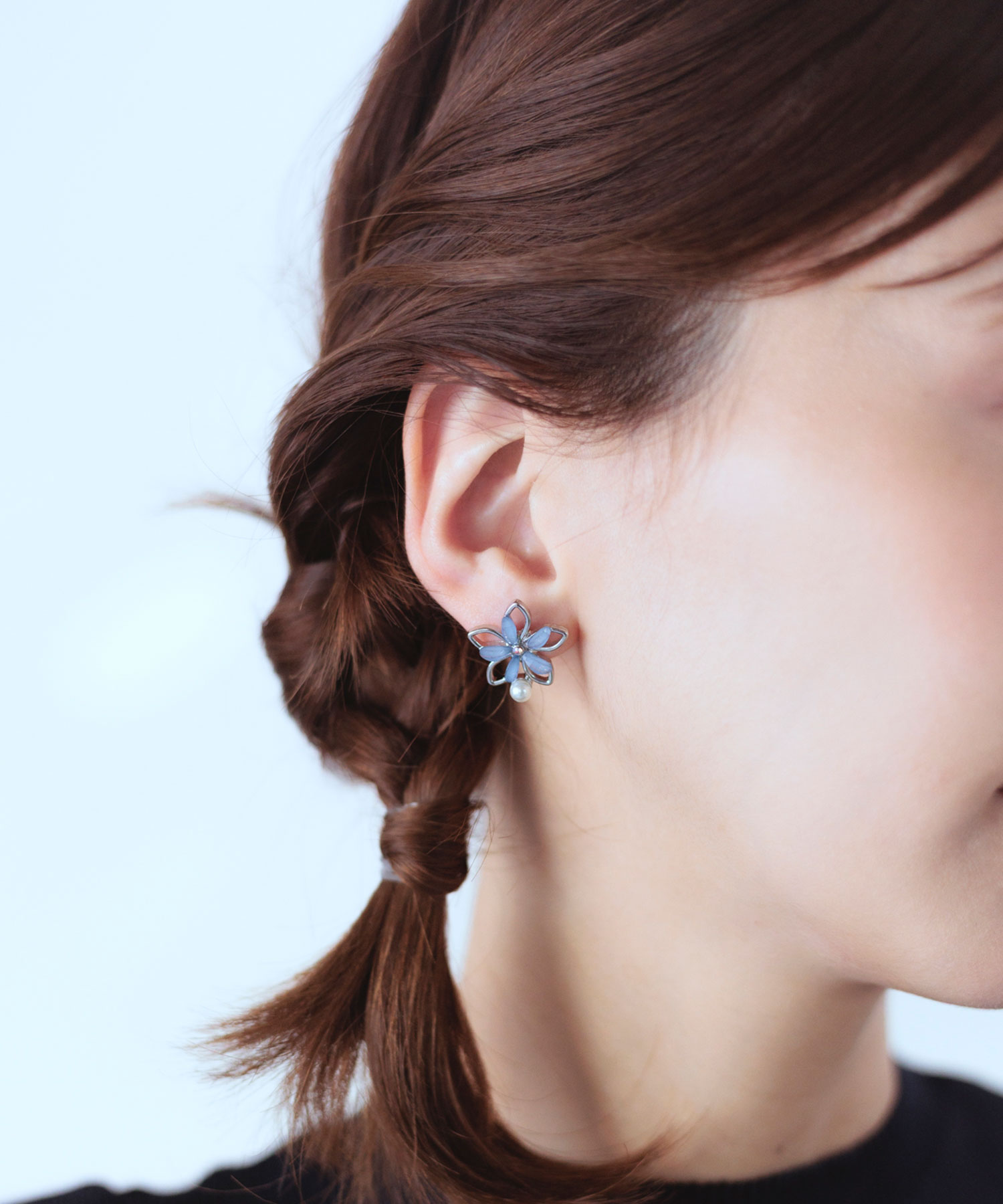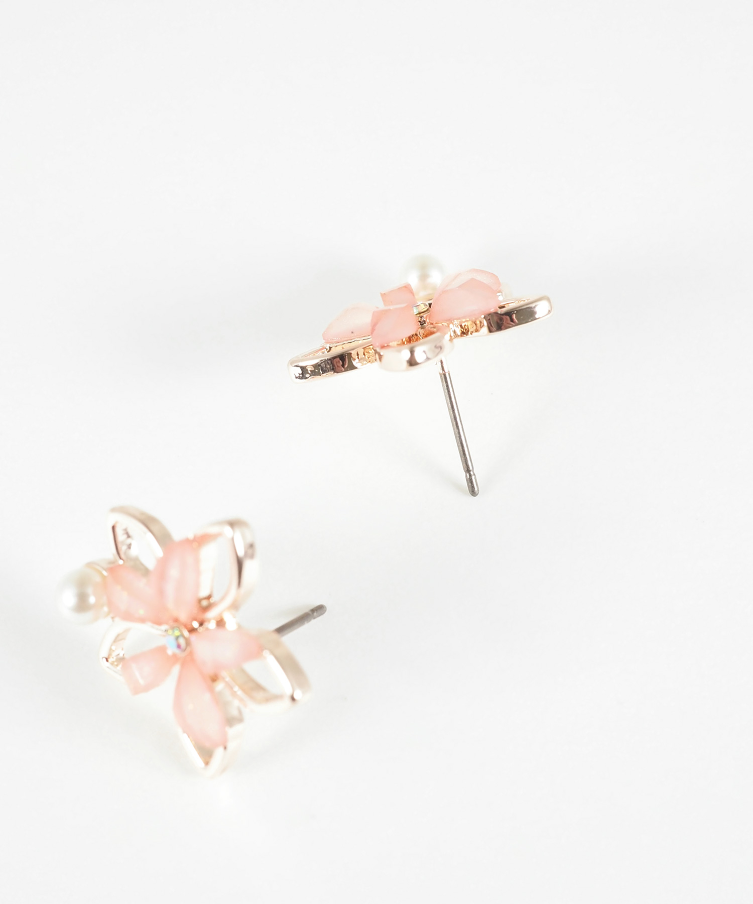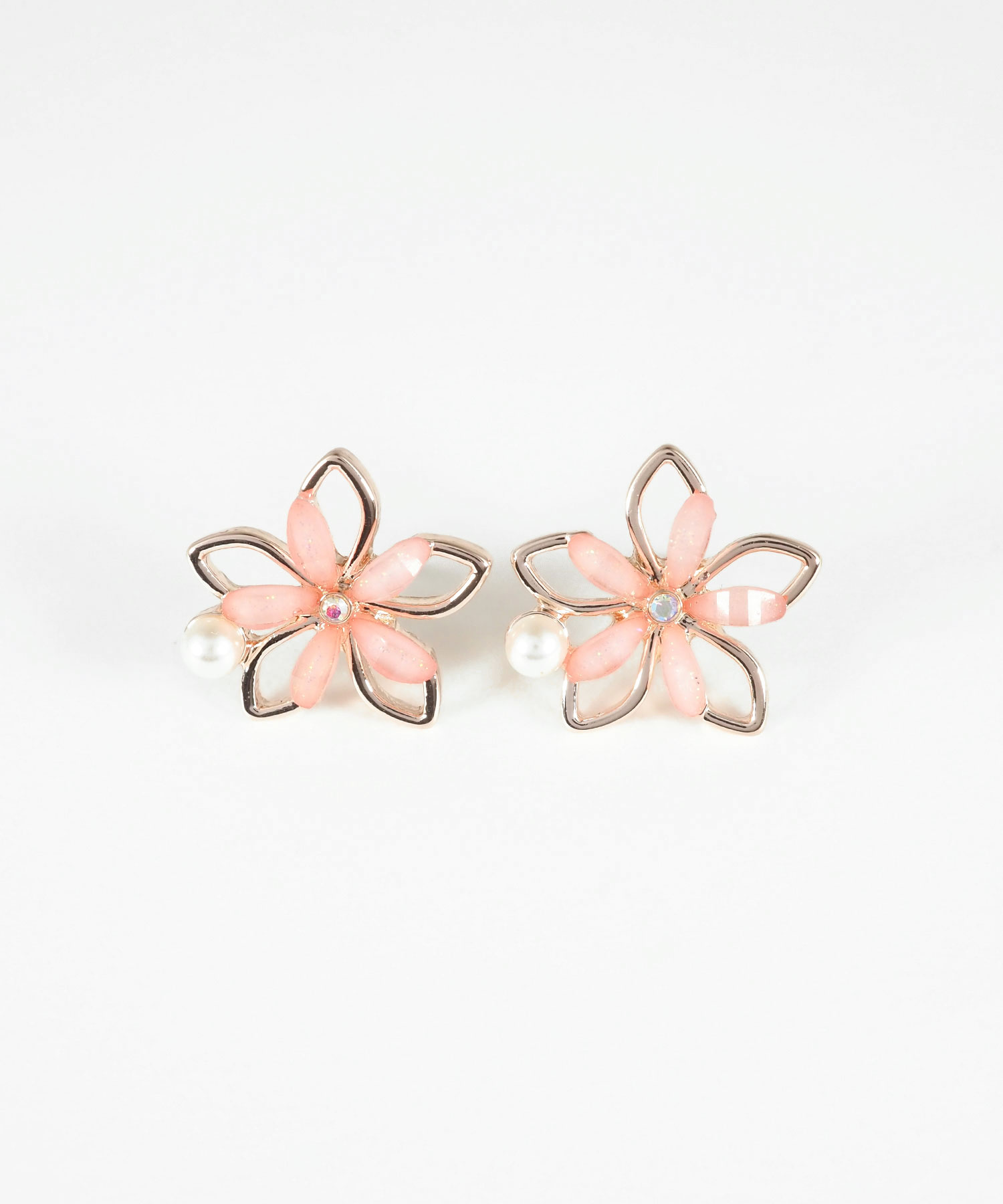 透き通るような花びらにパールとビジューを添えた、可憐なフラワーモチーフのピアス。 耳元にぴたっと寄り添うサイズ感ながら、奥行きのある輝きがお顔周りをパッと明るく華やかに演出します。ペアピアス(両耳用)です。