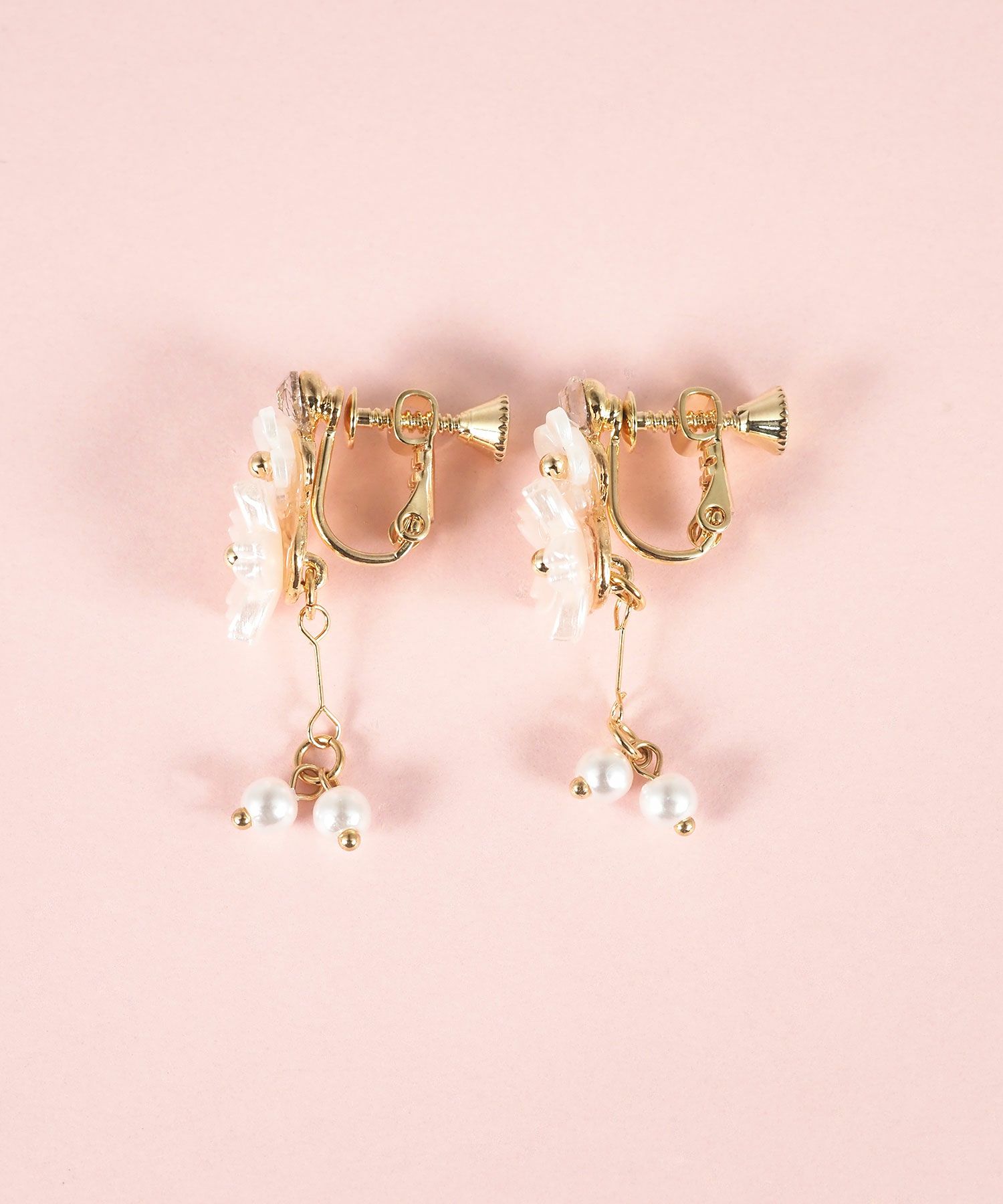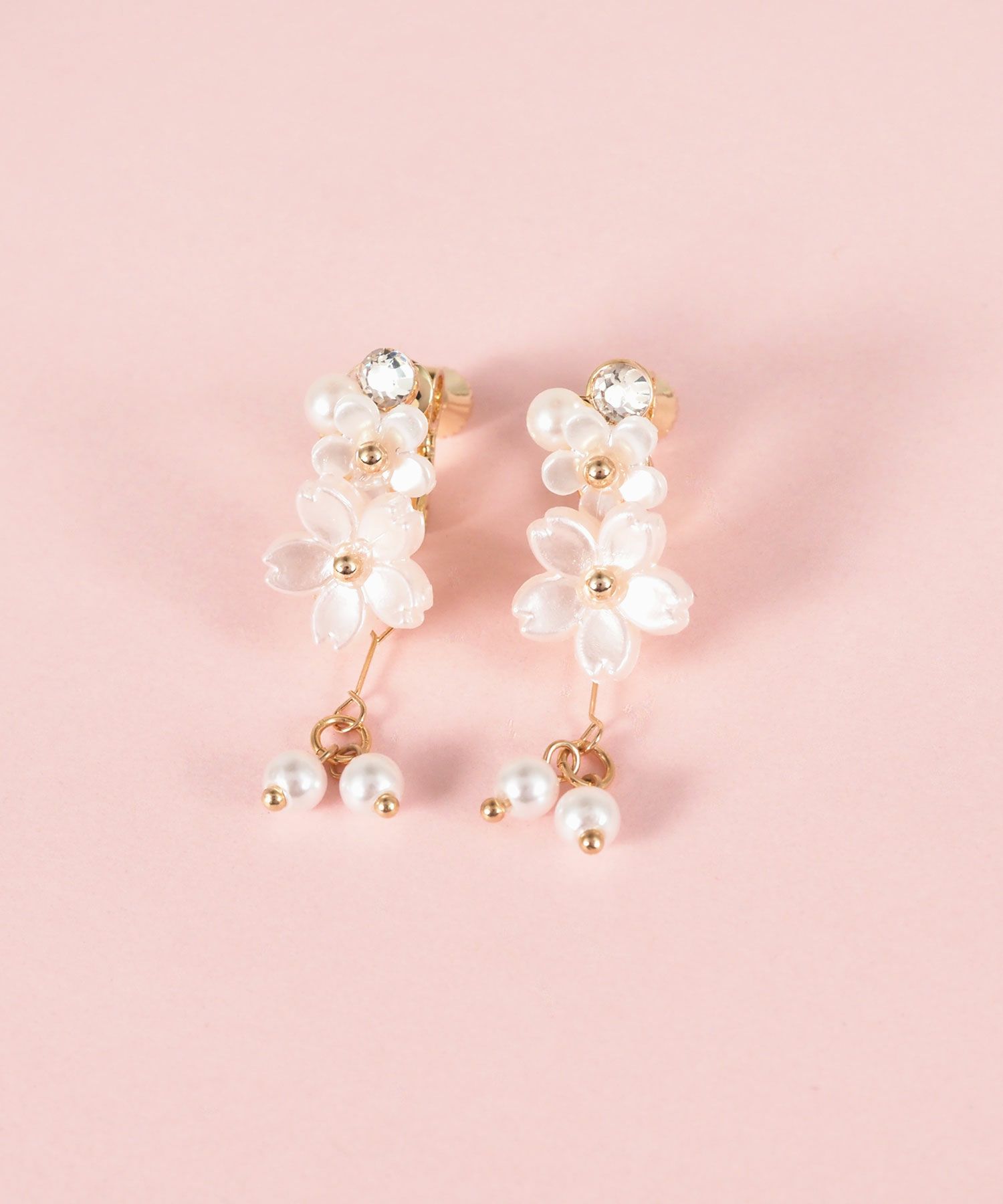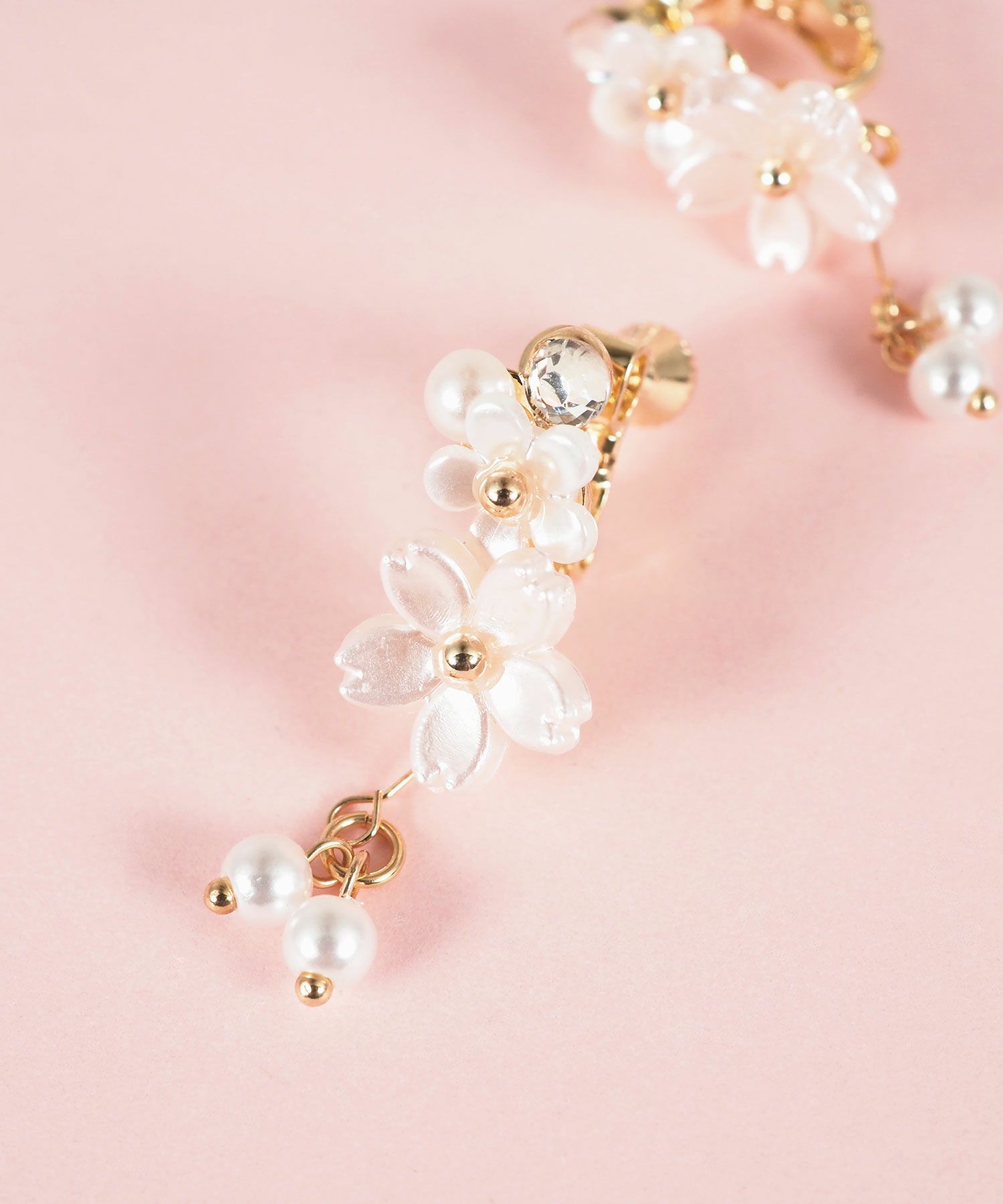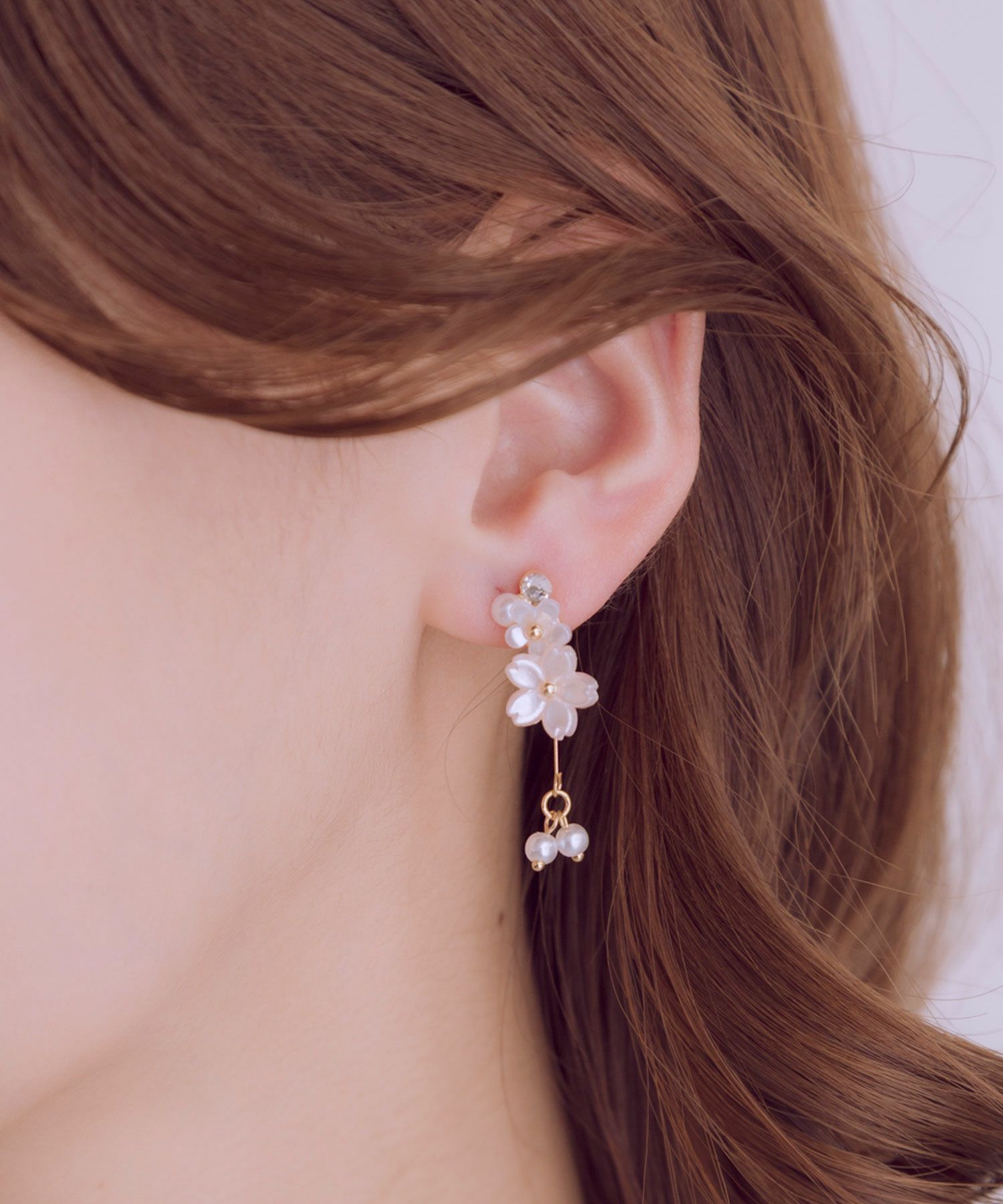 異なるトーンの桜色が織りなす、繊細で優美なデザインのイヤリング。満開の桜の花びらの下で純粋なパールが上品に揺らめきます。耳元に春の訪れと華やかさを添える、特別な日の装いにも日常使いにもぴったりのアイテム。