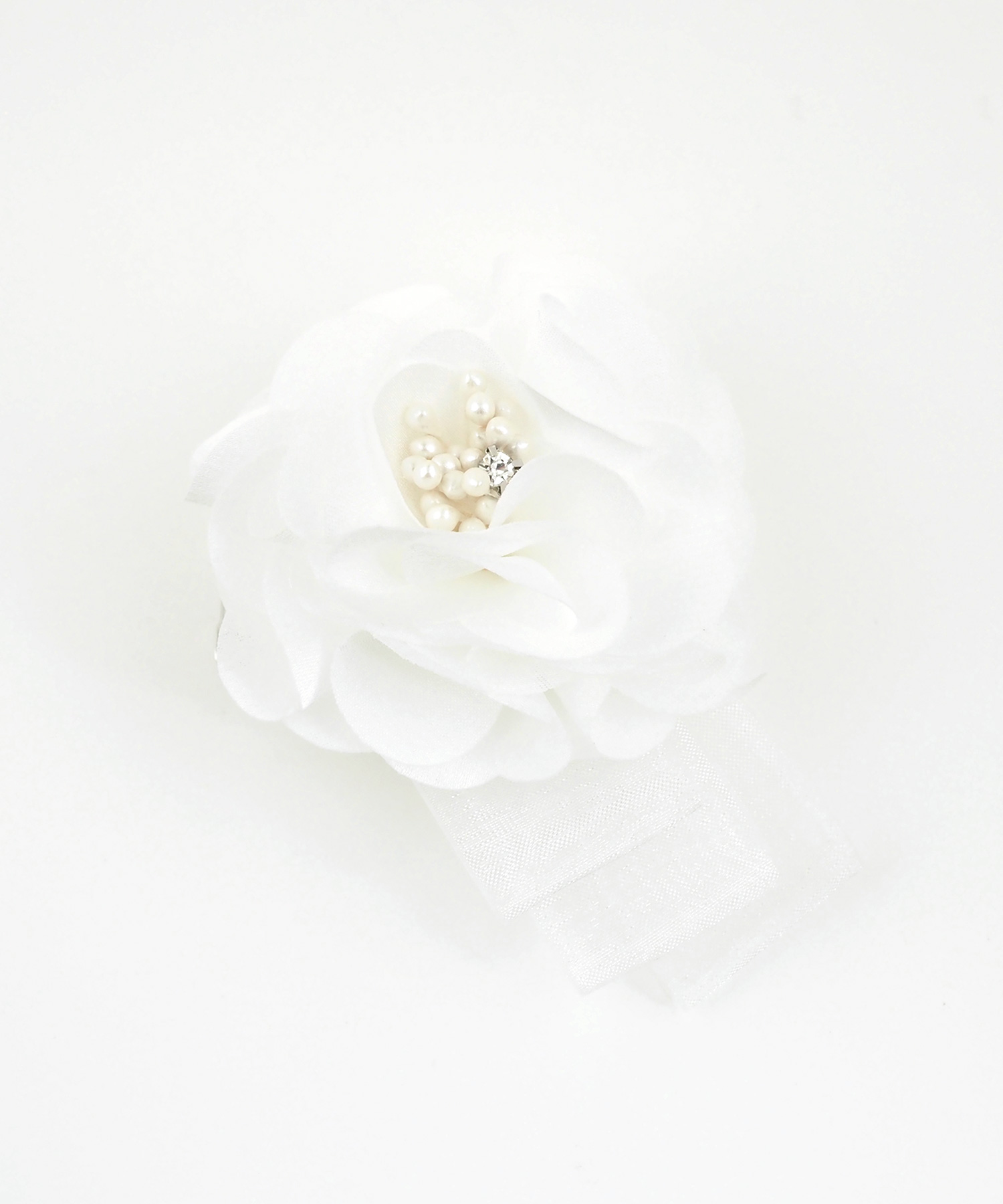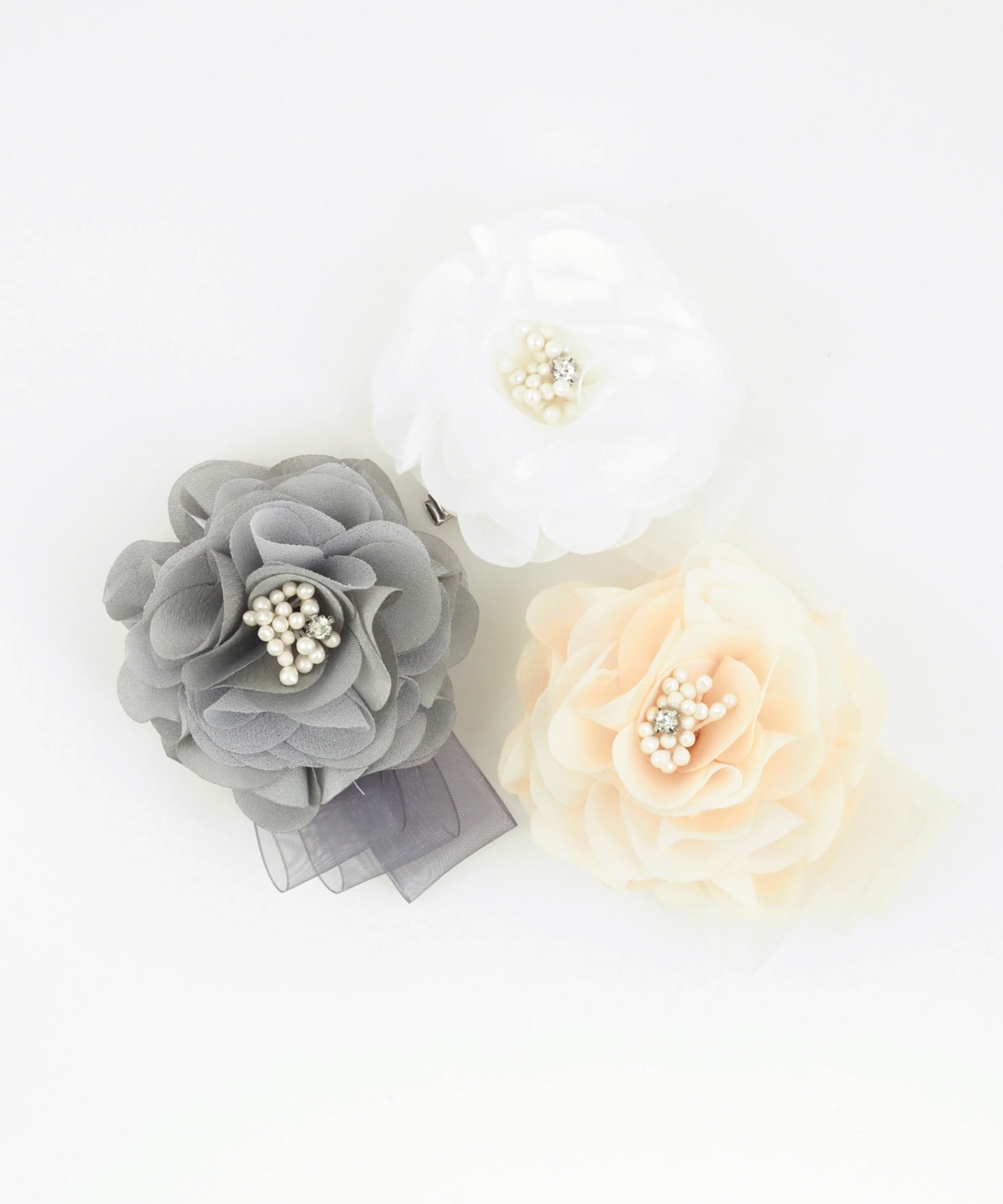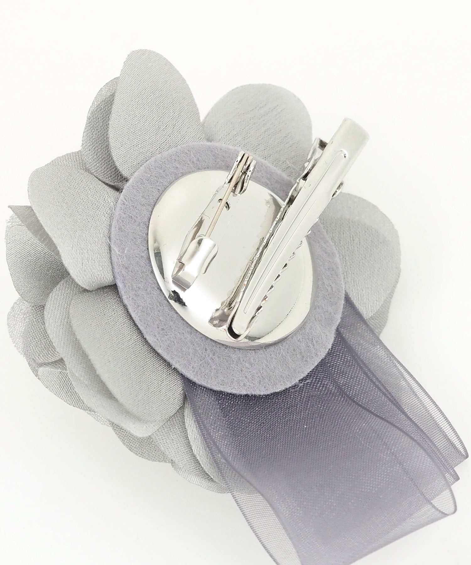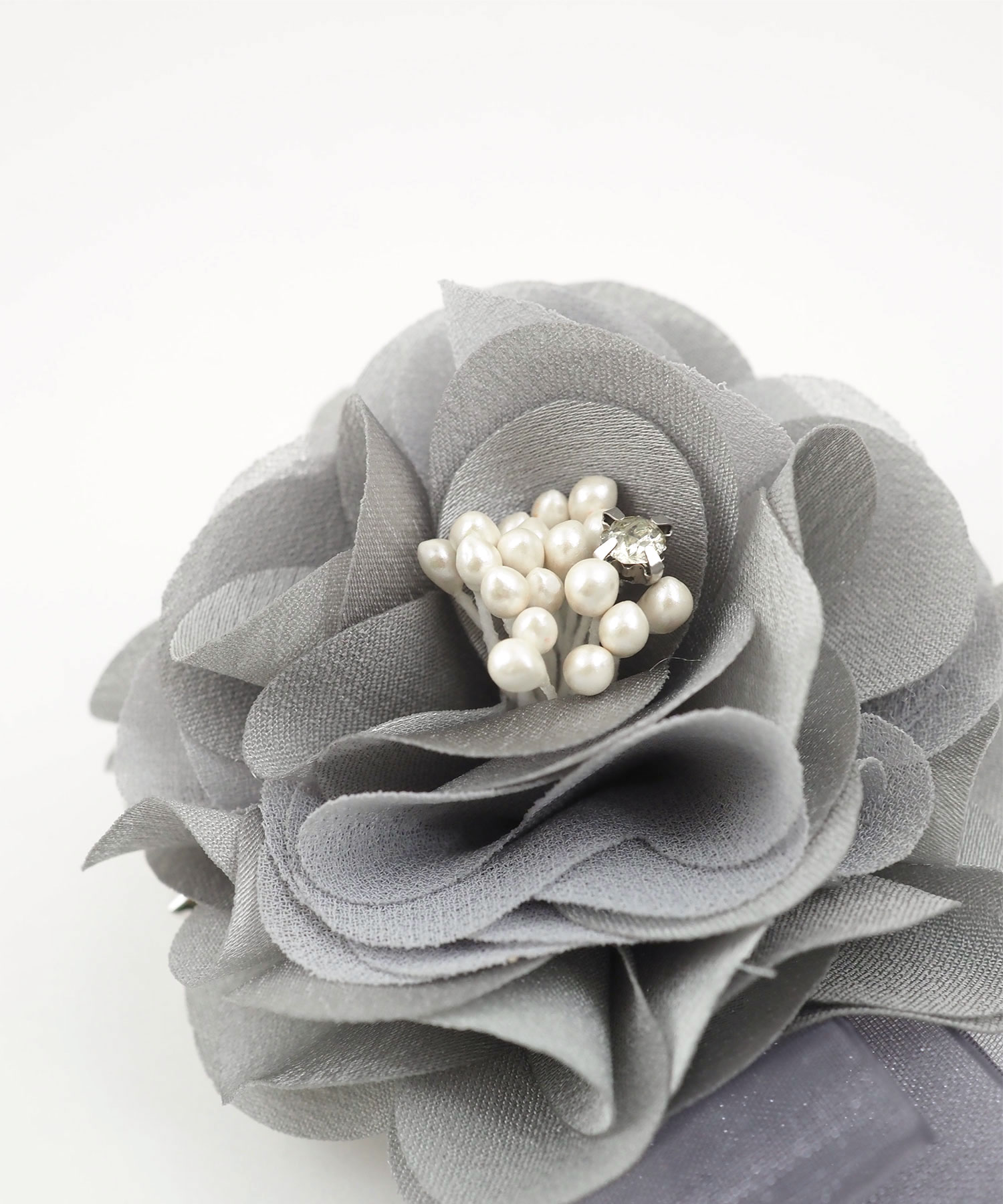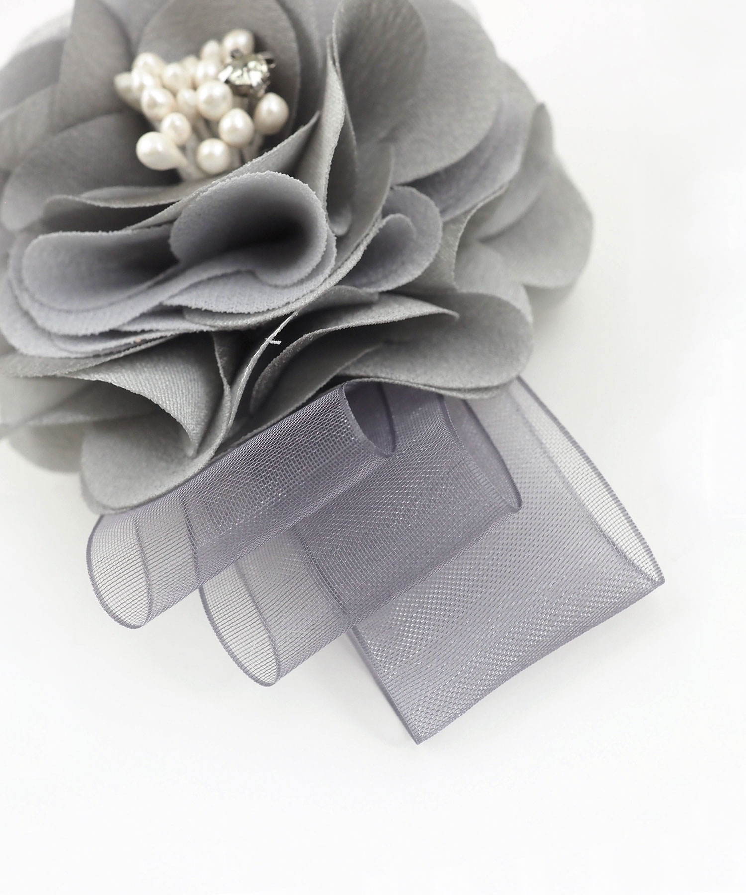 幾重にも重なる花びらと、流れるような3連リボンが目を引くコサージュ。花びらには程よいハリのある生地を使用し、型崩れを防ぎながら、凛とした気品漂うフォルムを美しくキープします。落ち着いたニュアンスカラーが、大切なセレモニーシーンにふさわしい華やぎを添えてくれる一品です。安全ピンとクリップの2way使用です。