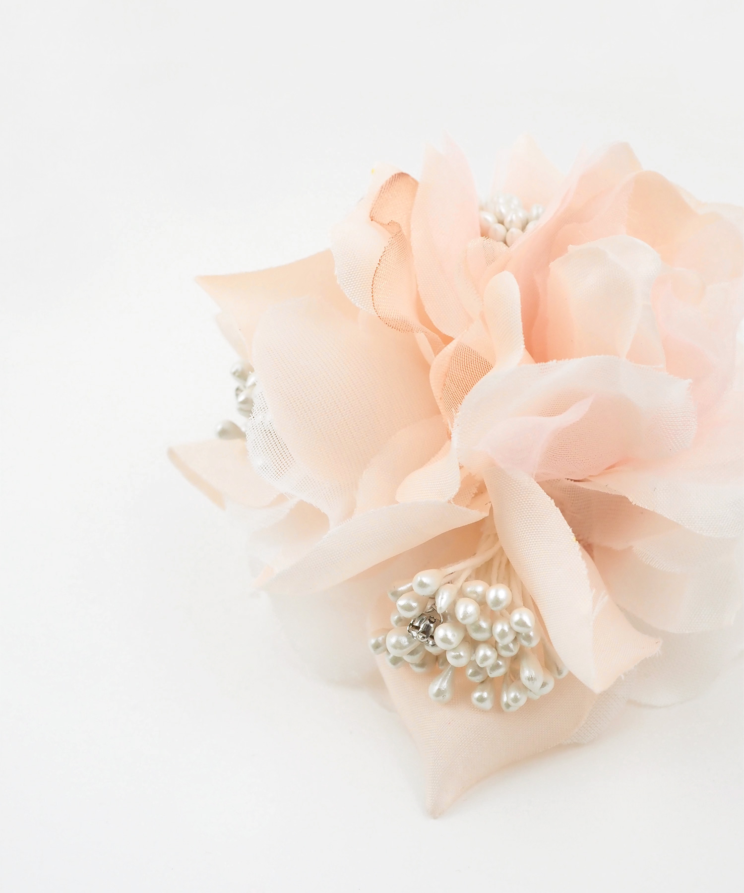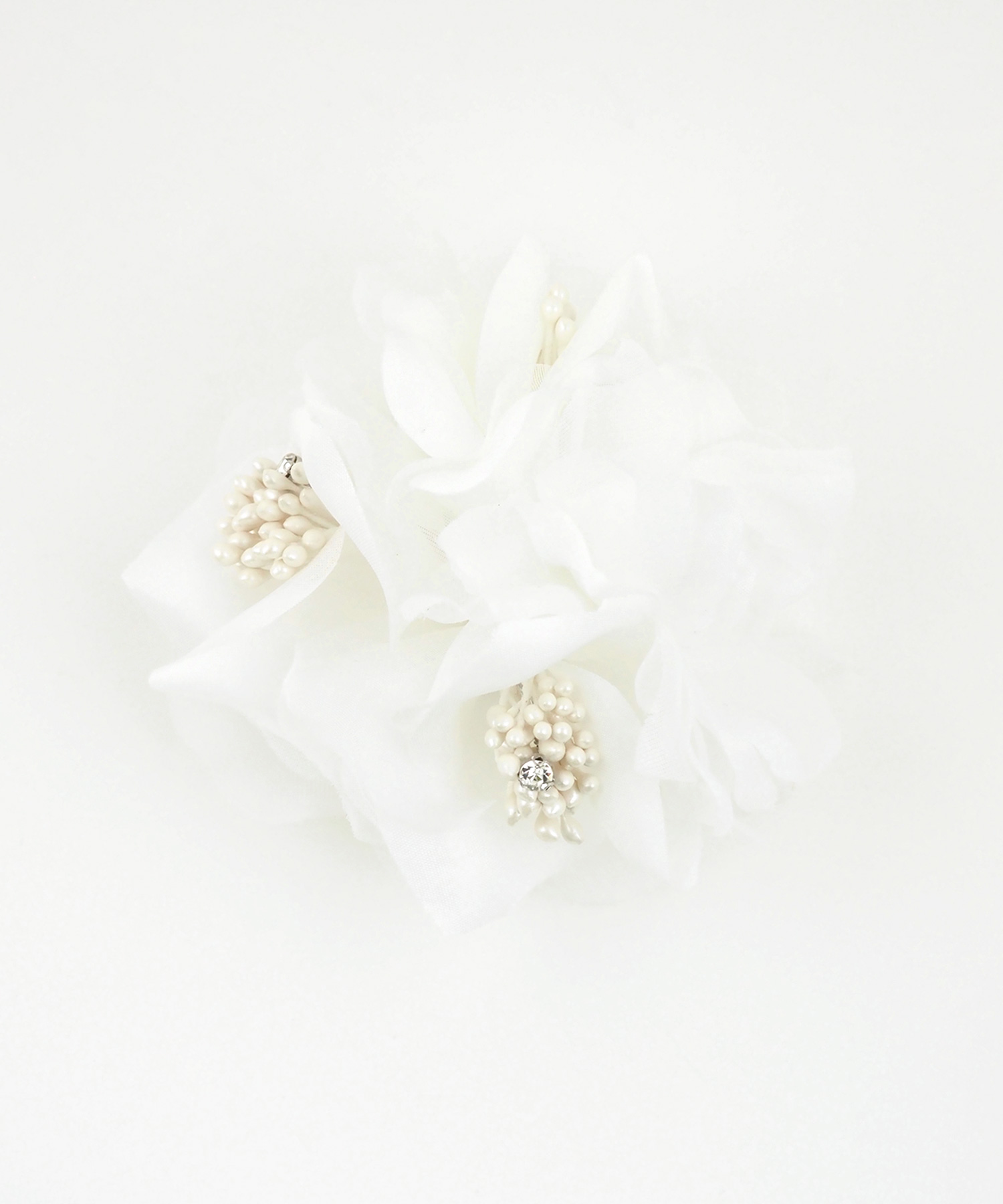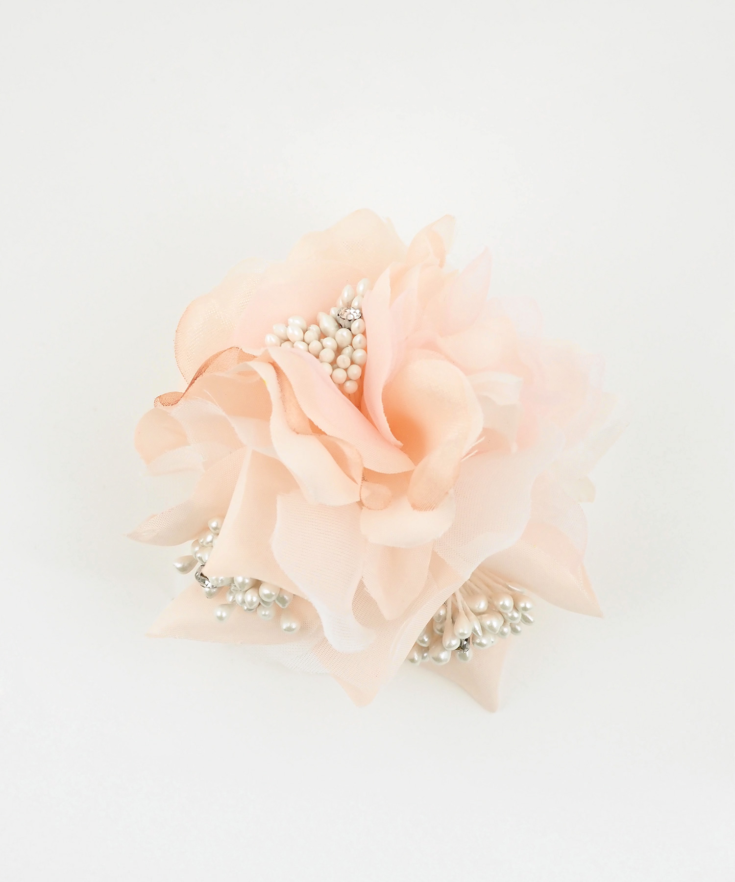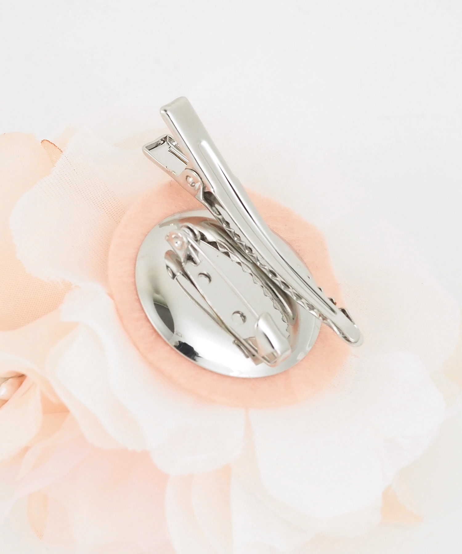 上品で華やかな雰囲気漂うフラワーコサージュ。ふんわりと軽やかなシフォン素材を幾重にも重ね、どの角度から見ても美しい、柔らかな奥行きを演出します。お顔周りを明るく彩り、特別な日の装いにふさわしい「気品」と「優美さ」を添えます。安全ピンとクリップの2way使用です。