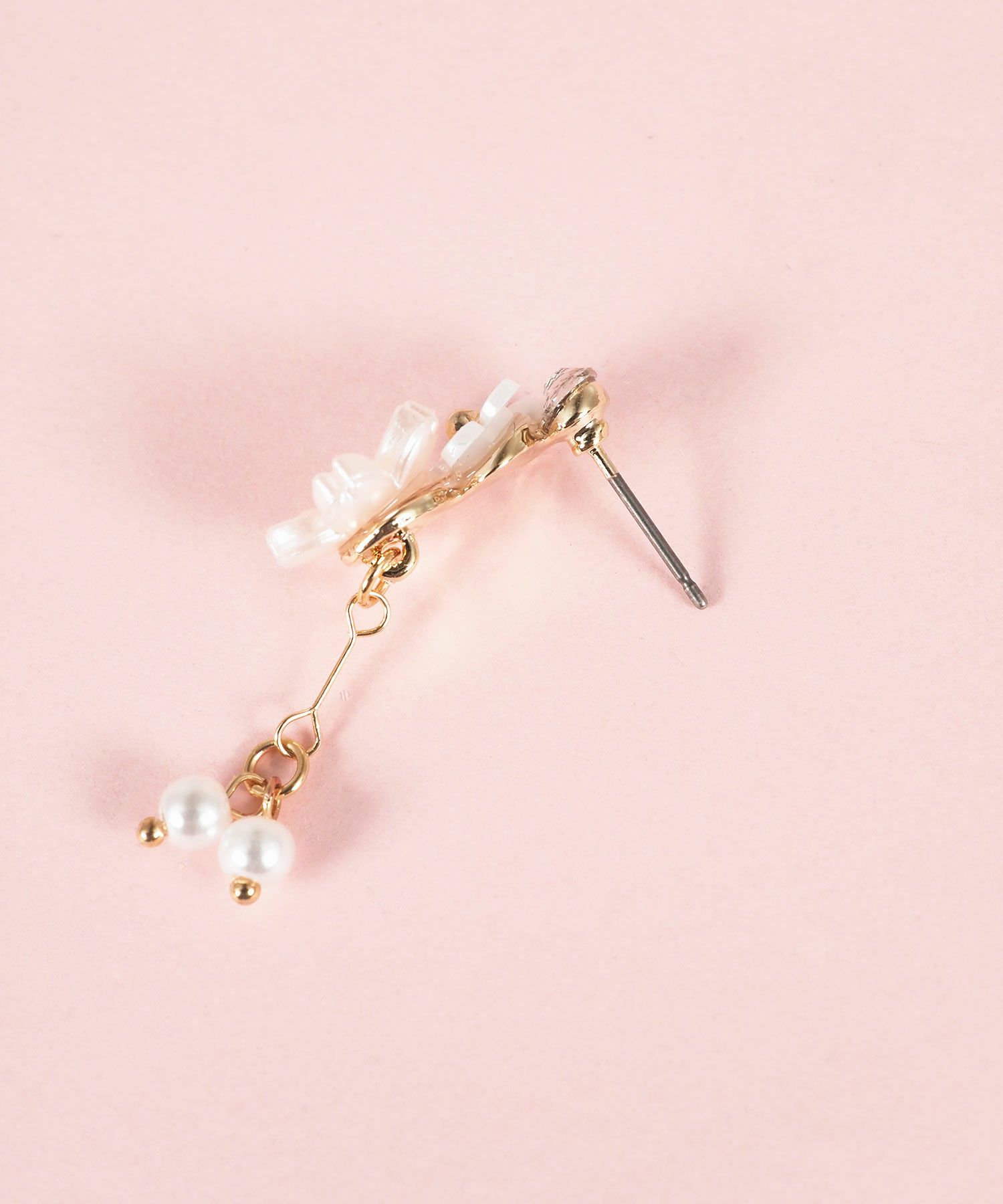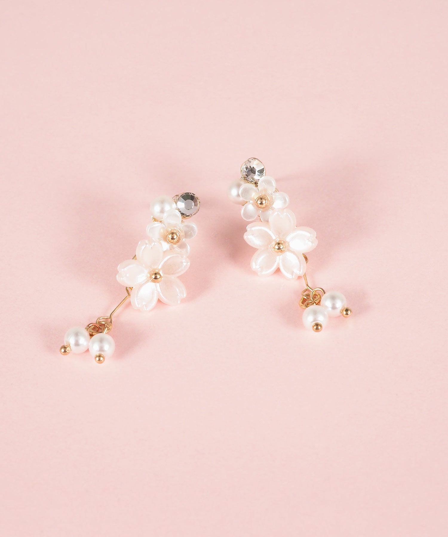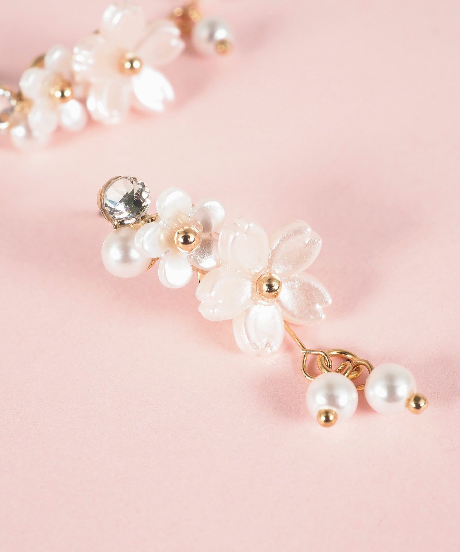 異なるトーンの桜色が織りなす、繊細で優美なデザインのピアス。満開の桜の花びらの下で、二粒の純粋なパールが上品に揺らめきます。耳元に春の訪れと華やかさを添える、特別な日の装いにも日常使いにもぴったりのアイテム。ペアピアス(両耳用)です。