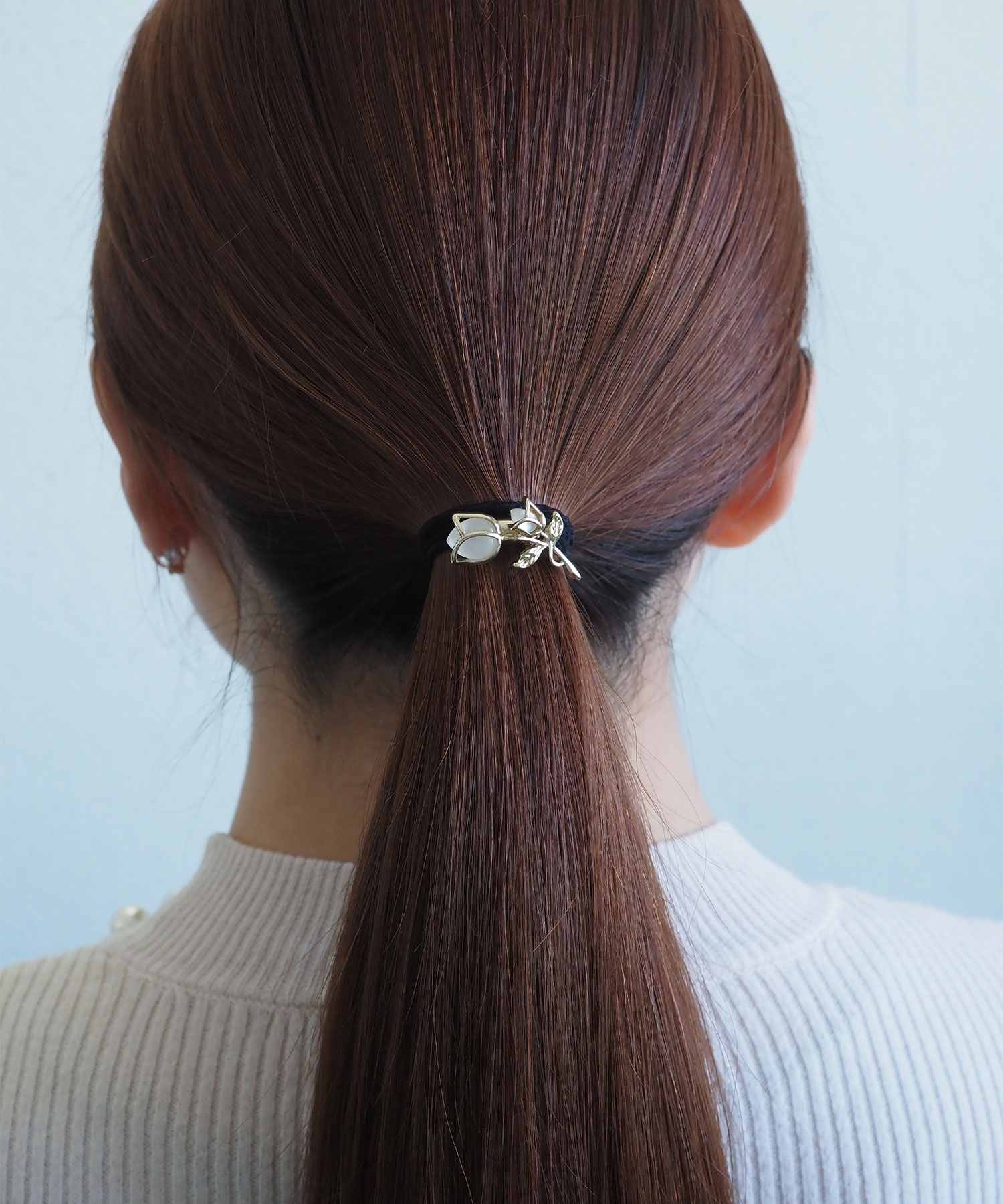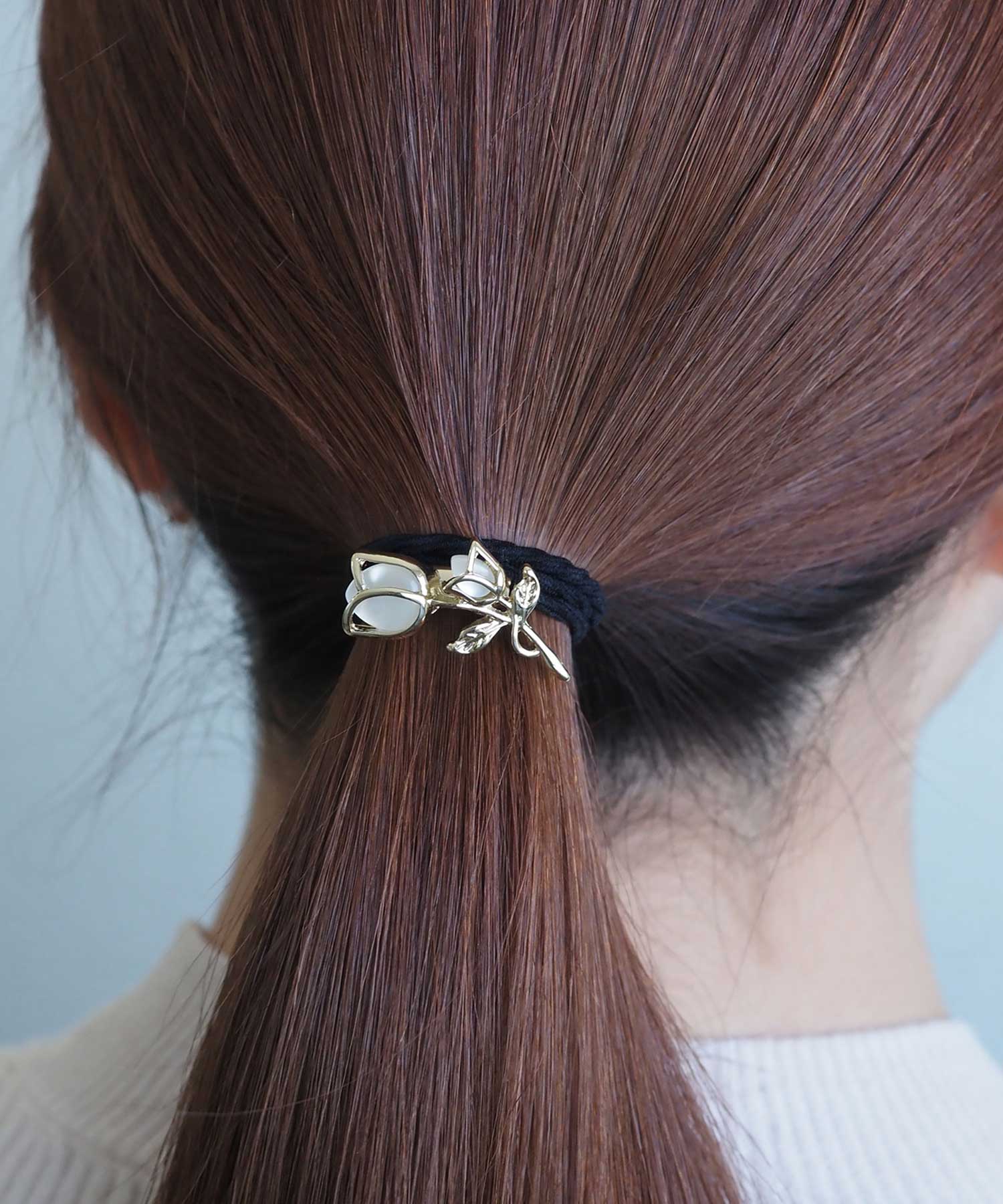大小ふたつのチューリップが寄り添うように咲く、大人可愛いヘアポニー。キャッツアイ調ストーンの艶やかな質感とゴールドのラインが、まとめ髪を上品にクラスアップしてくれます。サッと結ぶだけで、後ろ姿に可憐な華やぎと女性らしさを添えるアイテムです。