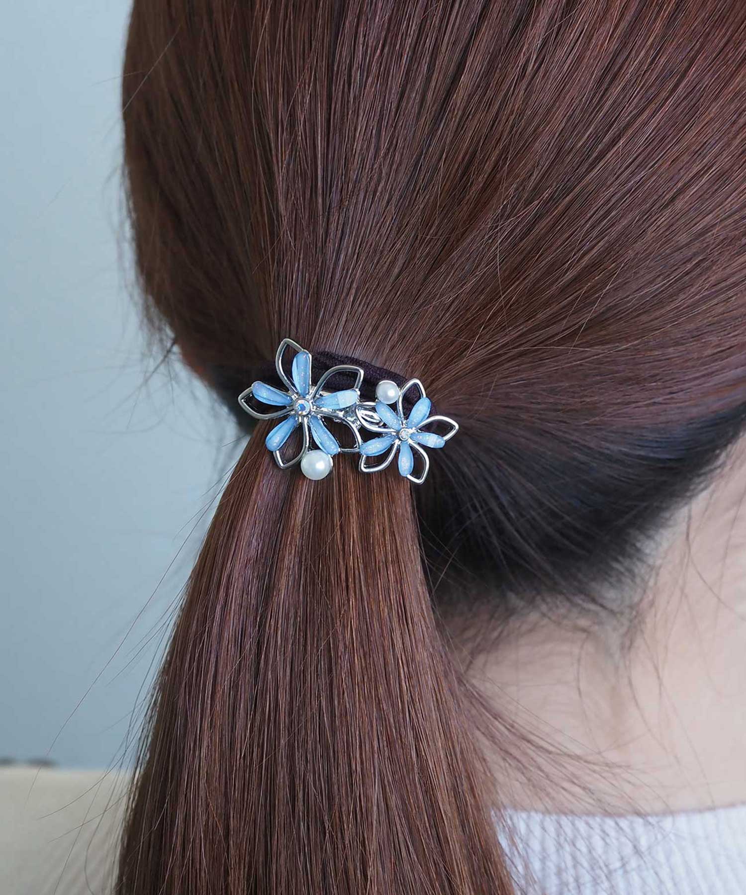 大小ふたつのフラワーモチーフを贅沢にあしらった、大人可愛いヘアポニー。 透明感のある花びらに、上品なパールとビジューを添えた奥行きのあるデザインが魅力です。サッと結ぶだけで、いつものヘアスタイルを華やかにクラスアップしてくれます。