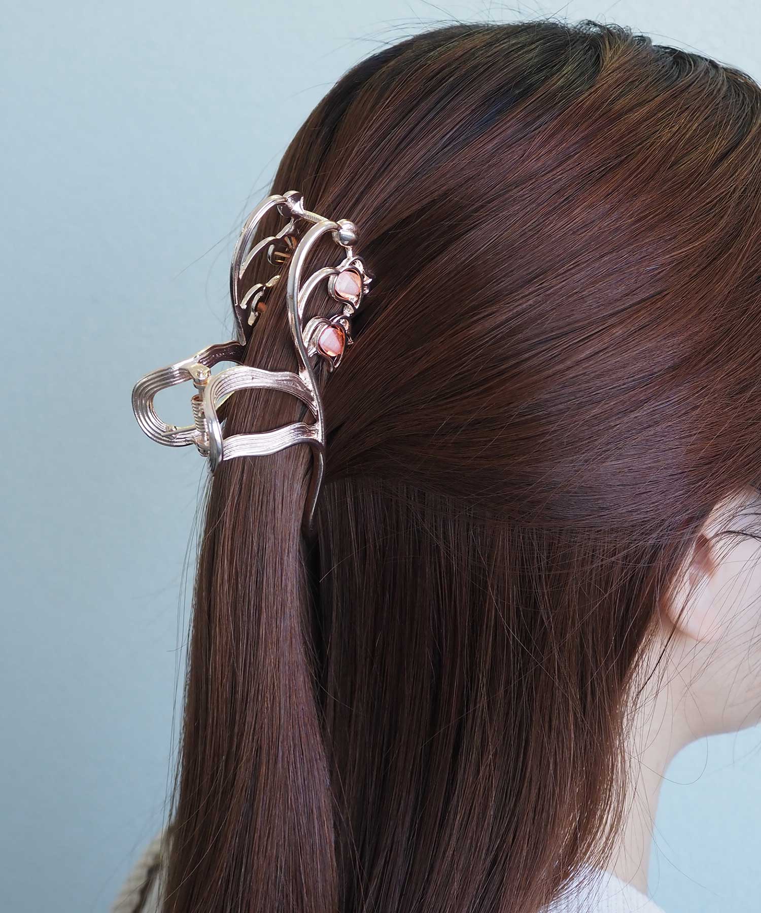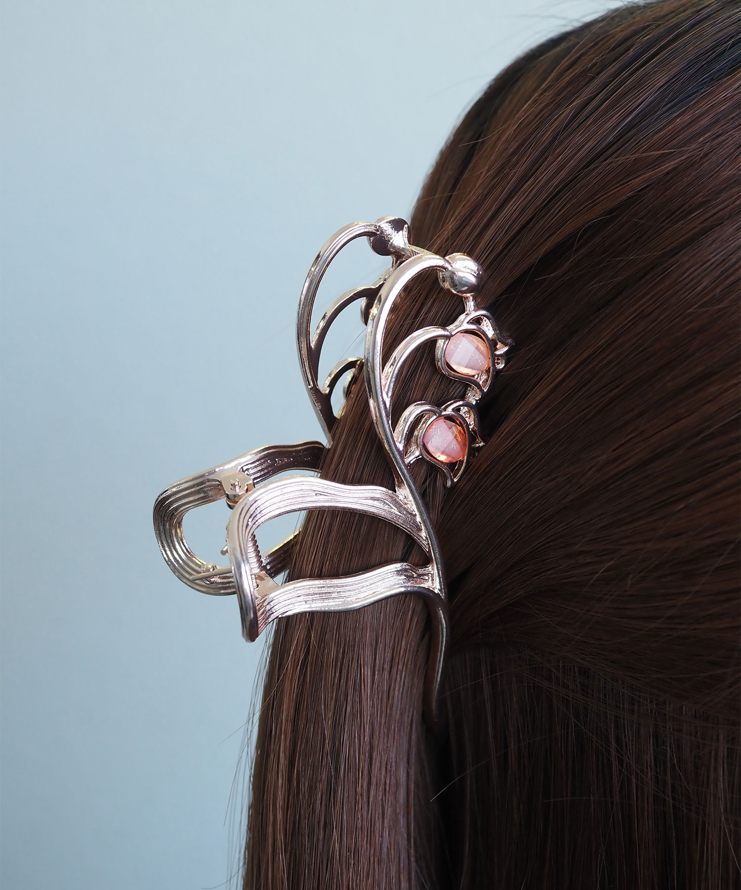 ふわりと花ひらくスズランをモチーフにした、大人フェミニンなバンスクリップ。 艶やかなメタルラインとほんのり透ける花びらの質感が、バックスタイルを上品で優雅な印象に。しっかり留まるホールド力で、忙しい朝もサッと挟むだけでお洒落なまとめ髪が完成します。
