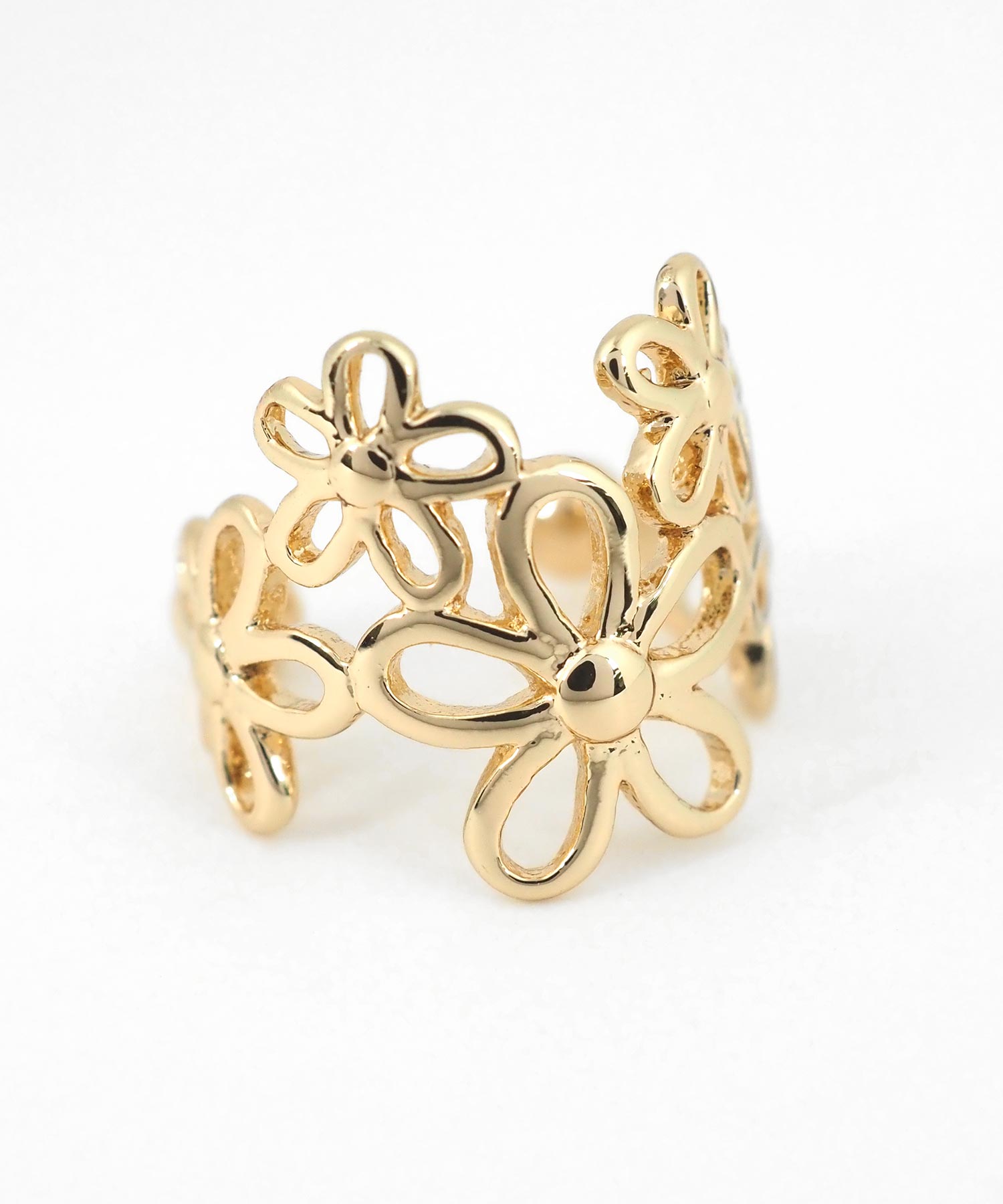 細身のフレームで形作られたお花たちが耳元に並ぶ、フェミニンなイヤーカフ。どんなスタイルにも合わせやすく、お手持ちのピアスやイヤリングとの重ね付けもおすすめ。日常のオシャレをさりげなくランクアップさせてくれる、頼れる一点です。ピアスの穴の有無に関わらず楽しめ、コーデ不要でおしゃれが叶います。片耳用です。