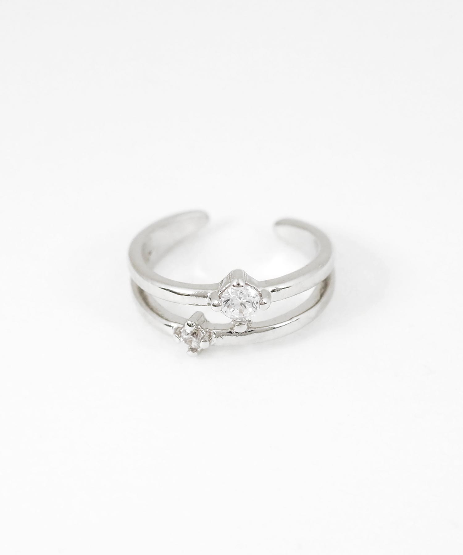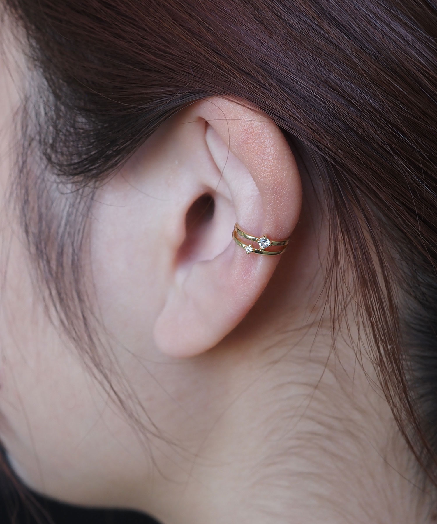 耳元に寄り添うように配置された、繊細な2粒のストーンが煌めくイヤーカフ。ミニマルなデザインで、どんなスタイルにも合わせやすく、お手持ちのピアスやイヤリングとの重ね付けもおすすめ。日常のオシャレをさりげなくランクアップさせてくれる、頼れる一点です。ピアスの穴の有無に関わらず楽しめ、コーデ不要でおしゃれが叶います。片耳用です。