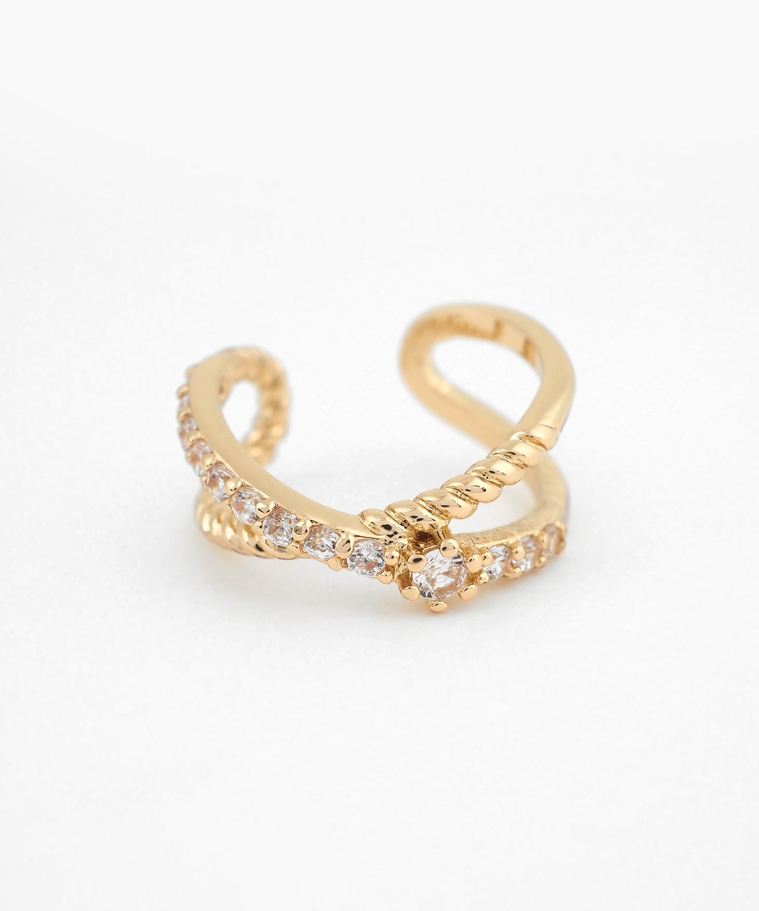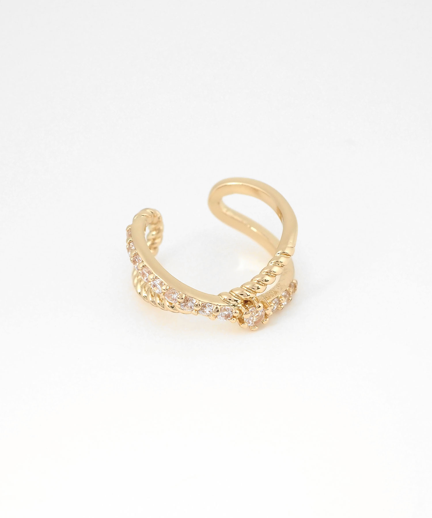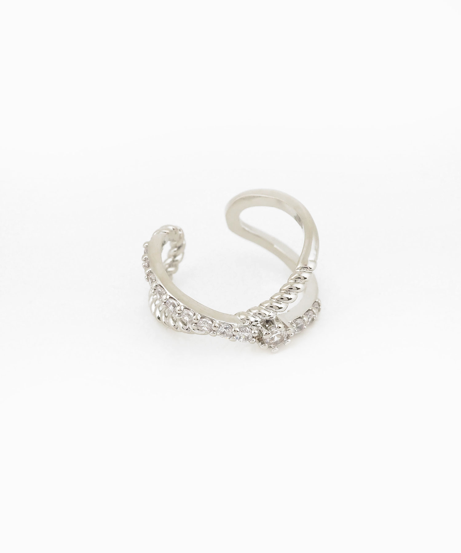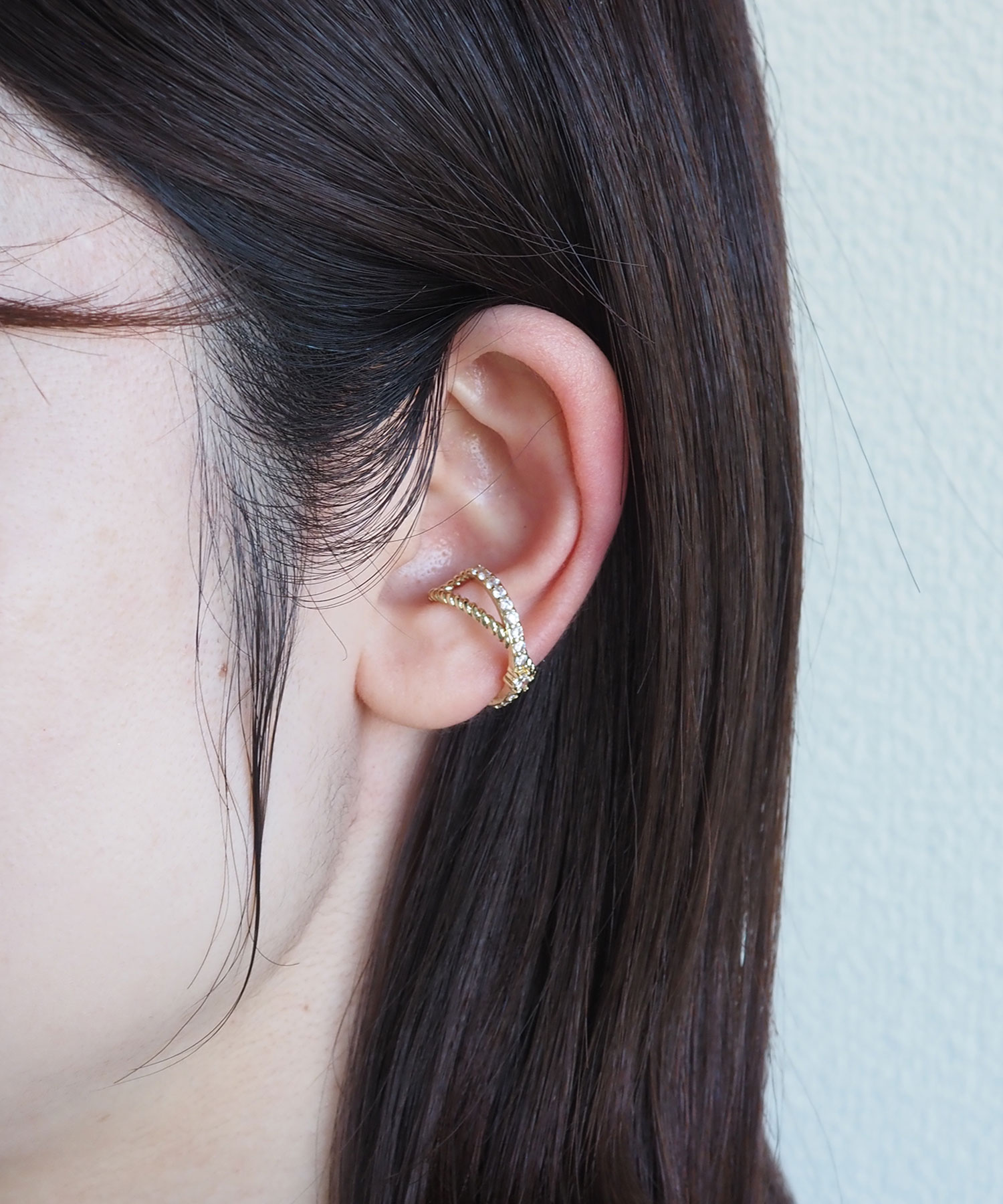 贅沢なエタニティラインと繊細なネジリラインが交差し、その中心に凛とした一粒のストーンを添えた、華やかなイヤーカフ。どんなスタイルにも合わせやすく、お手持ちのピアスやイヤリングとの重ね付けもおすすめ。日常のオシャレをさりげなくランクアップさせてくれる、頼れる一点です。ピアスの穴の有無に関わらず楽しめ、コーデ不要でおしゃれが叶います。片耳用です。