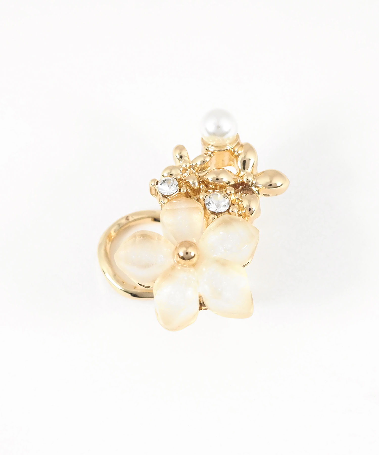 小さなお花が美しく並ぶ華やかなイヤーカフ。繊細に施された花々のモチーフが、お顔周りにさりげない品格を添え、多幸感あふれる印象に変えてくれるます。お手持ちのピアスやイヤリングとの重ね付けもおすすめ。日常のオシャレをさりげなくランクアップさせてくれる、頼れる一点です。ピアスの穴の有無に関わらず楽しめ、コーデ不要でおしゃれが叶います。片耳用です。