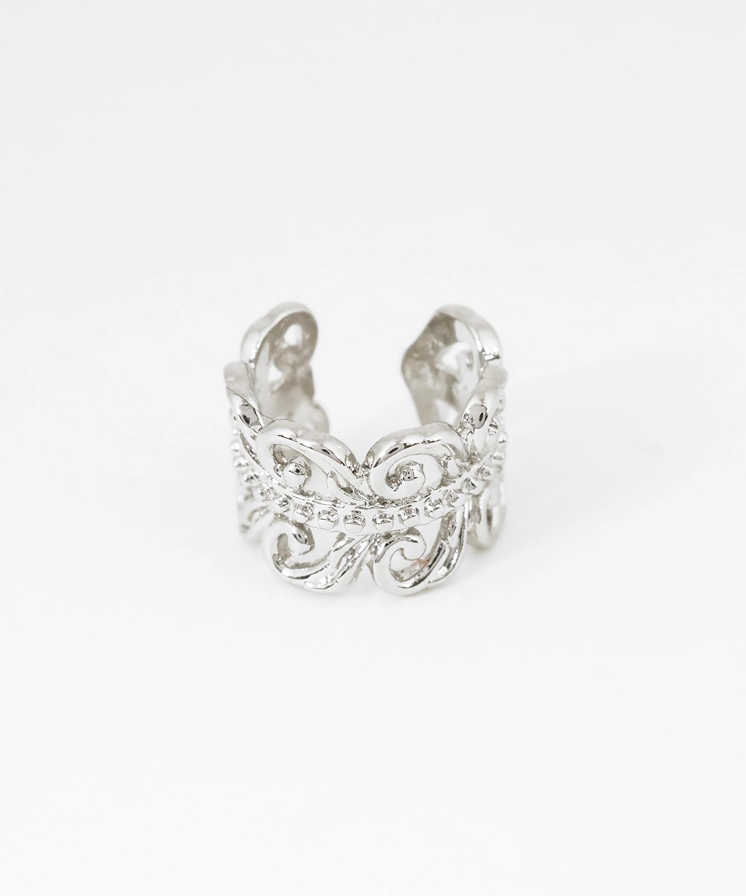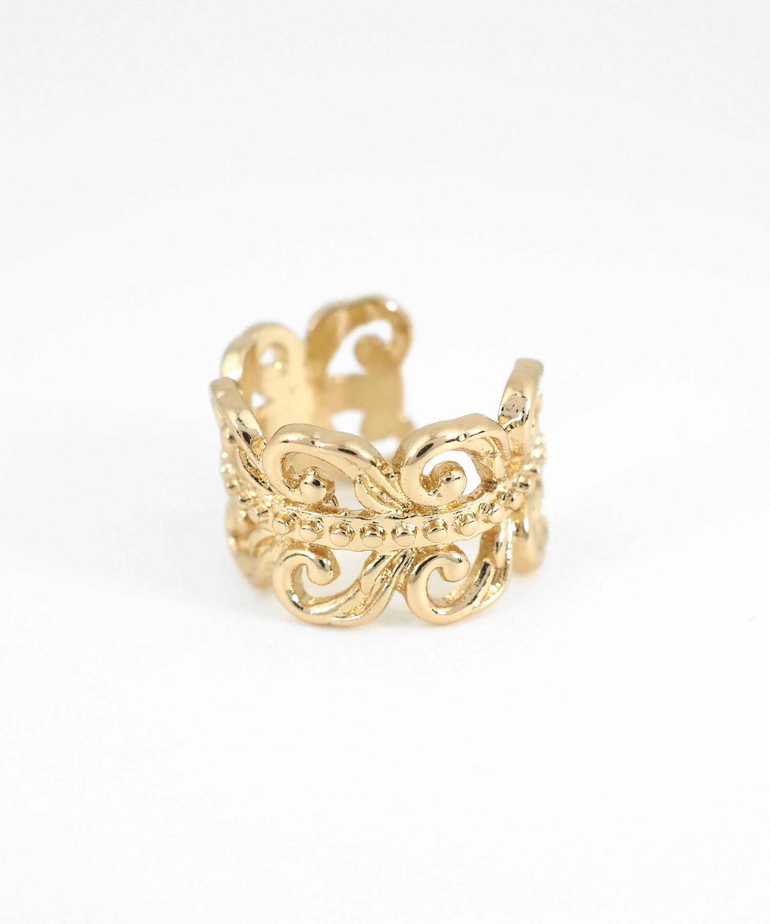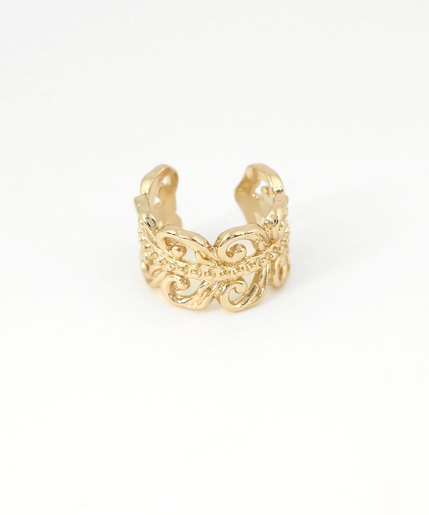 繊細に施されたモチーフが、お顔周りにさりげない品格を添えてくれるイヤーカフ。どんなスタイルにも合わせやすく、お手持ちのピアスやイヤリングとの重ね付けもおすすめ。日常のオシャレをさりげなくランクアップさせてくれる、頼れる一点です。ピアスの穴の有無に関わらず楽しめ、コーデ不要でおしゃれが叶います。片耳用です。