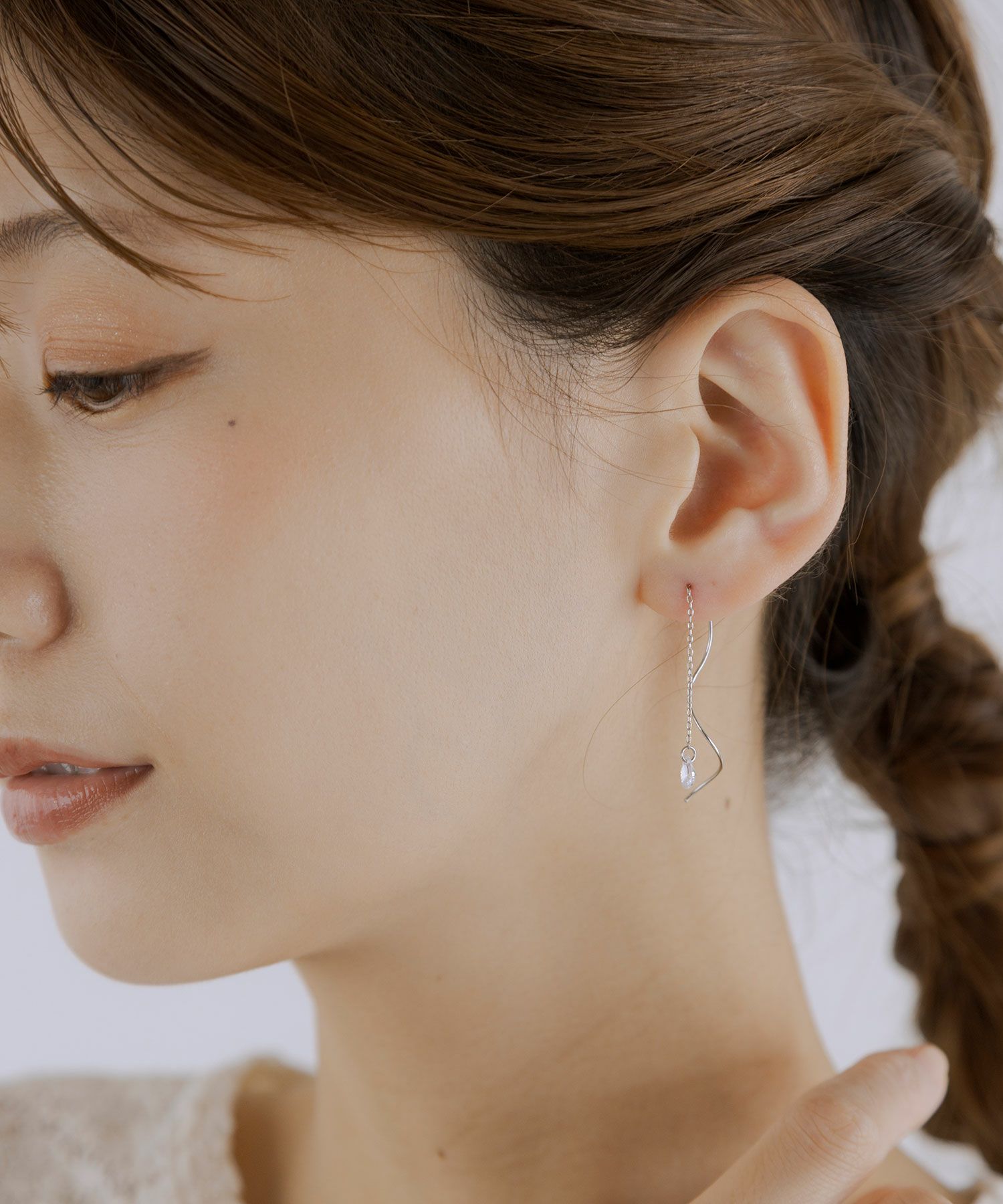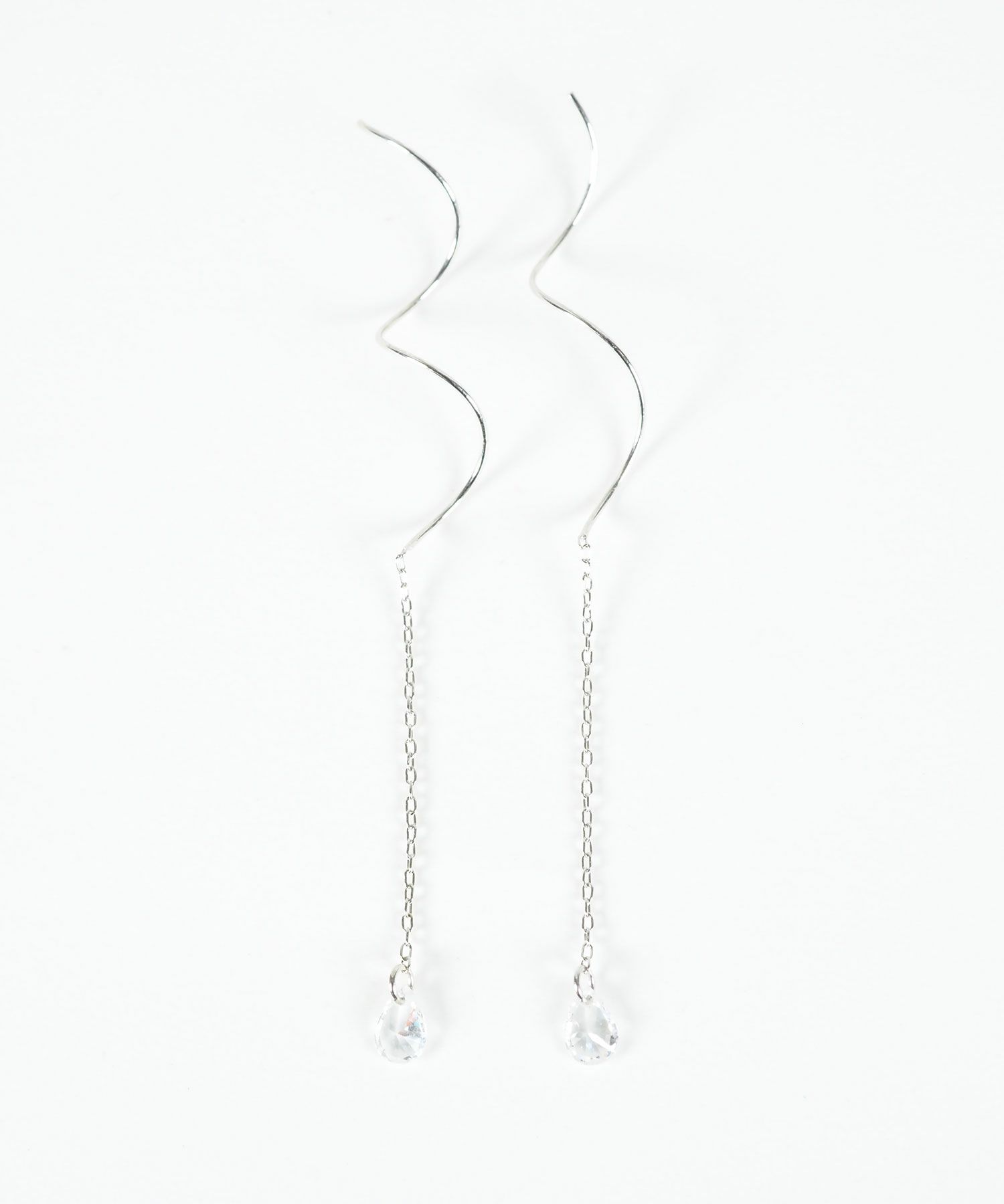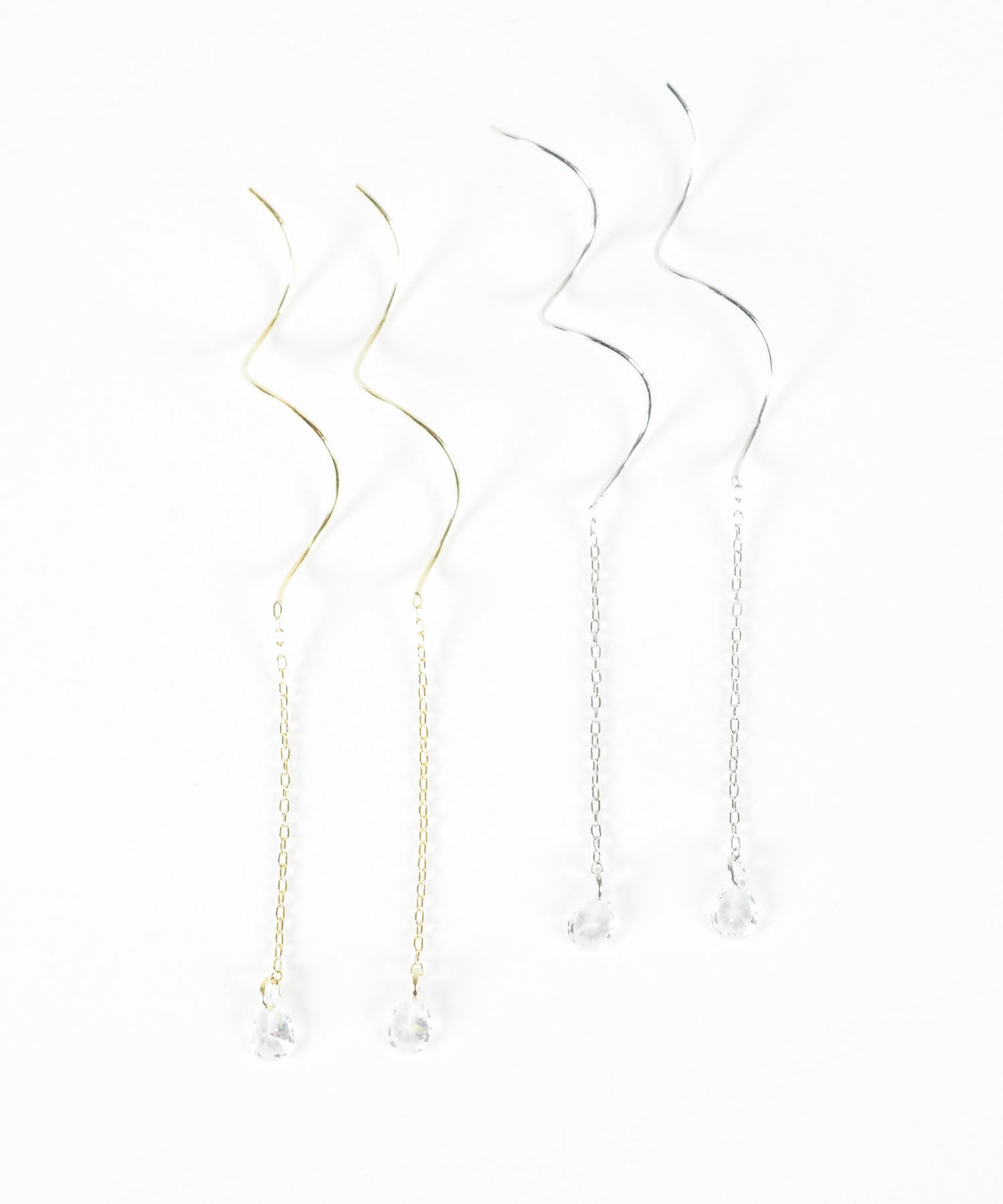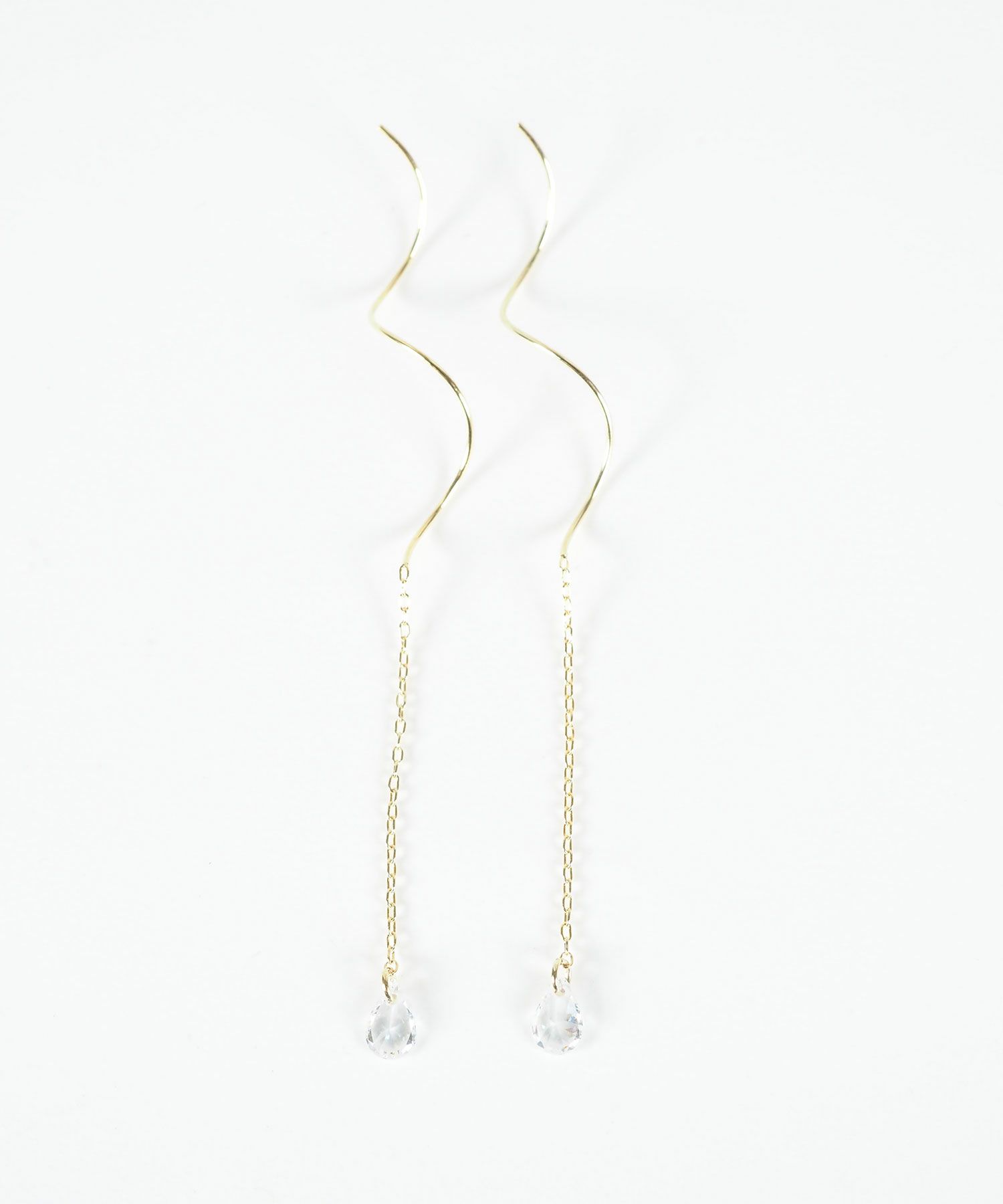 繊細なウェーブラインにきらりと輝くドロップモチーフを添えたアメリカンピアス。動くたびに柔らかな曲線が光を受け、女性らしいエレガントさを演出します。軽やかな着け心地で、長時間つけていてもストレスフリーです。デイリーからパーティーシーンまで幅広く活躍します。ペアピアス(両耳用)です。