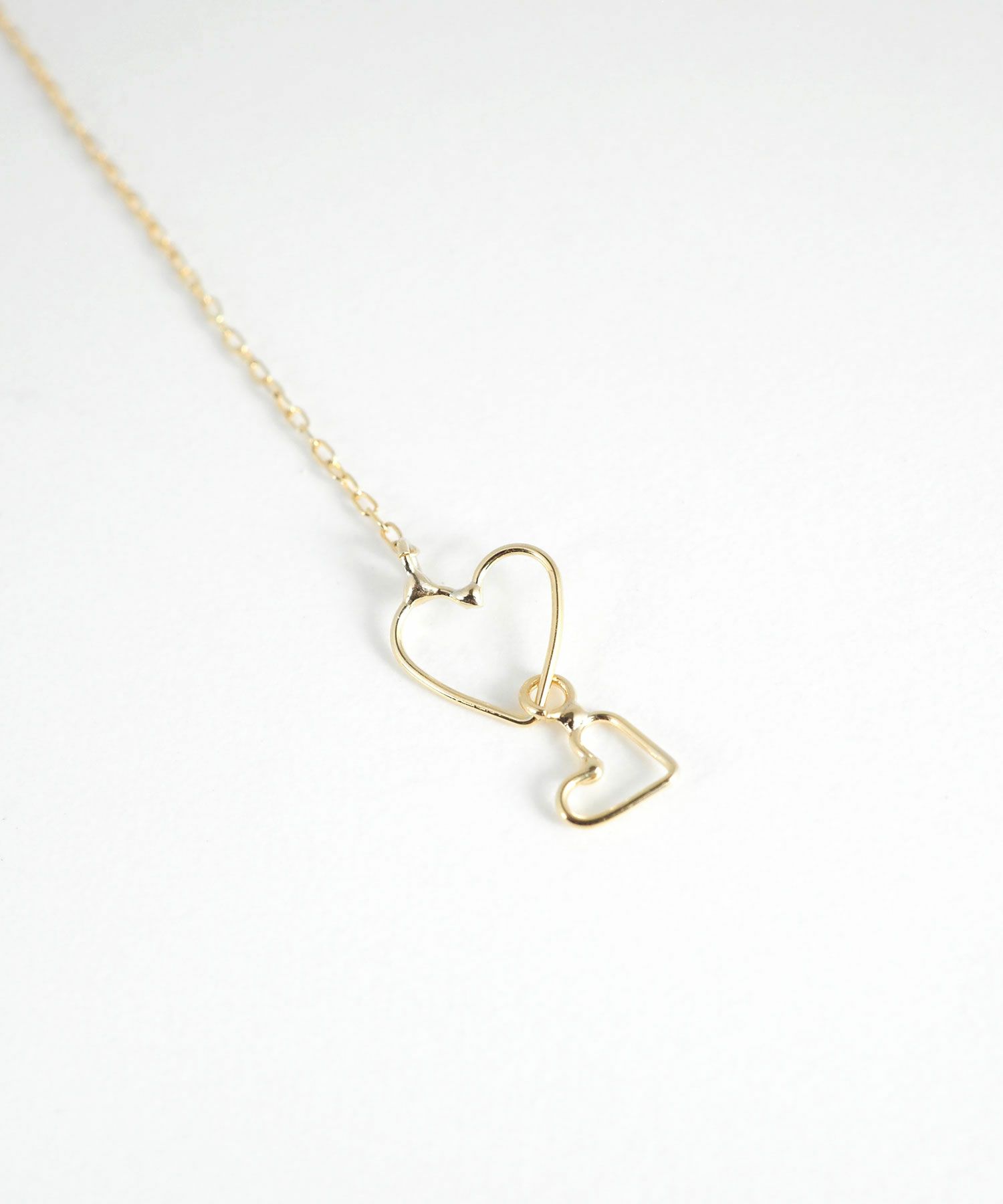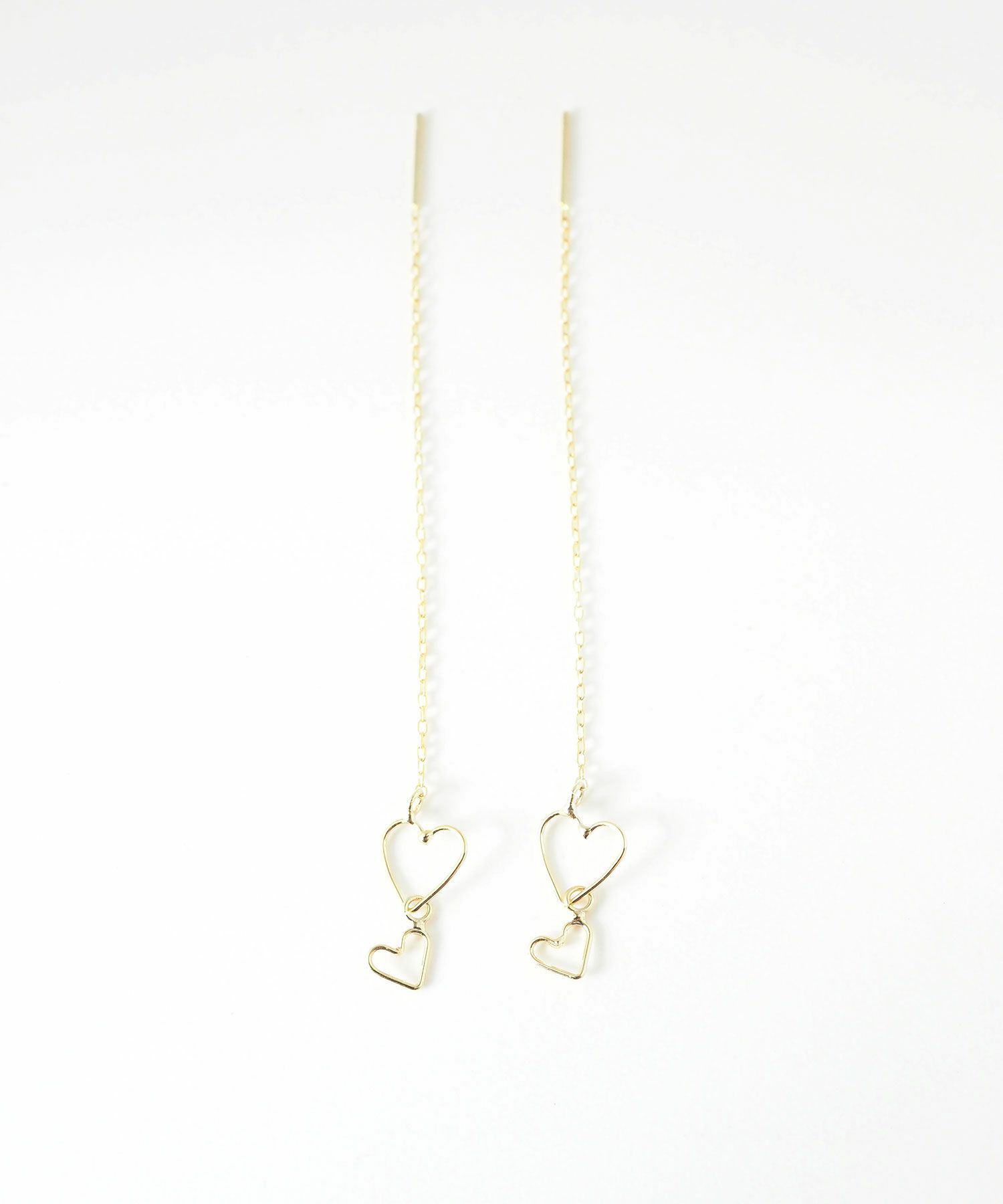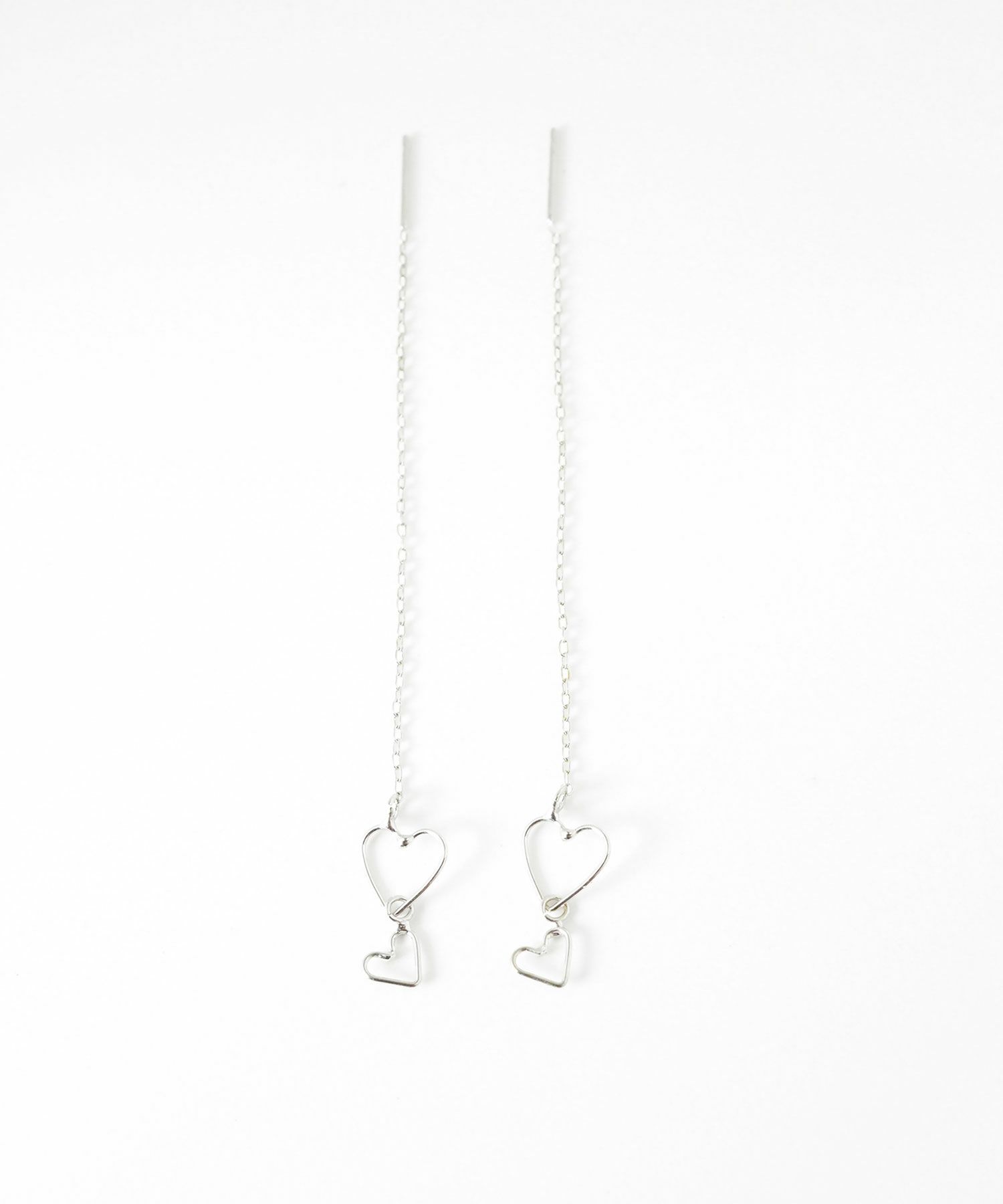 大小2つのハートフレームが連なり、耳元で愛らしく揺れるアメリカンピアスです。フェミニンなモチーフながら、華奢なフレームデザインが甘くなりすぎず、大人の可愛らしさを引き立てます。デートやお出かけなど、特別なシーンにもおすすめです。ペアピアス(両耳用)です。