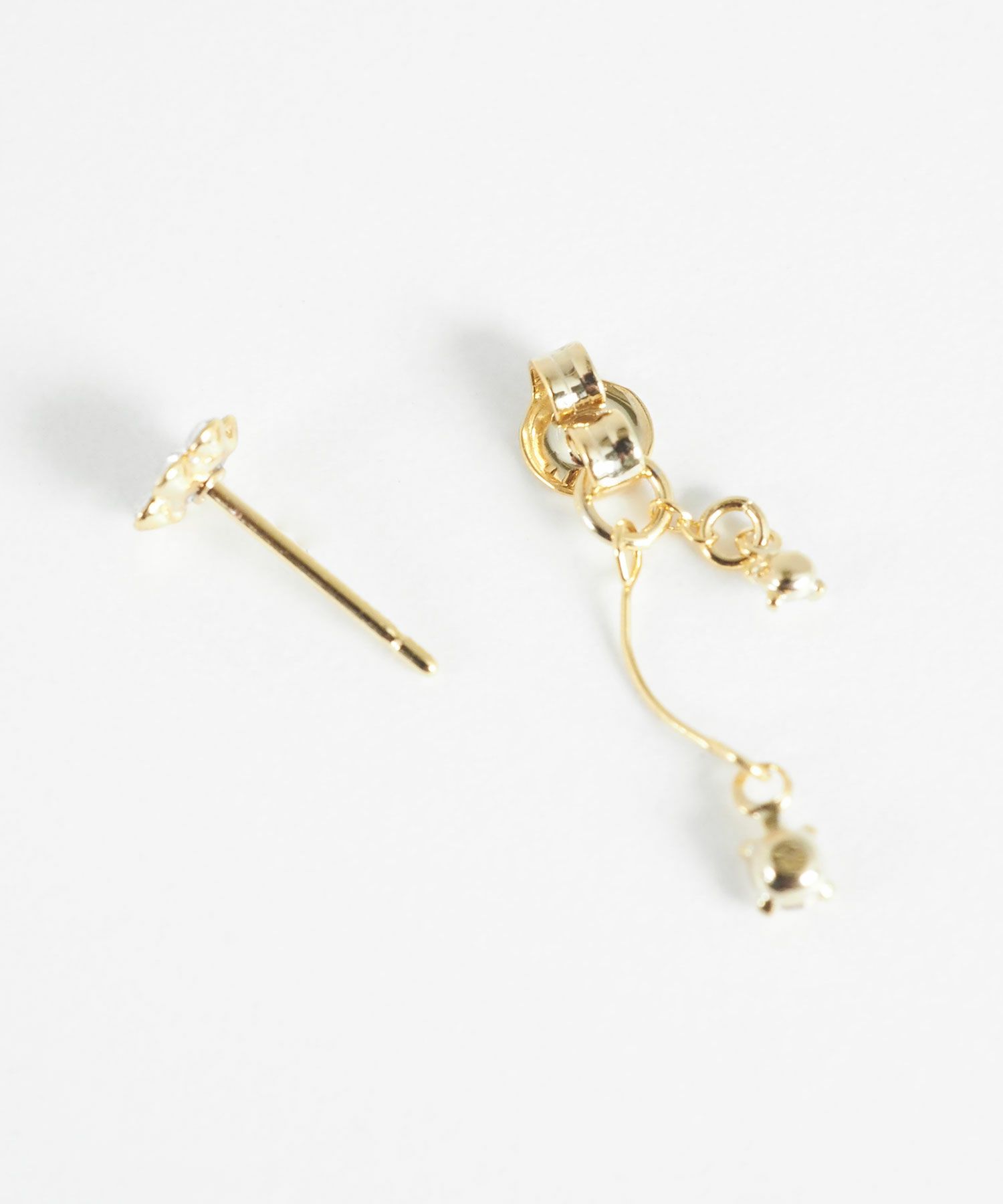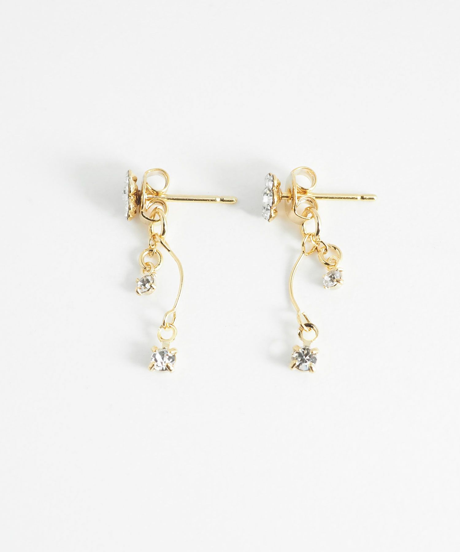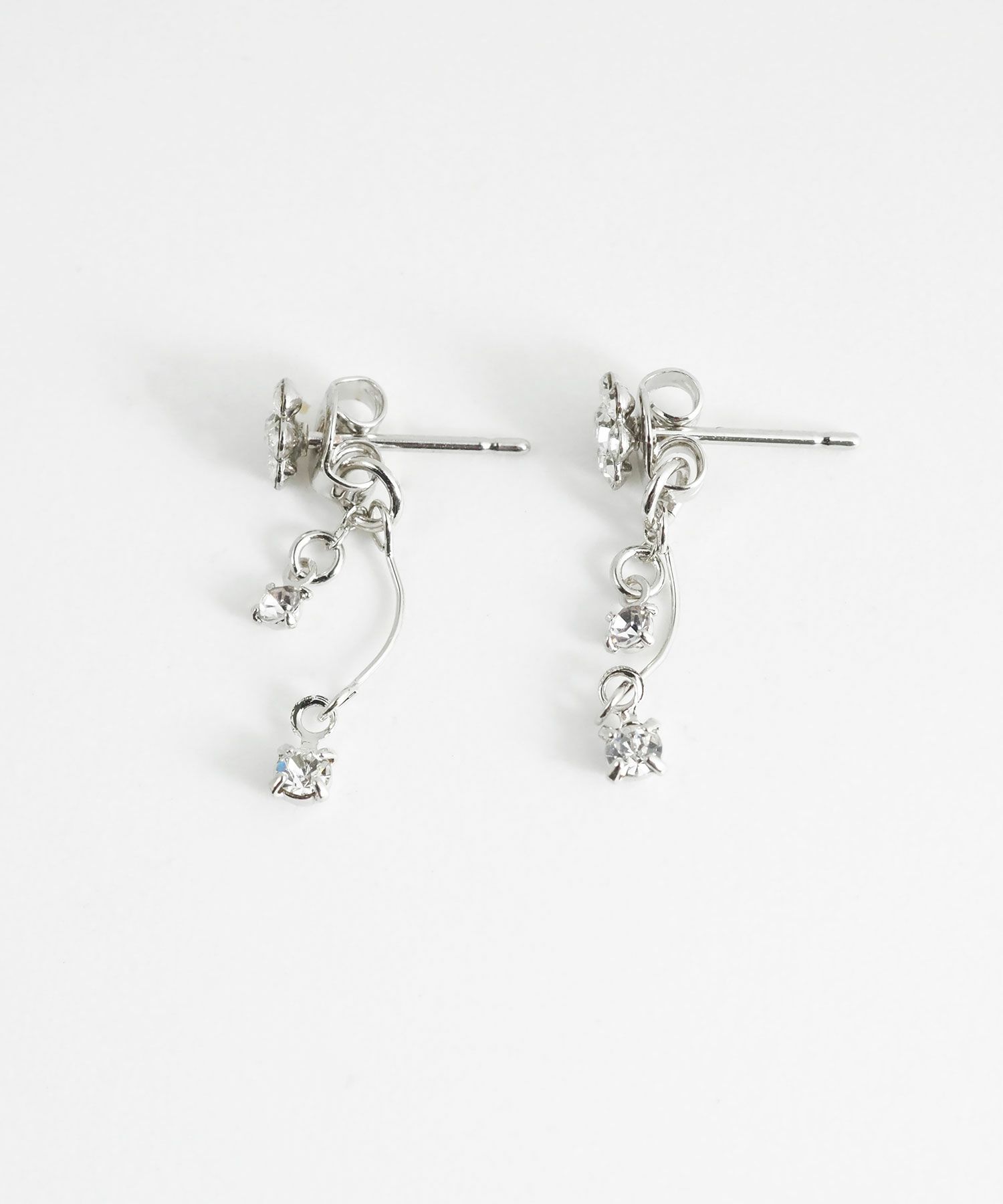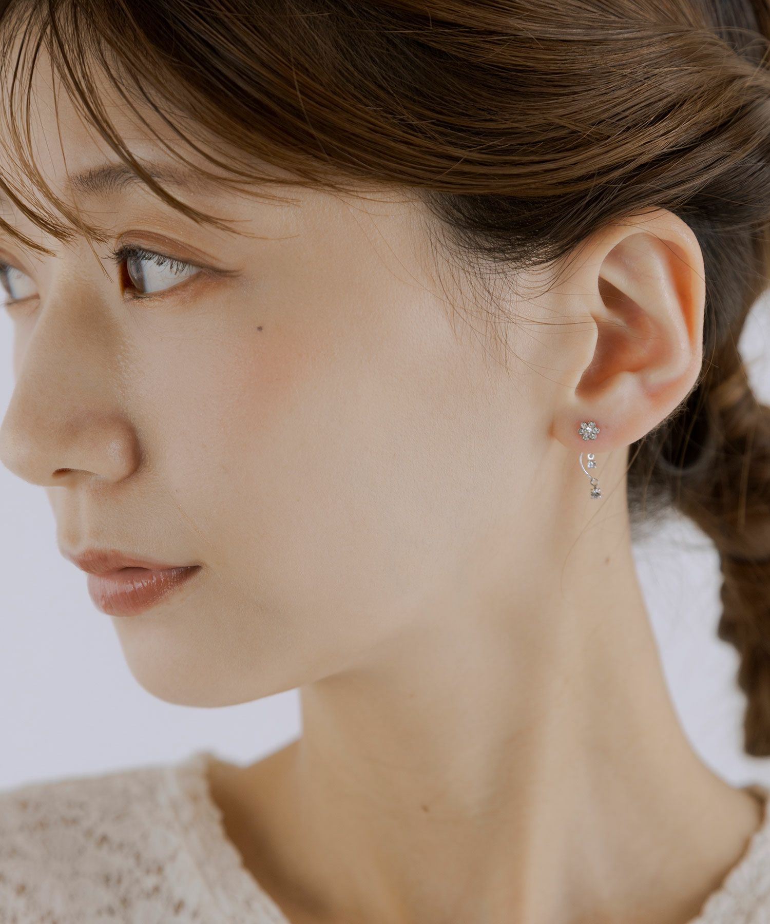 耳元を可憐に彩るフラワービジューのピアスと、耳の後ろから煌めくビジューキャッチのセット。華奢な上品さと可愛らしさを兼ね備えた、正面から見ても、横から見ても美しいデザインです。ペアピアス(両耳用)です。