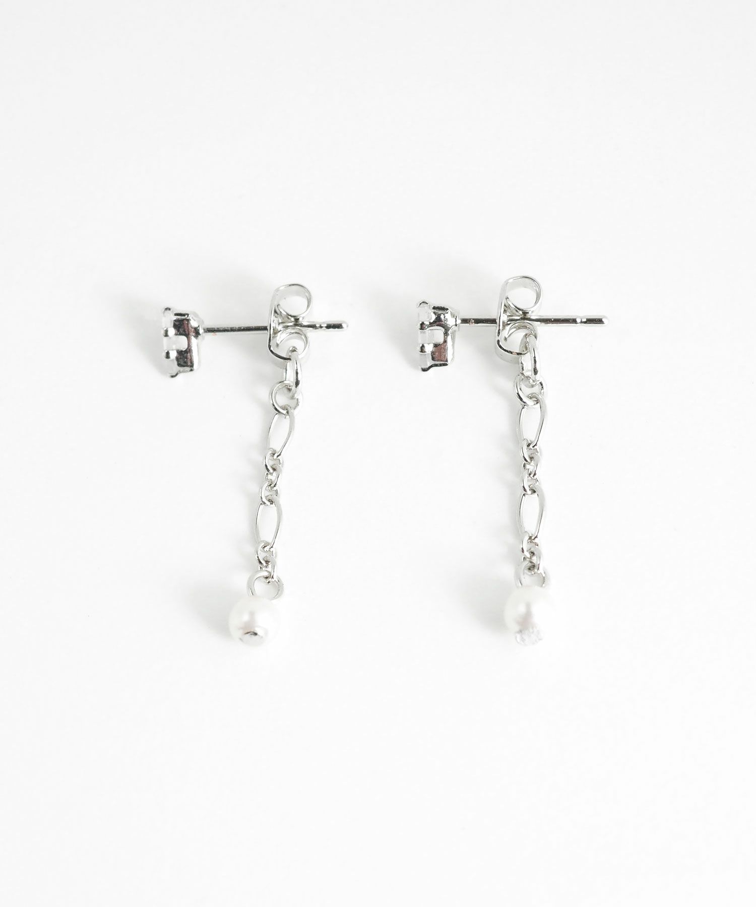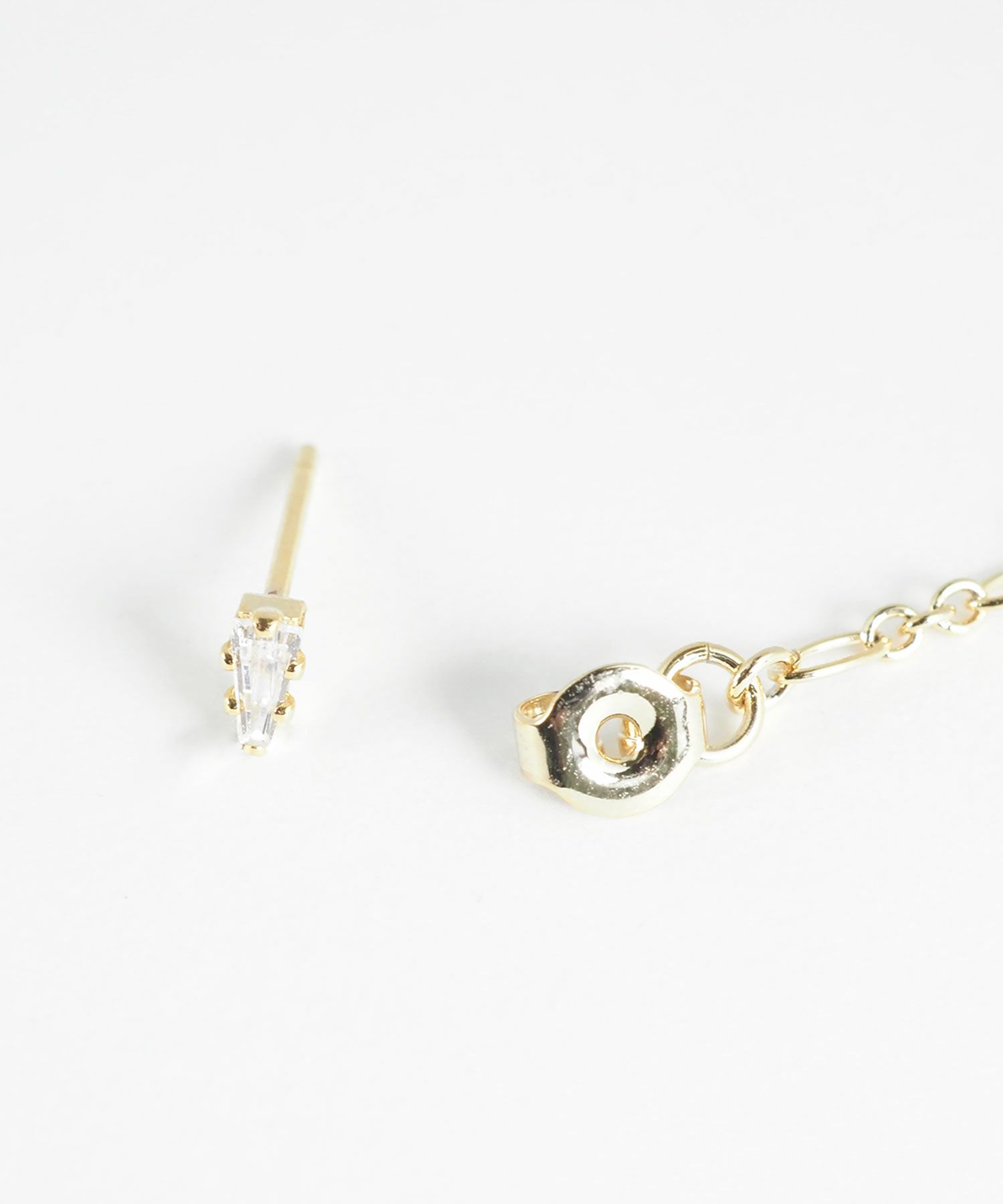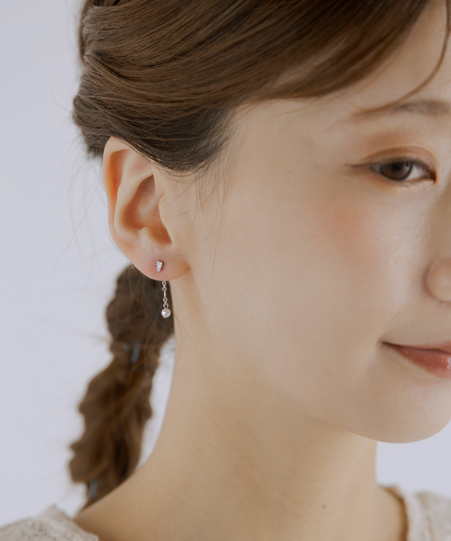 シャープな輝きを放つキュービックジルコニアのトライアングルピアスと、耳の後ろから優しく光るパールキャッチのセット。正面から見るとシャープなきらめきが、横から見るとパールがさりげなく顔をのぞかせ、どの角度から見ても魅力的な耳元を演出します。ペアピアス(両耳用)です。
