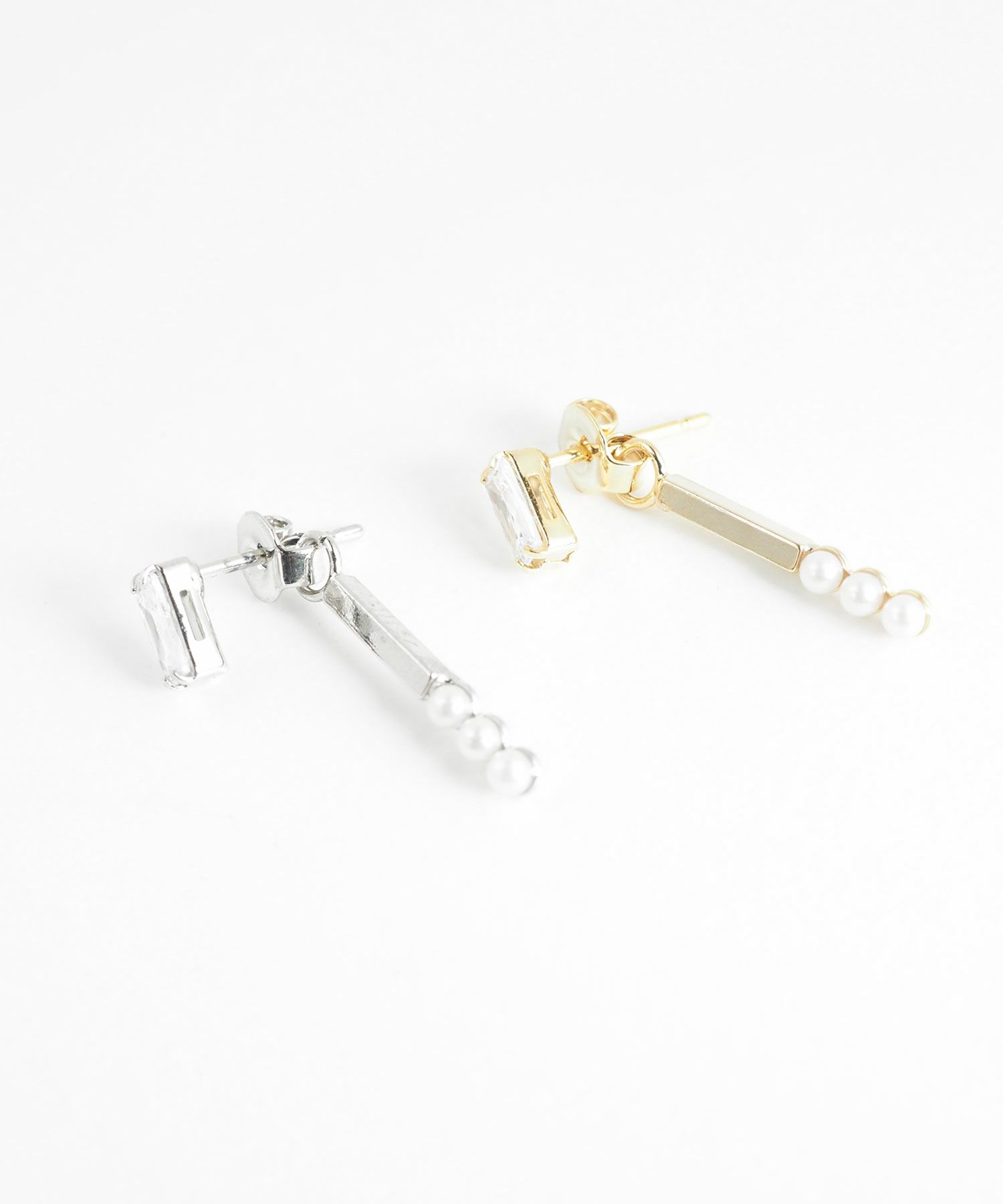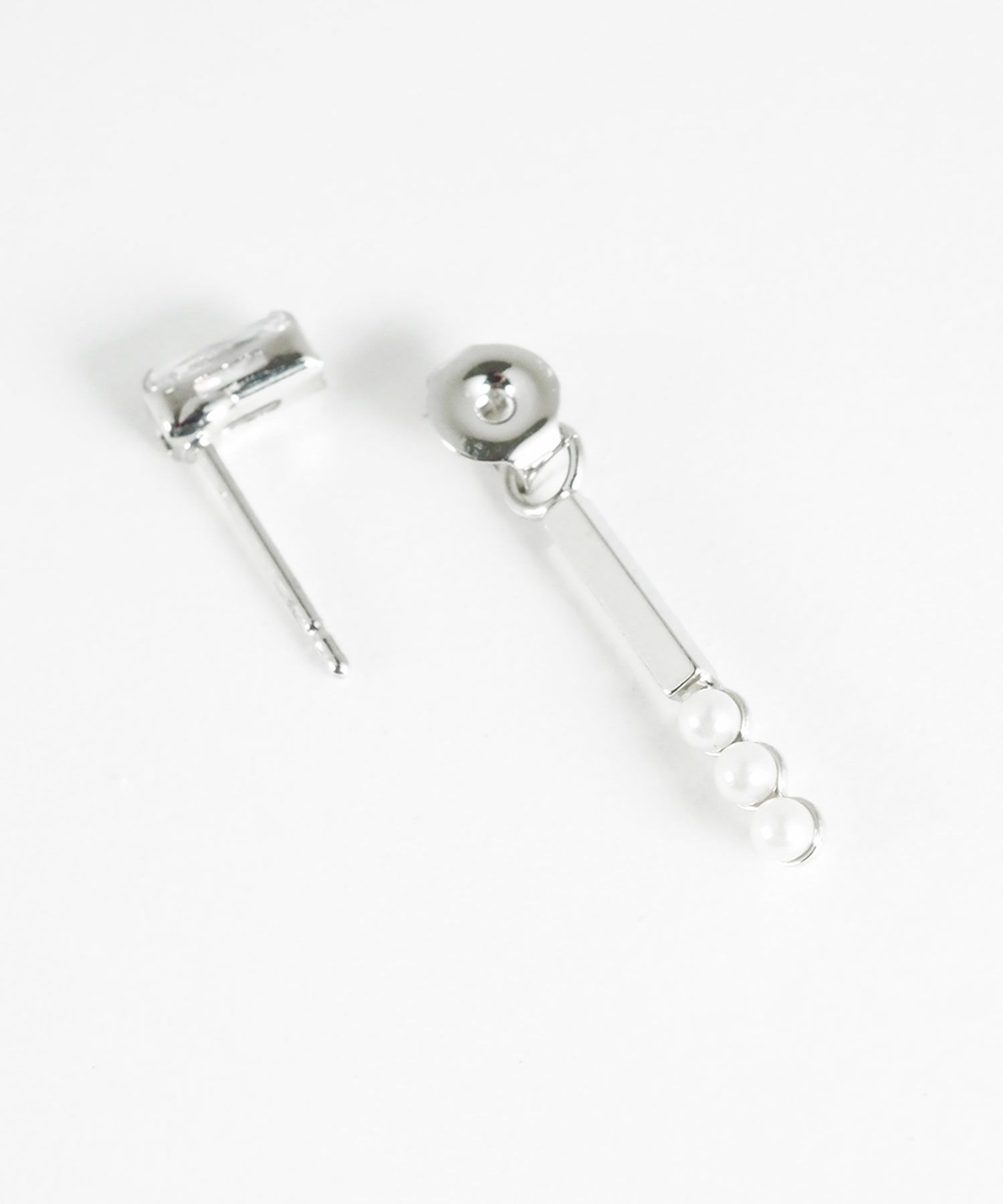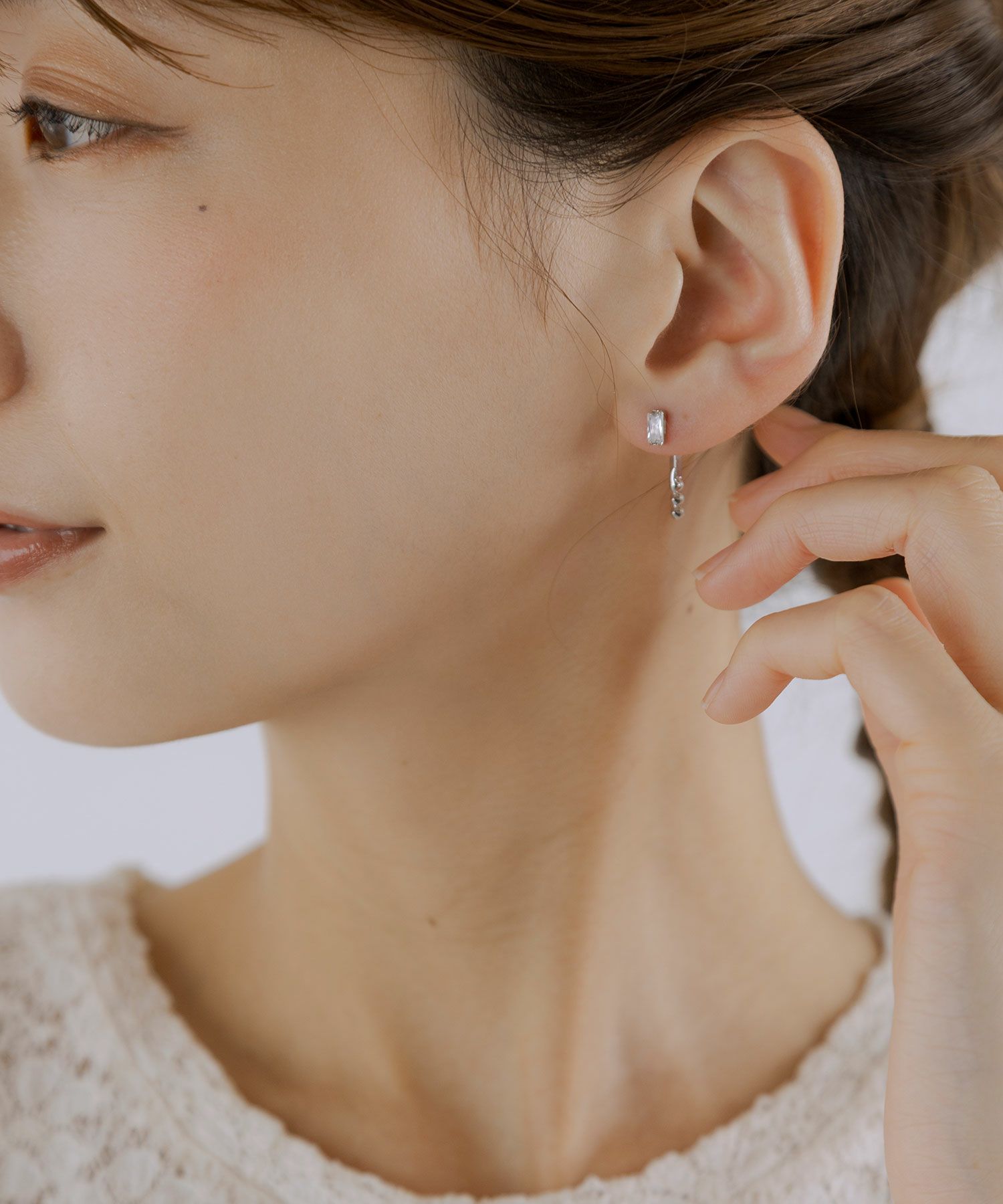 耳元にシャープな輝きを放つレクタングルカットのストーンと、耳の後ろには上品に煌めくバーパールをあしらったセット。異なる質感のバランスが、洗練された大人の横顔を演出します。360度どこからみても美しいピアスです。ペアピアス(両耳用)です。