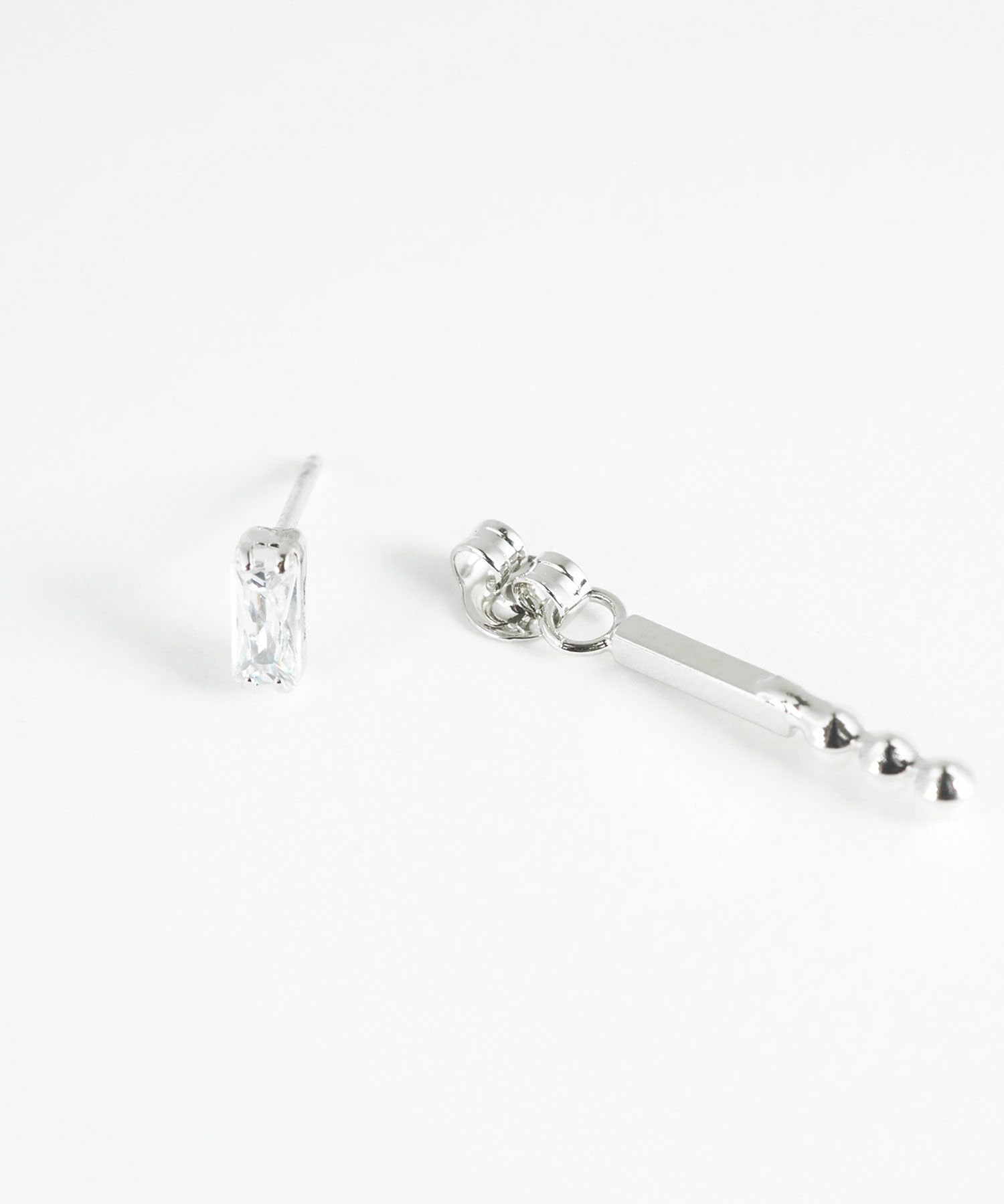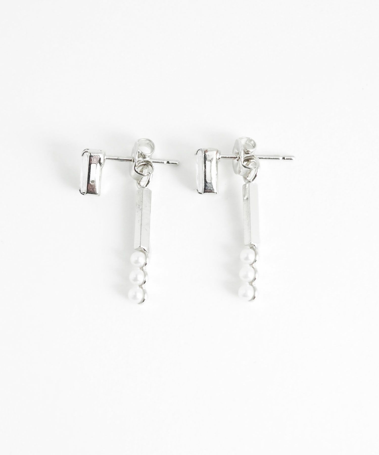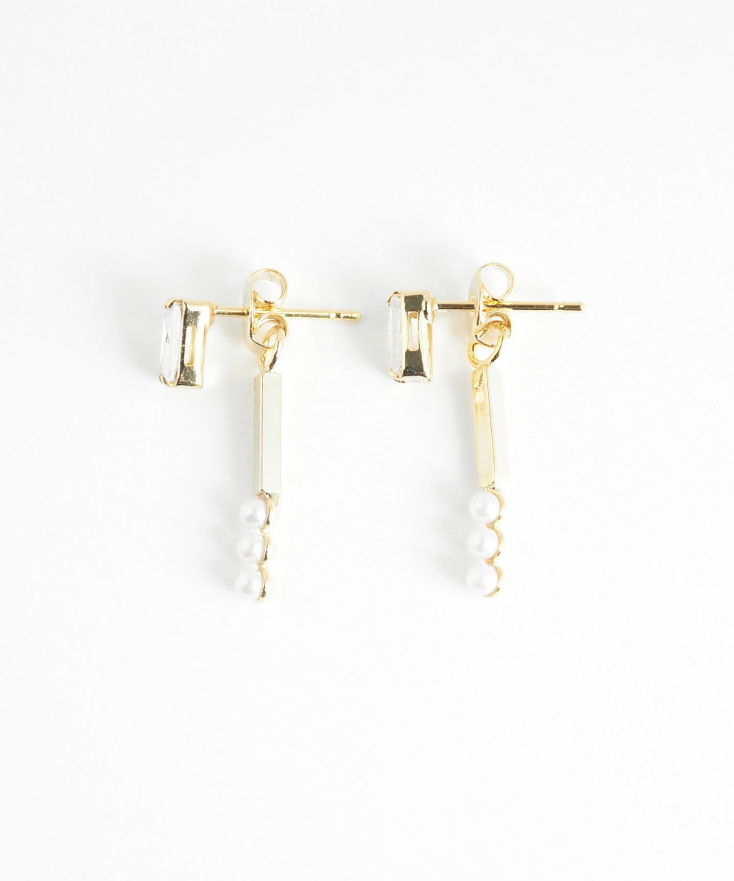 耳元にシャープな輝きを放つレクタングルカットのストーンと、耳の後ろには上品に煌めくバーパールをあしらったセット。異なる質感のバランスが、洗練された大人の横顔を演出します。360度どこからみても美しいピアスです。ペアピアス(両耳用)です。